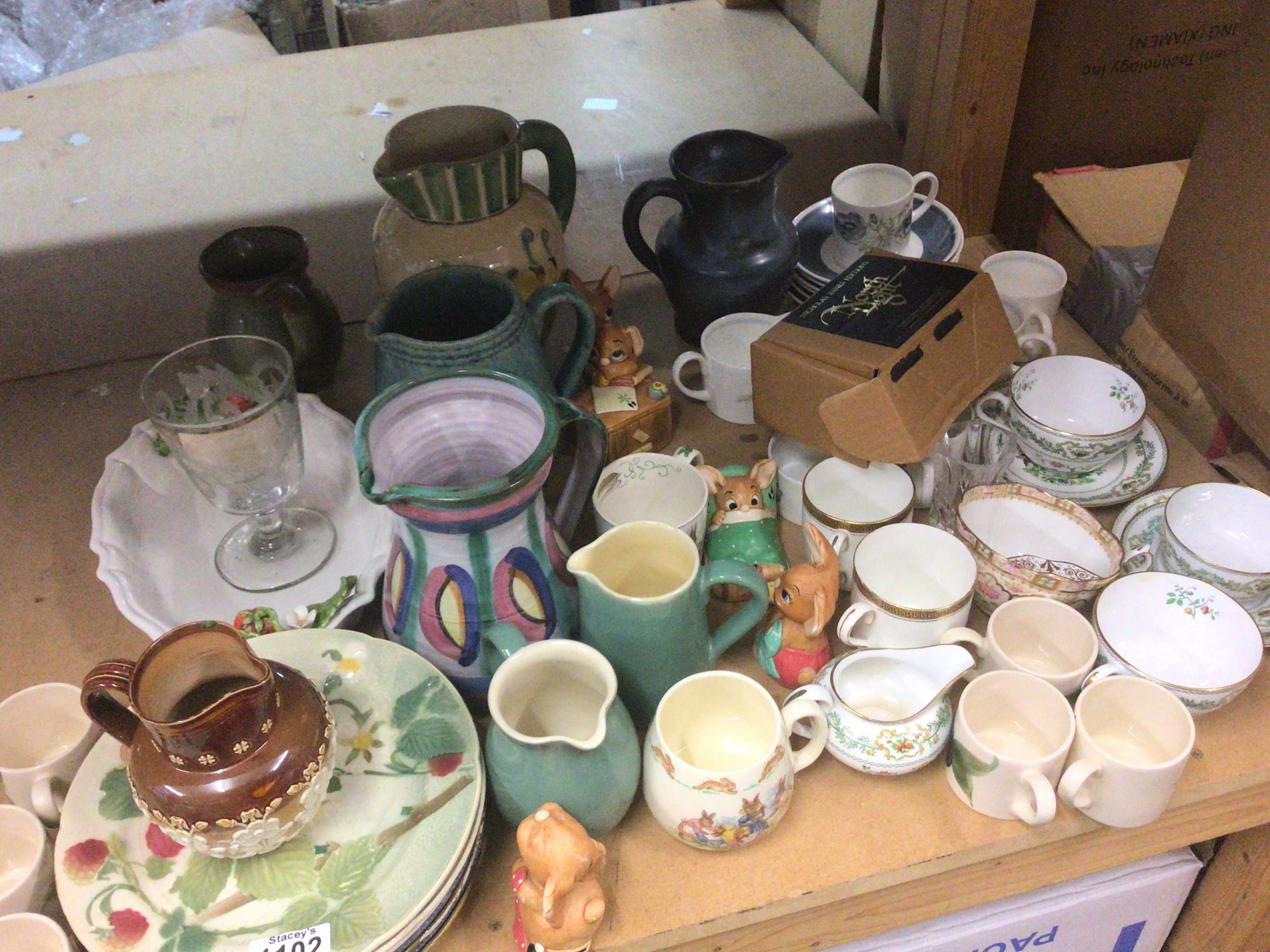 A collection of ceramics jugs cups and saucers Pendelfin figures a Doulton jug a Wedgwood Susie Cooper glen mist pattern coffee set and other ceramics