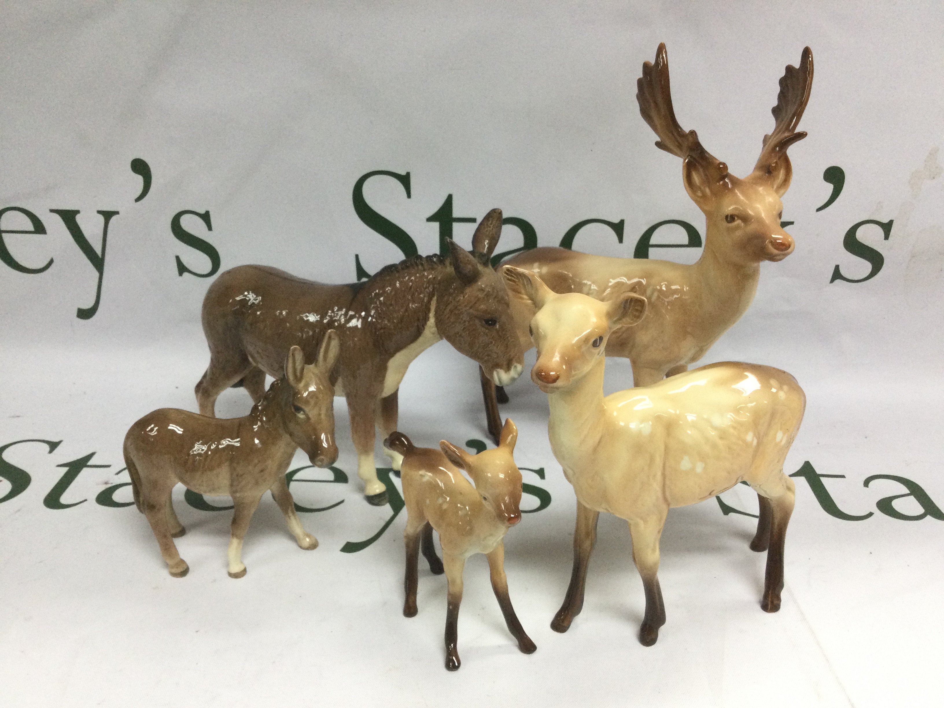 Three Beswick deer, donkey and foal (5). Shipping category D.