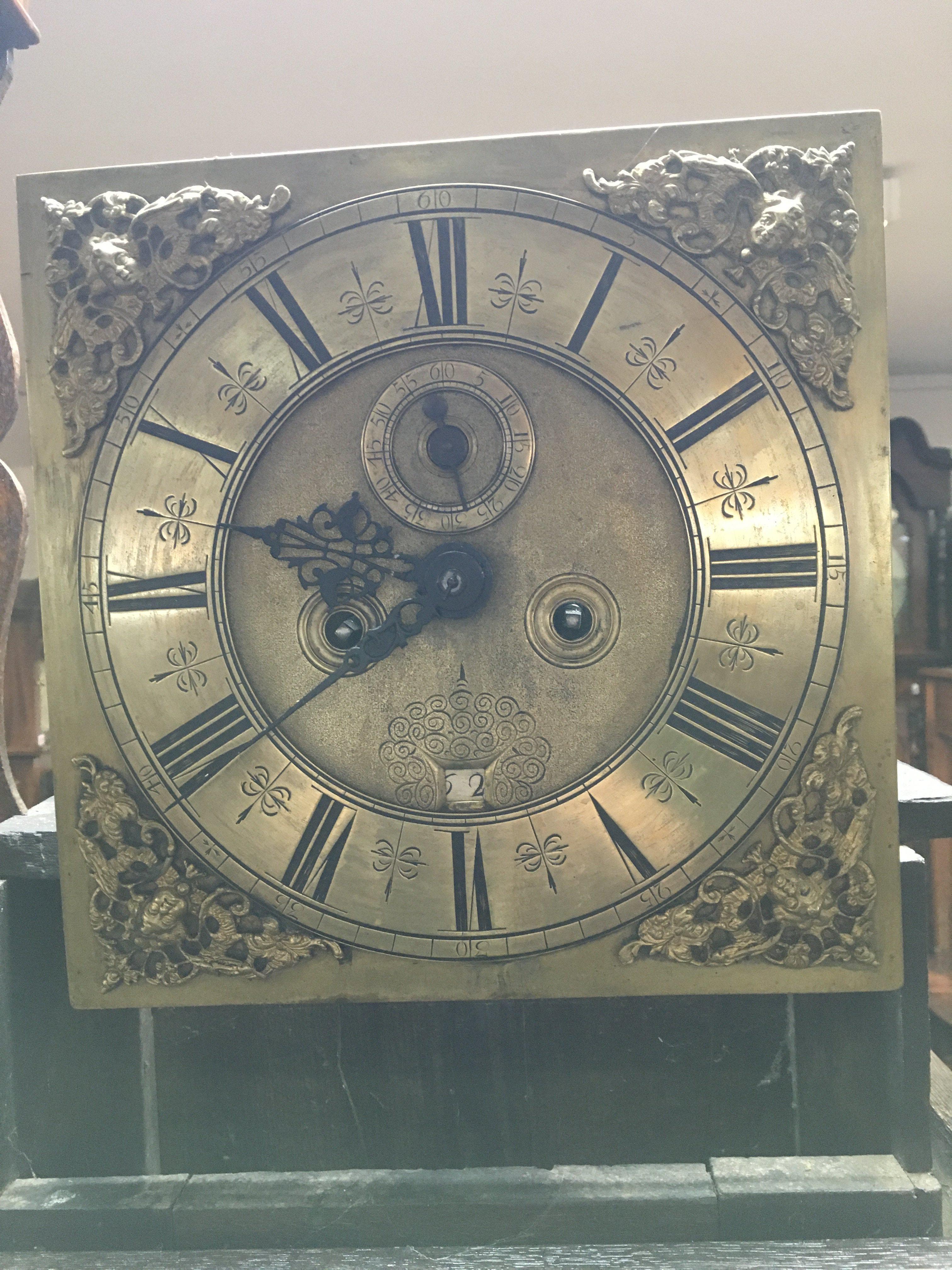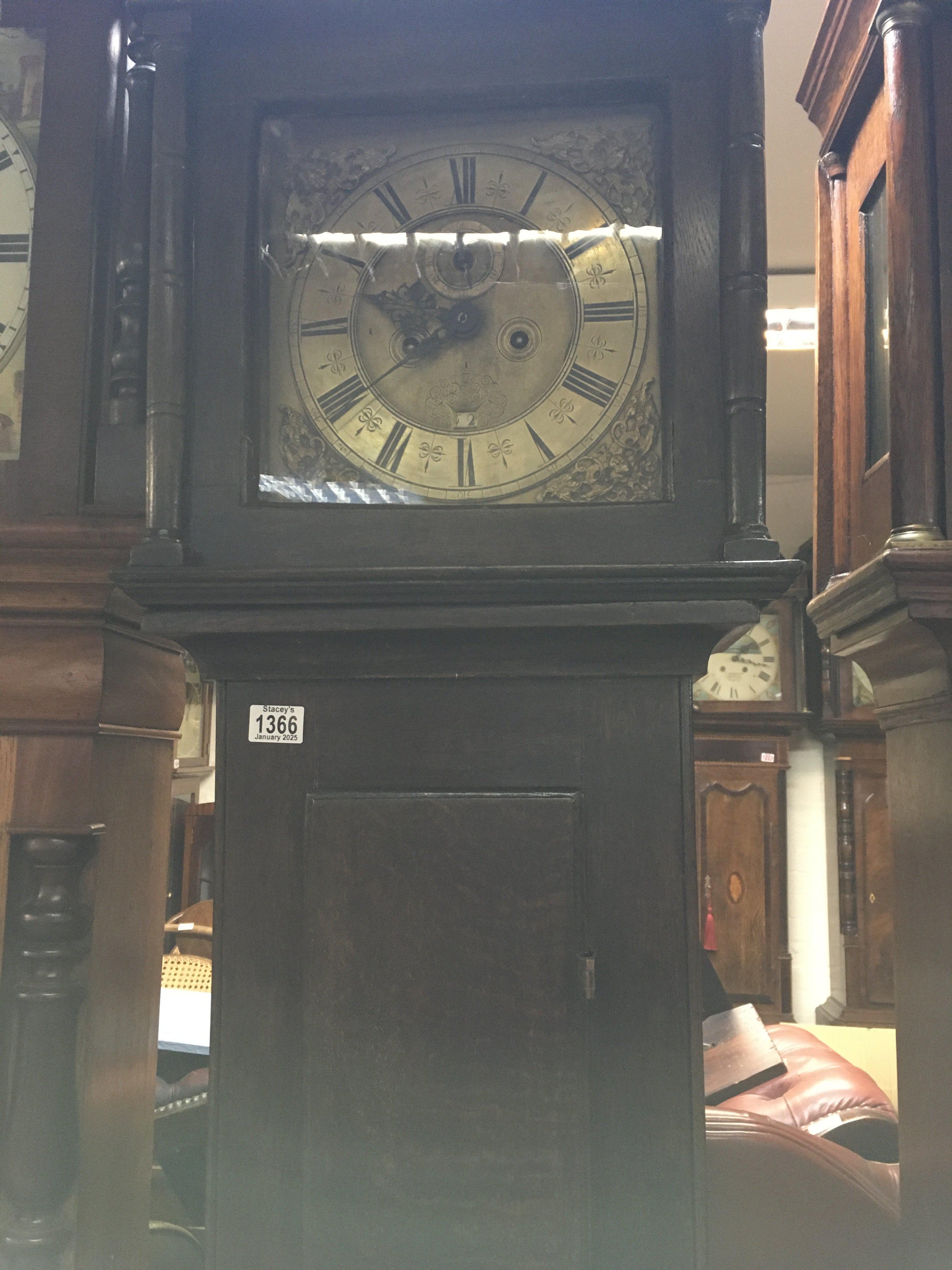 A oak case 30 hour long case clock the brass dial with Roman numerals. No Reserve.