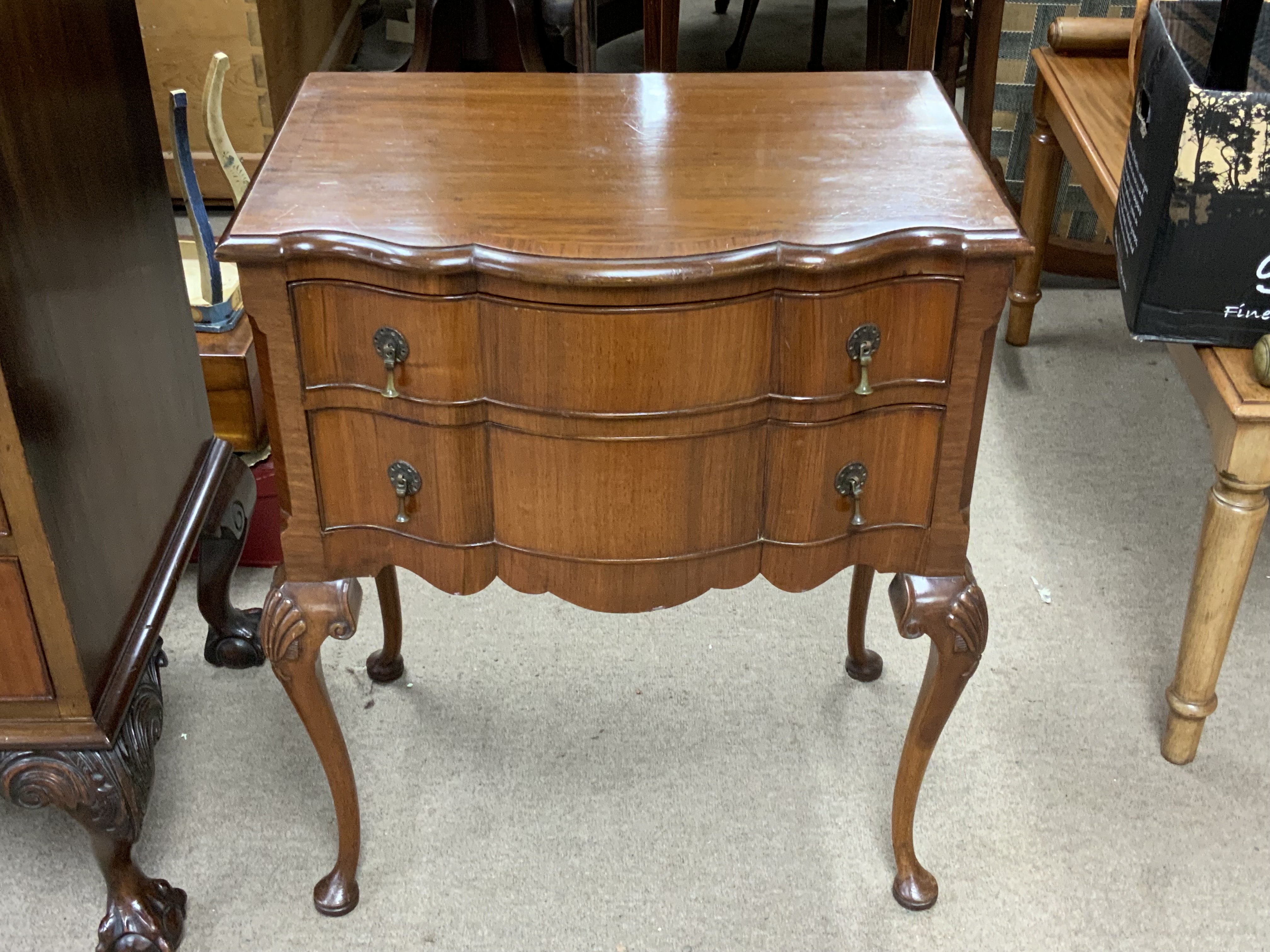 A small 1960s serpentine fronted 2 draw chest. 61cm x 43cm