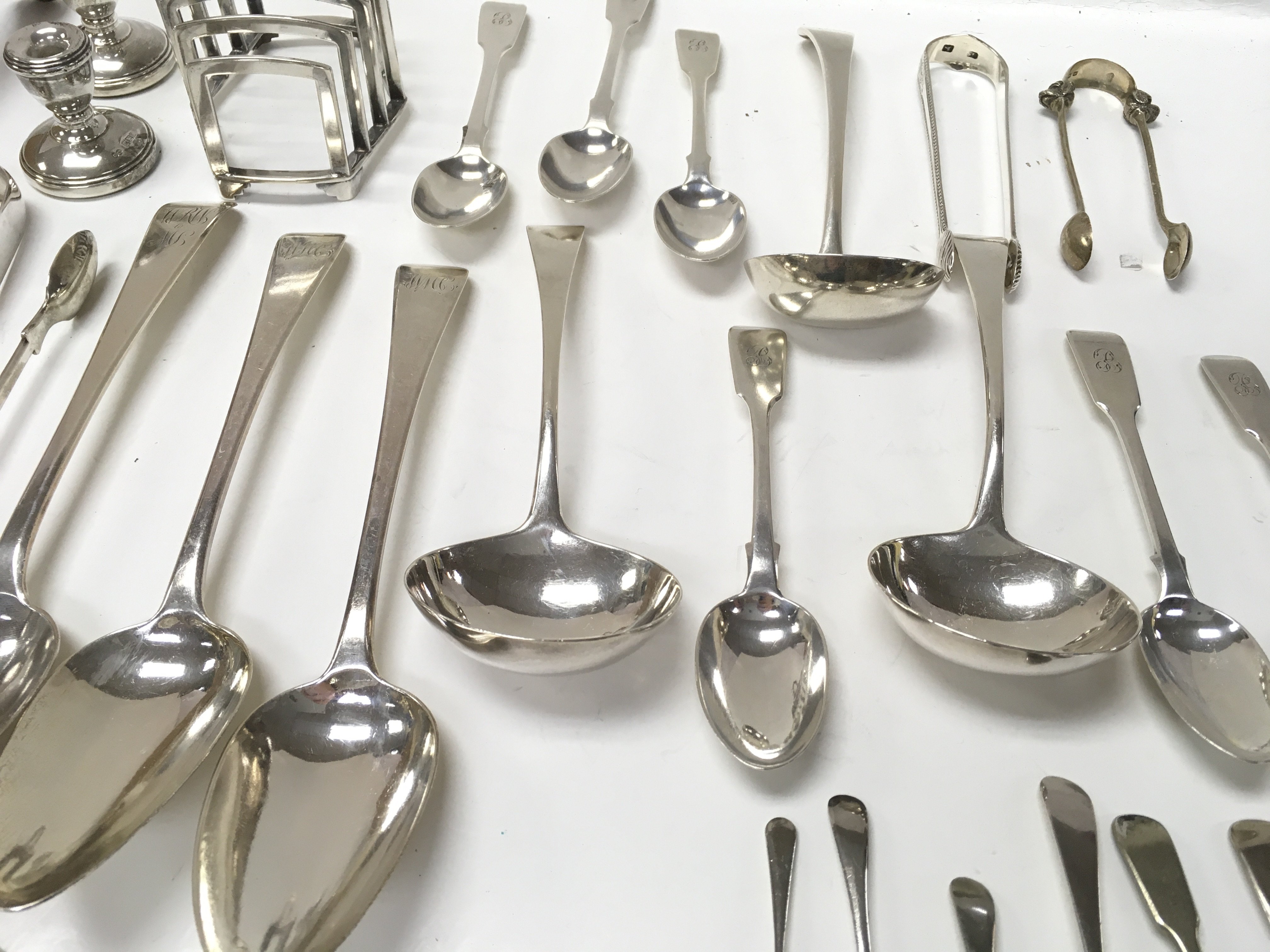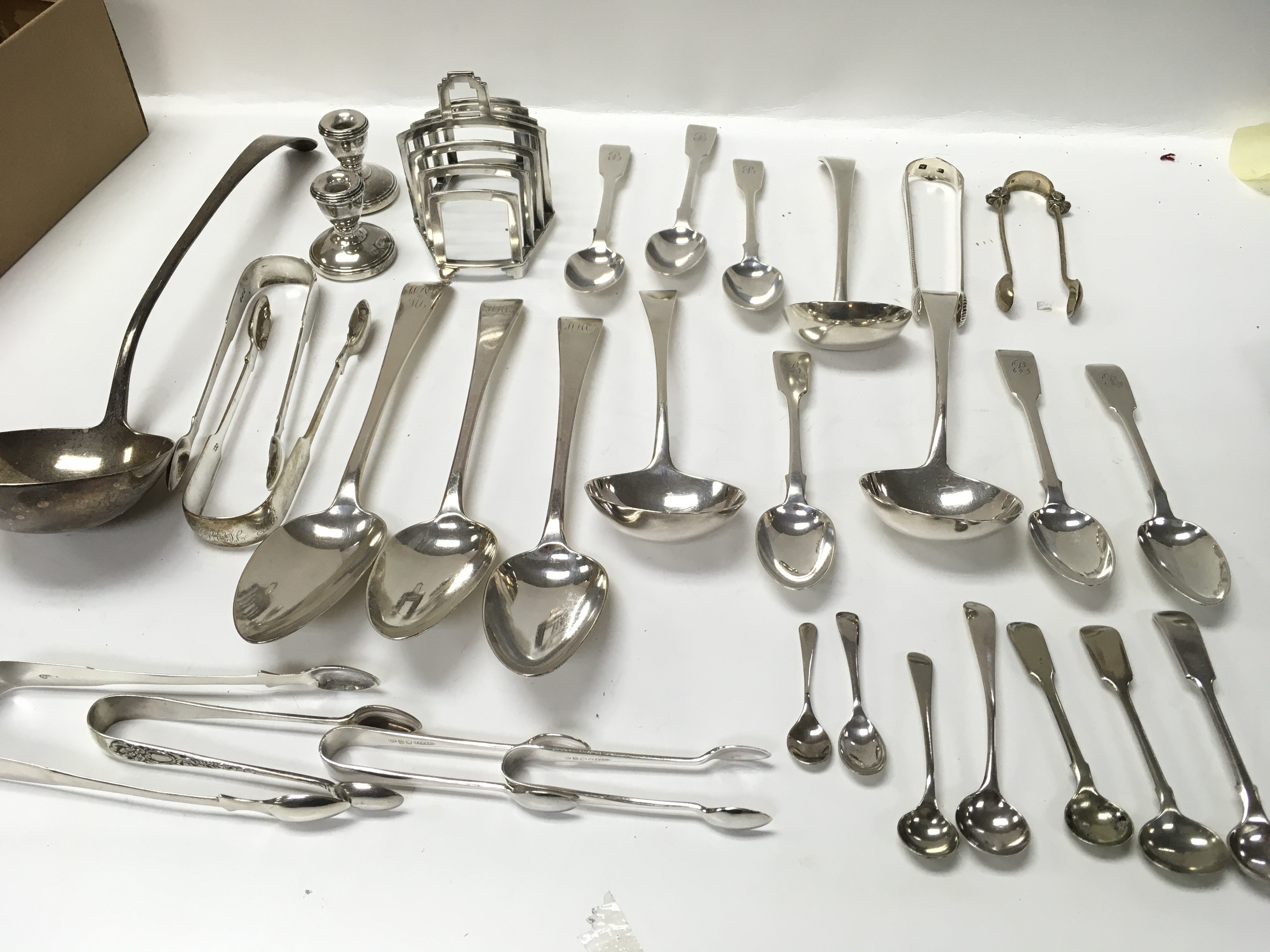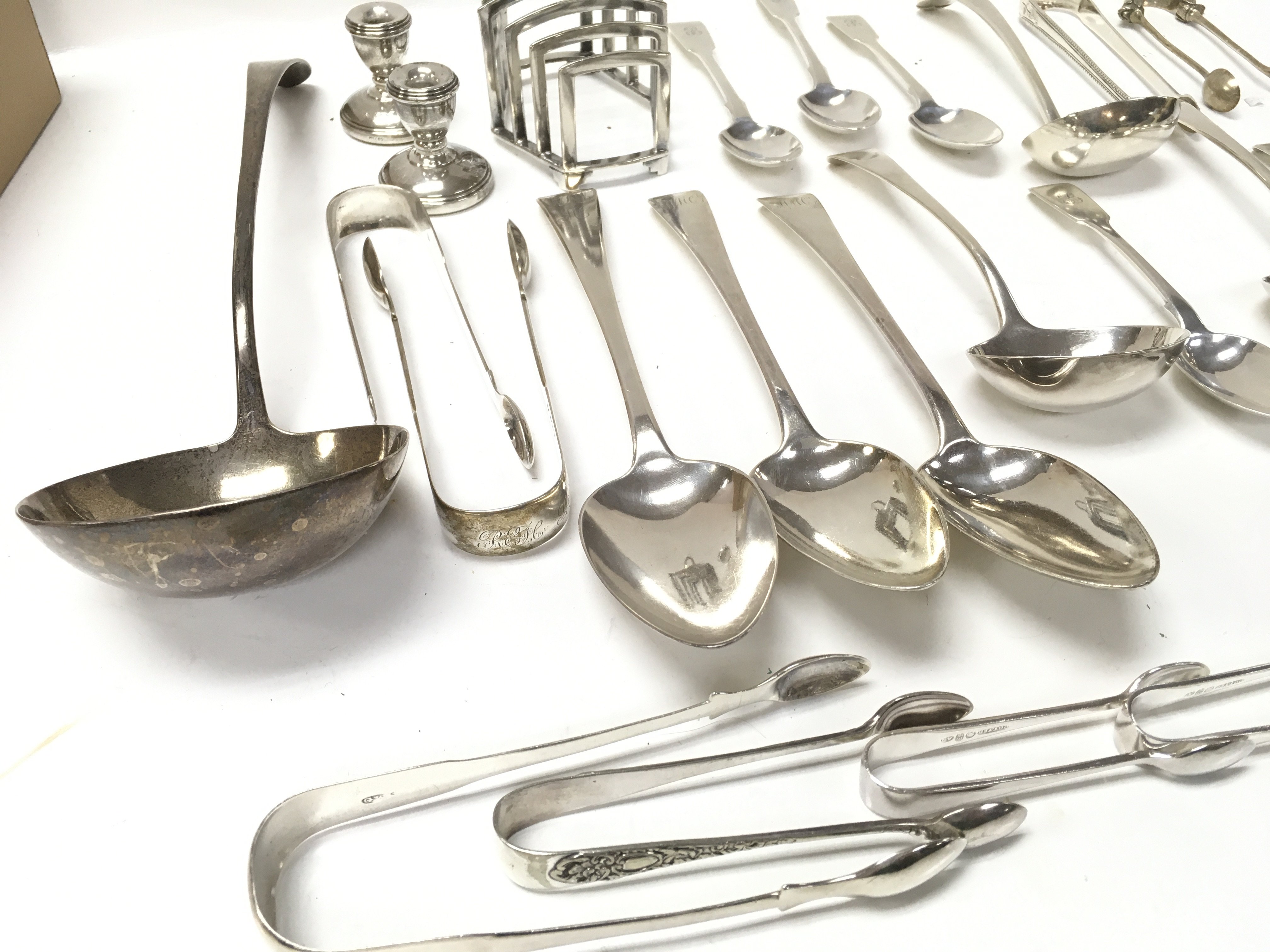 A collection of assorted silver items including spoons sugar tongs etc. Total weight 1.1kg Postage B
