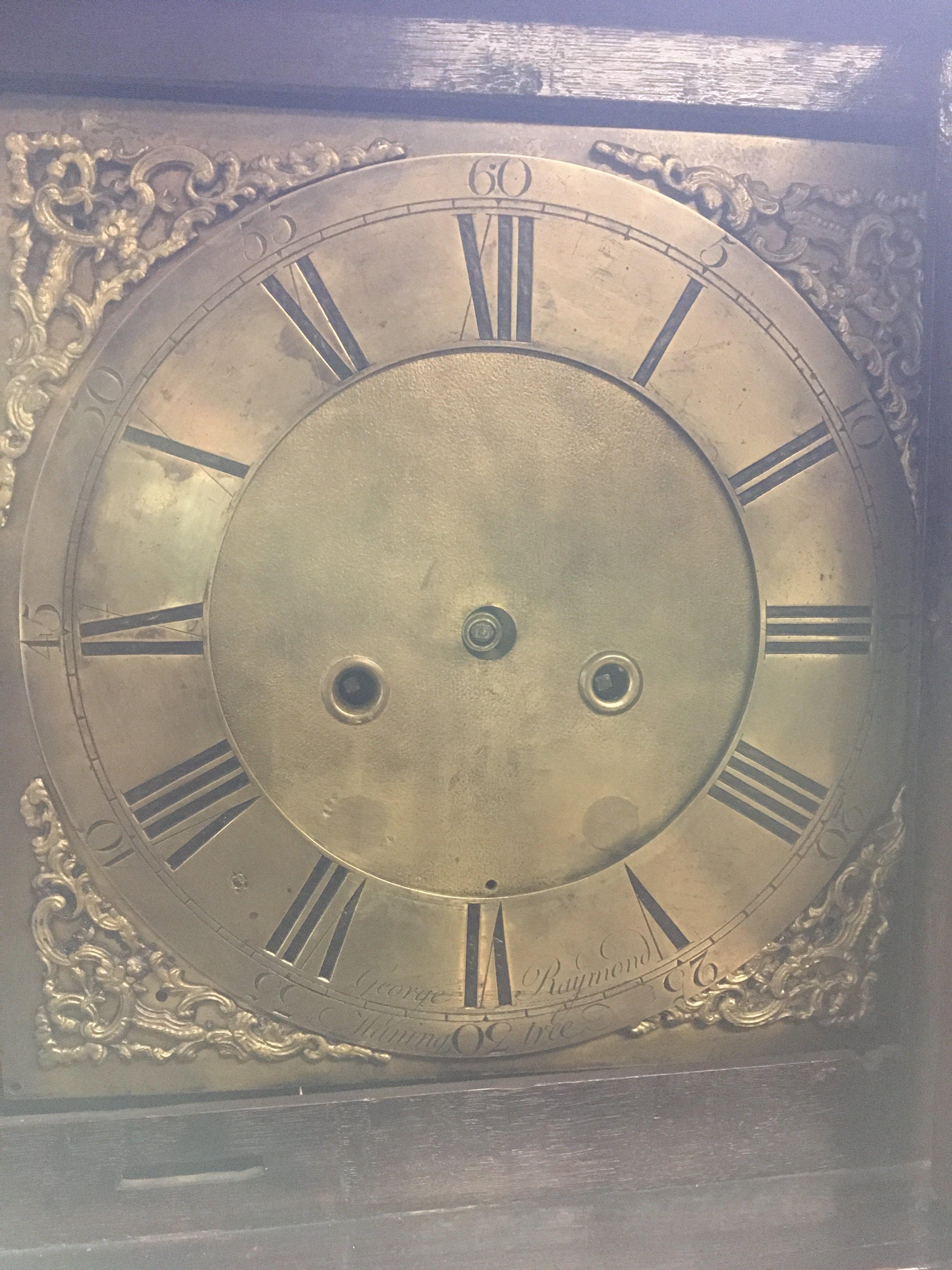 A oak long case clock the brass dial with Roman numerals no reserve.