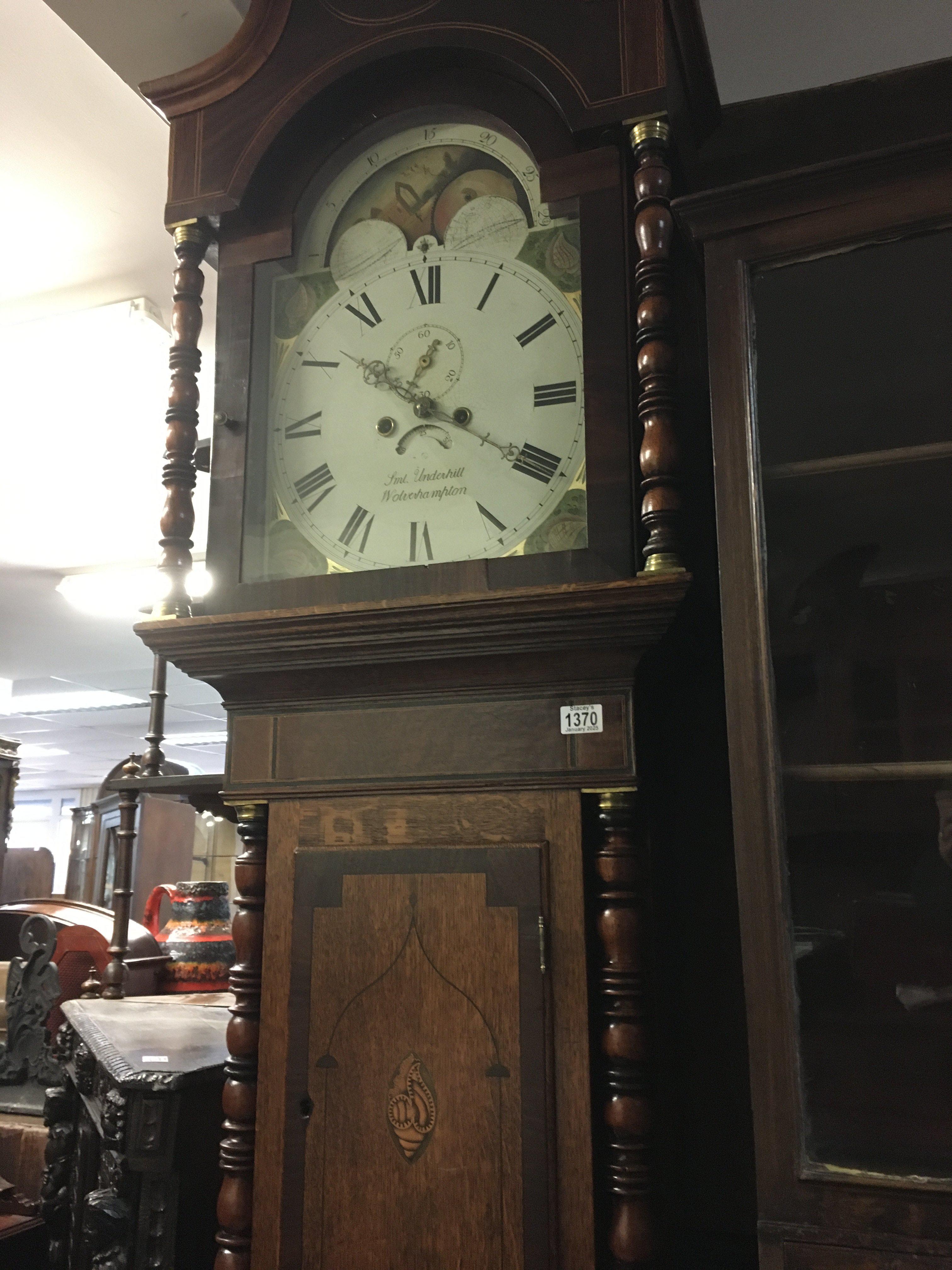 A oak long case clock the arched panted dial with moon roller Roman numerals and second dial .