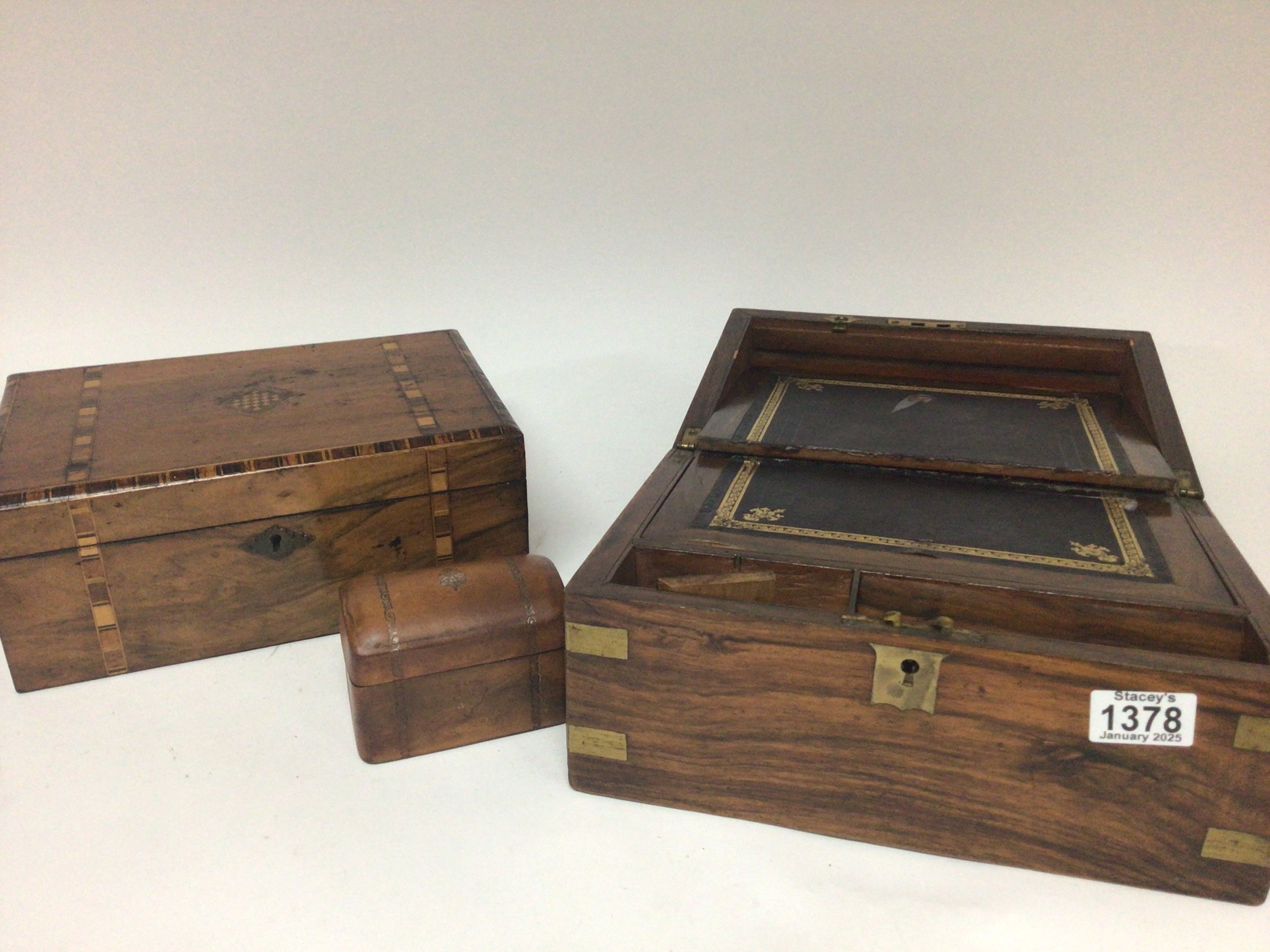 A walnut writing slope for restoration one other walnut box and a leather case containing playing cards. (3)