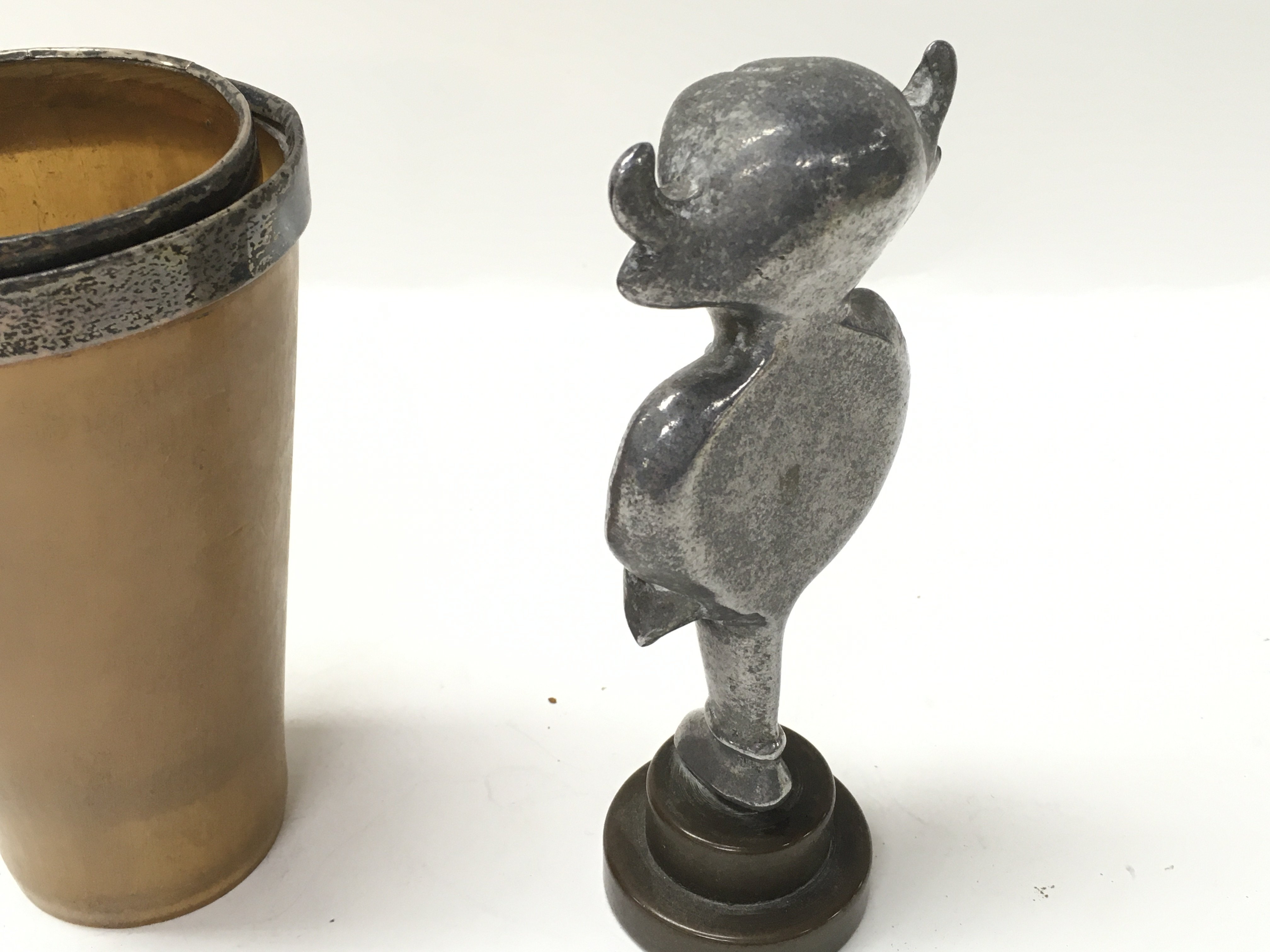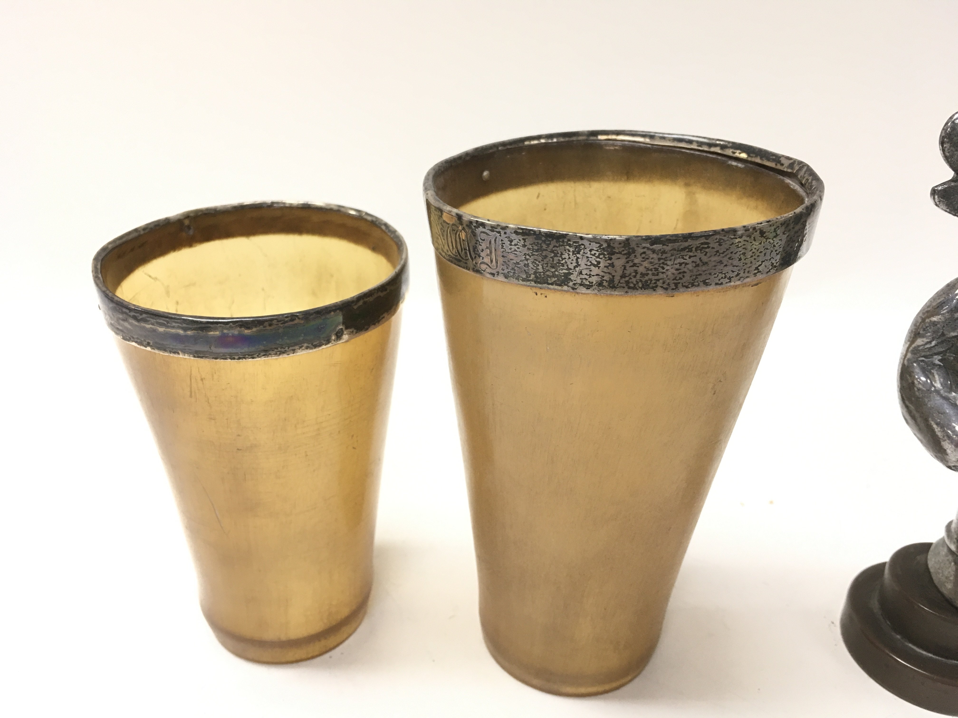 Two silver rimmed horn cups and a vintage Lincoln imp car mascot. Postage B