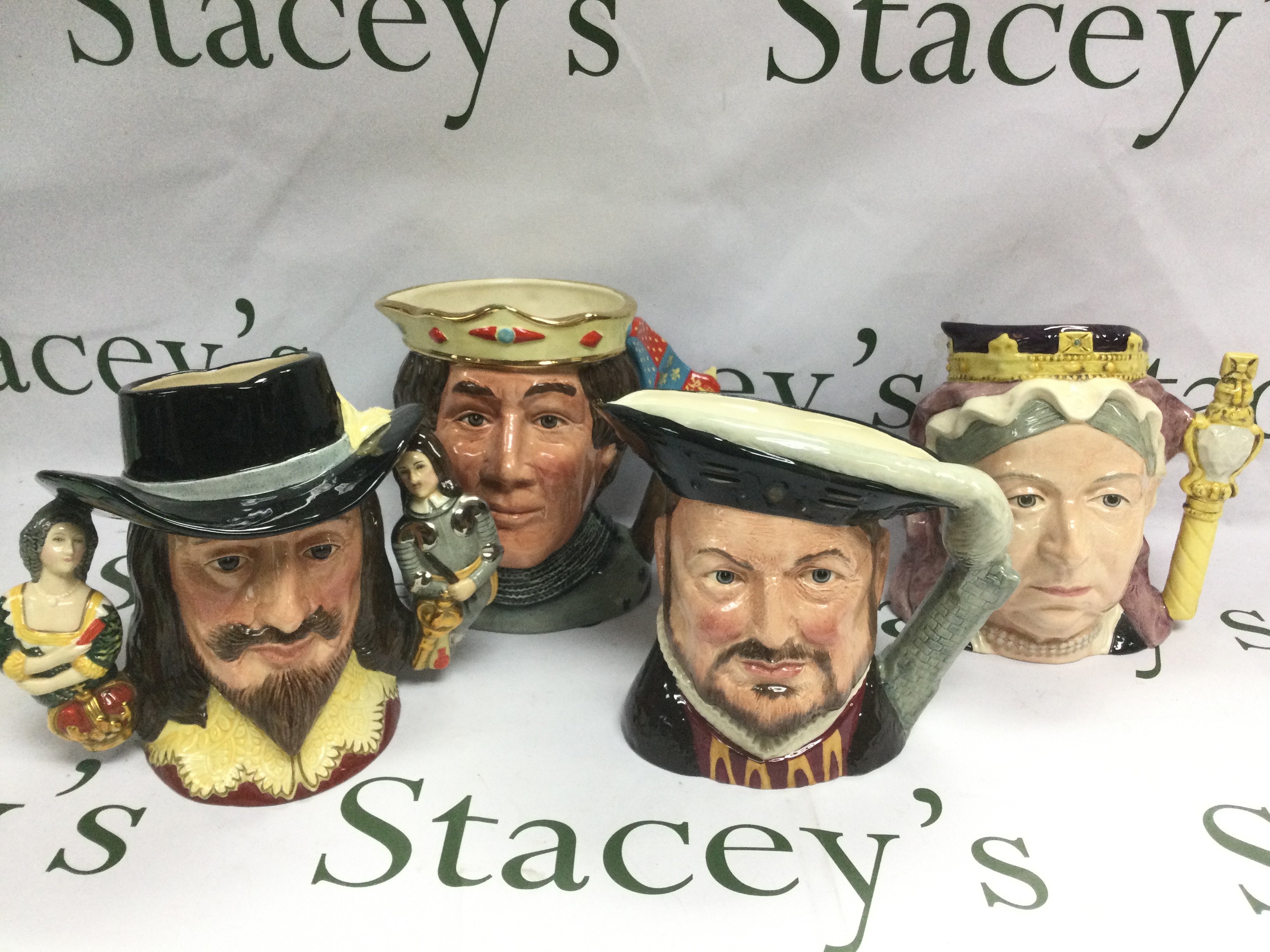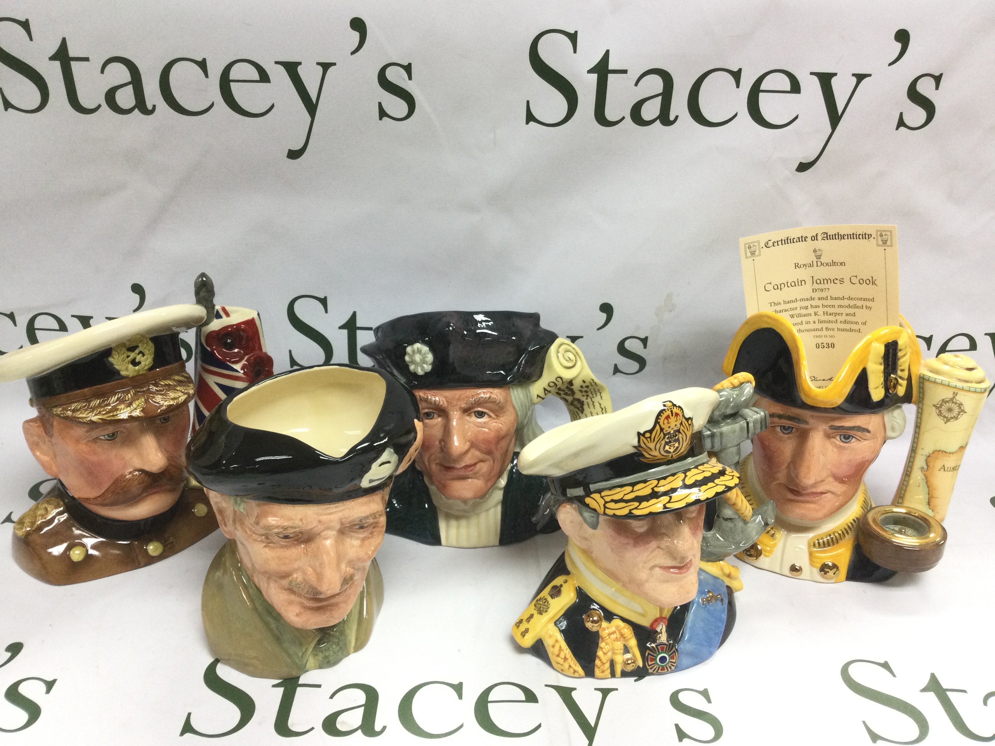 Nine Royal Doulton character jugs including Lord Kitchener, Henry V, Captain Cook and others. Includes eight boxes. Shipping category D.