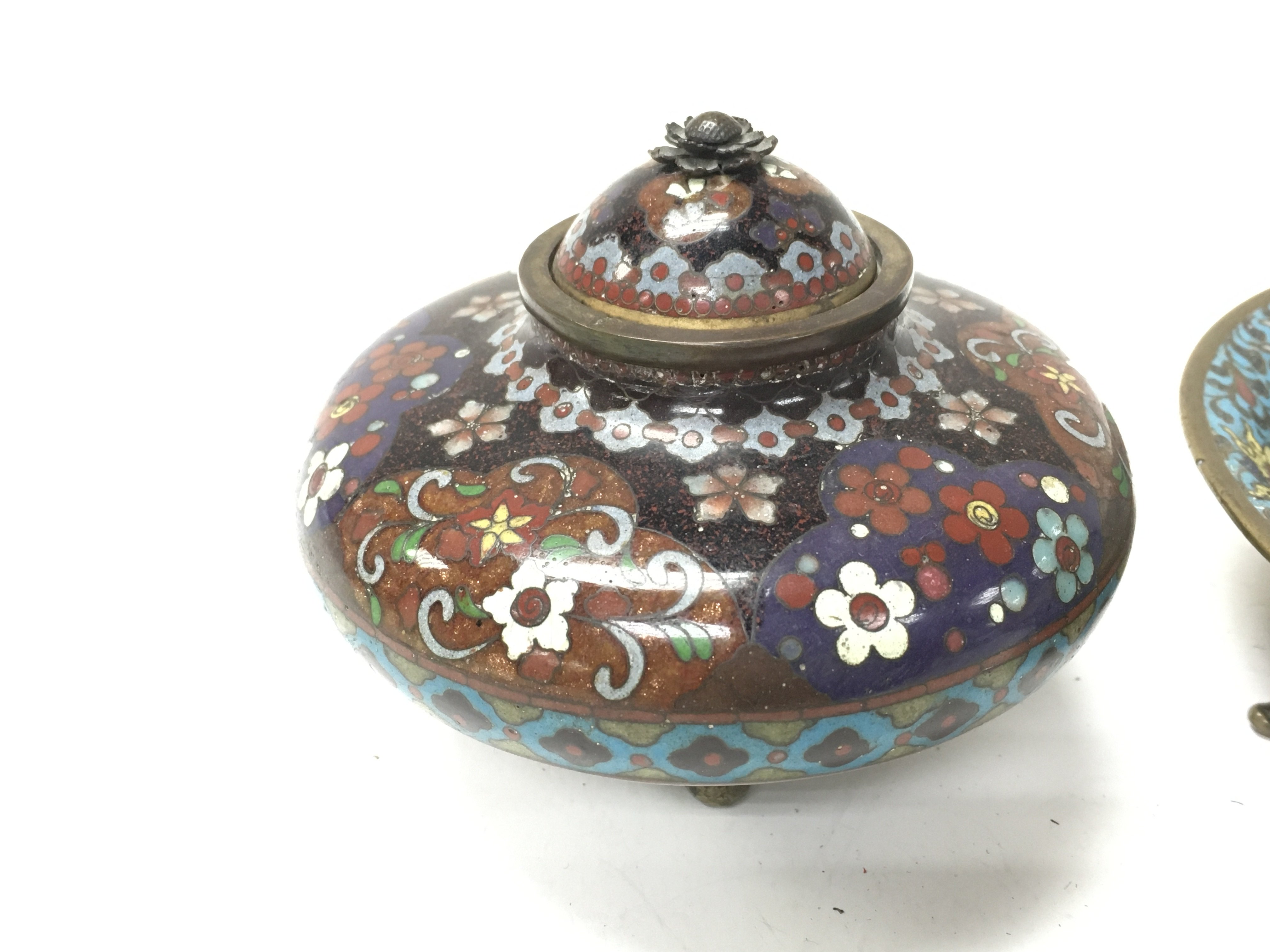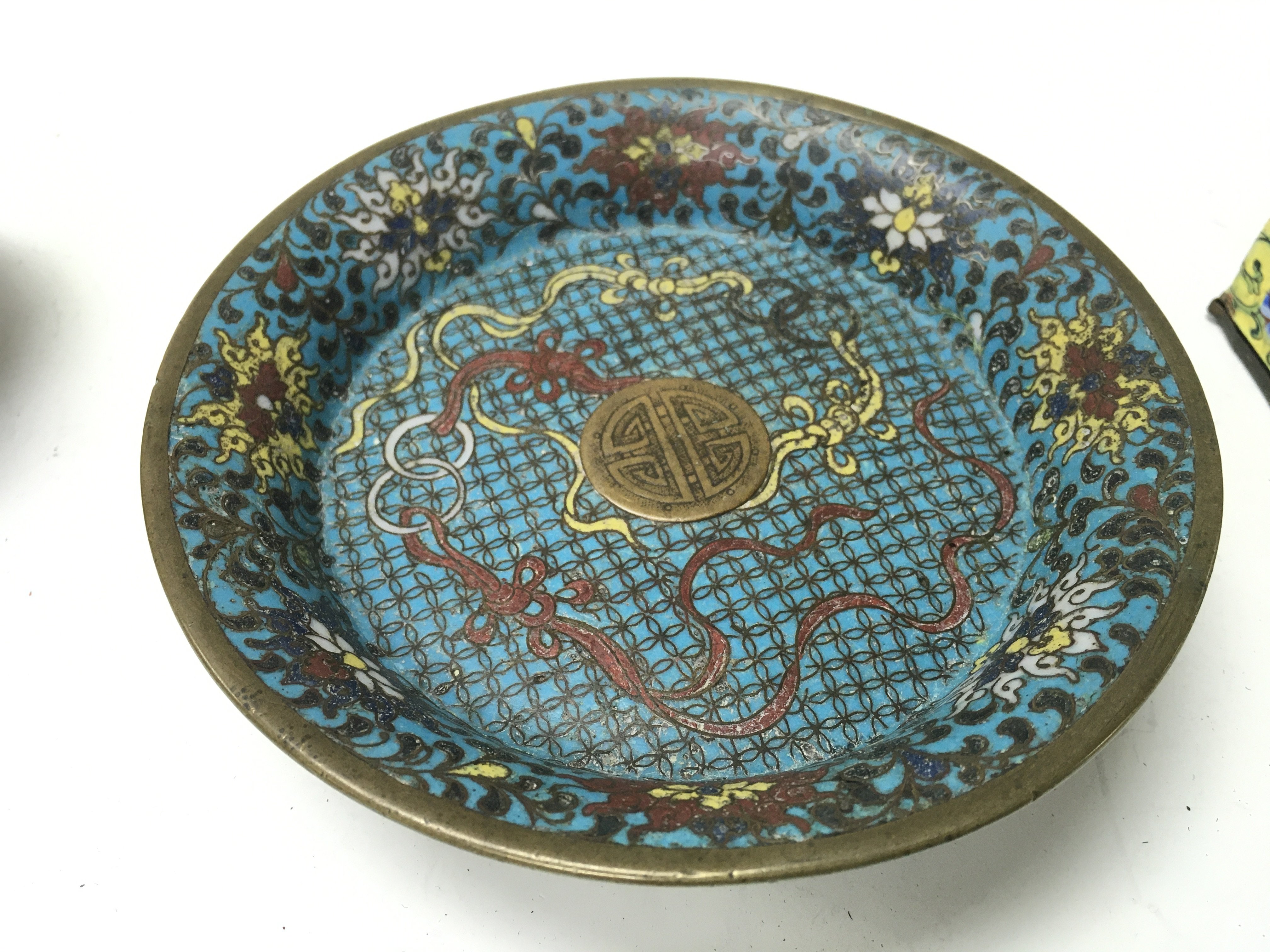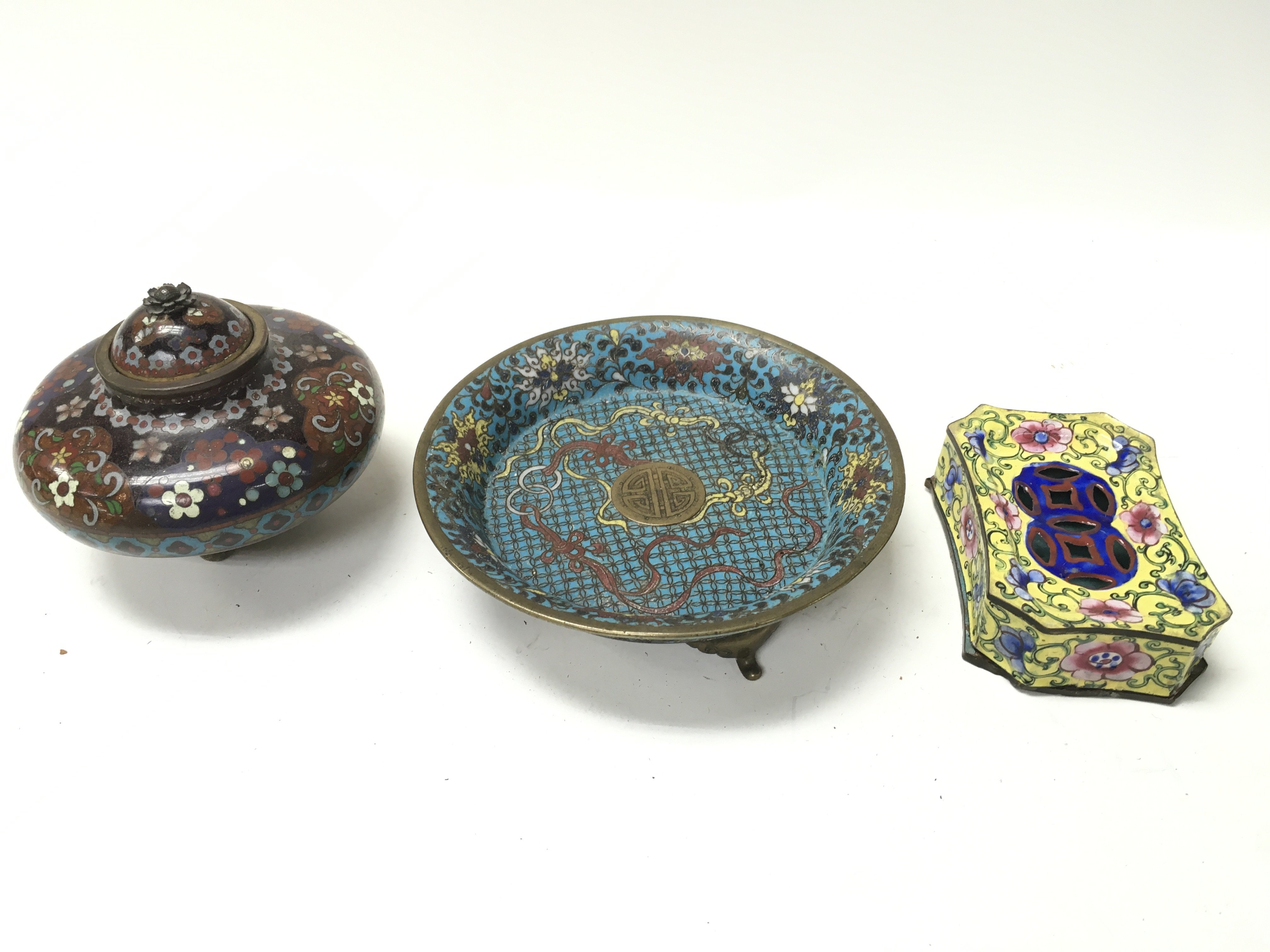 A Chinese cloisonne dish and an enamel dish and box.