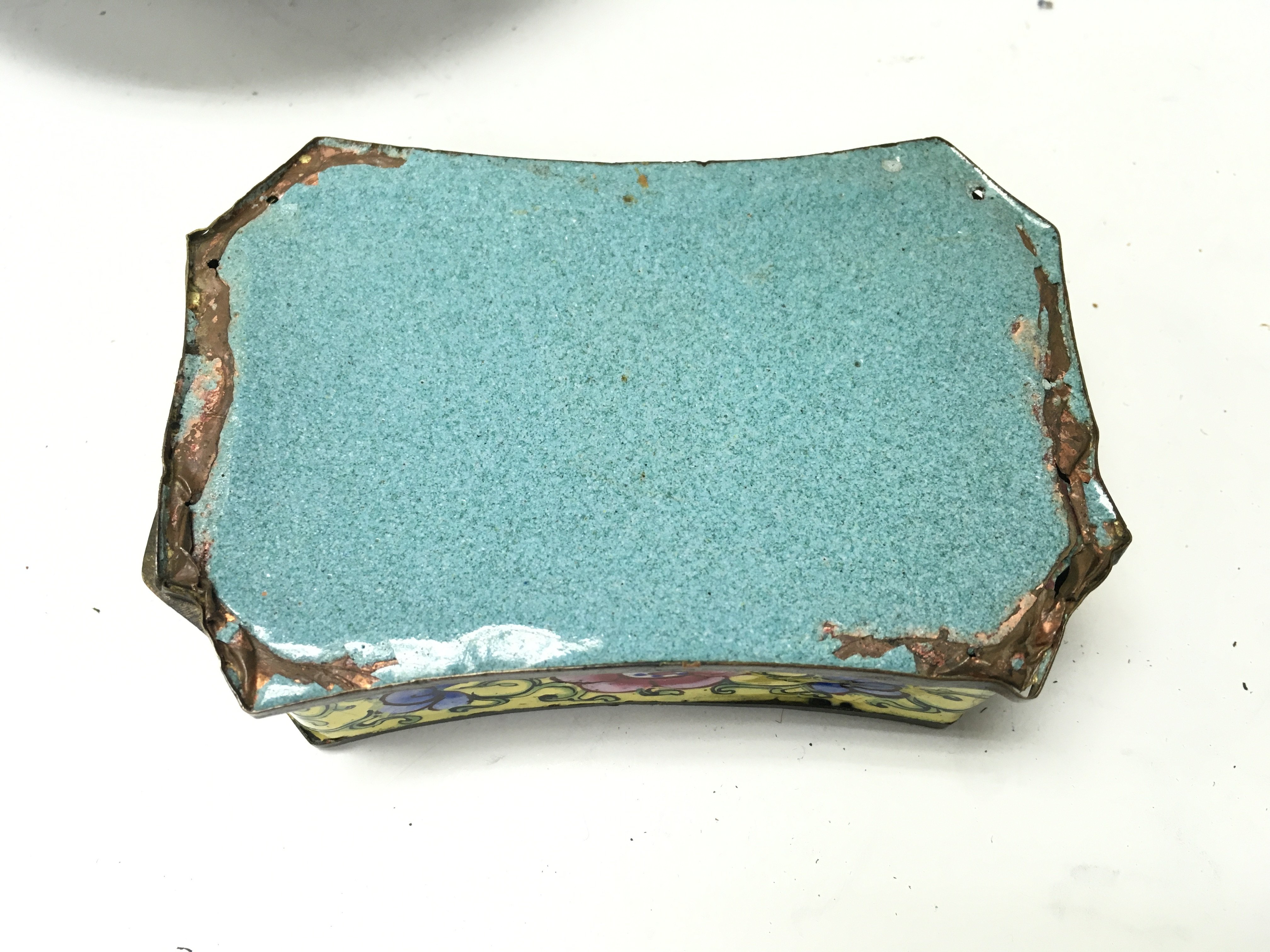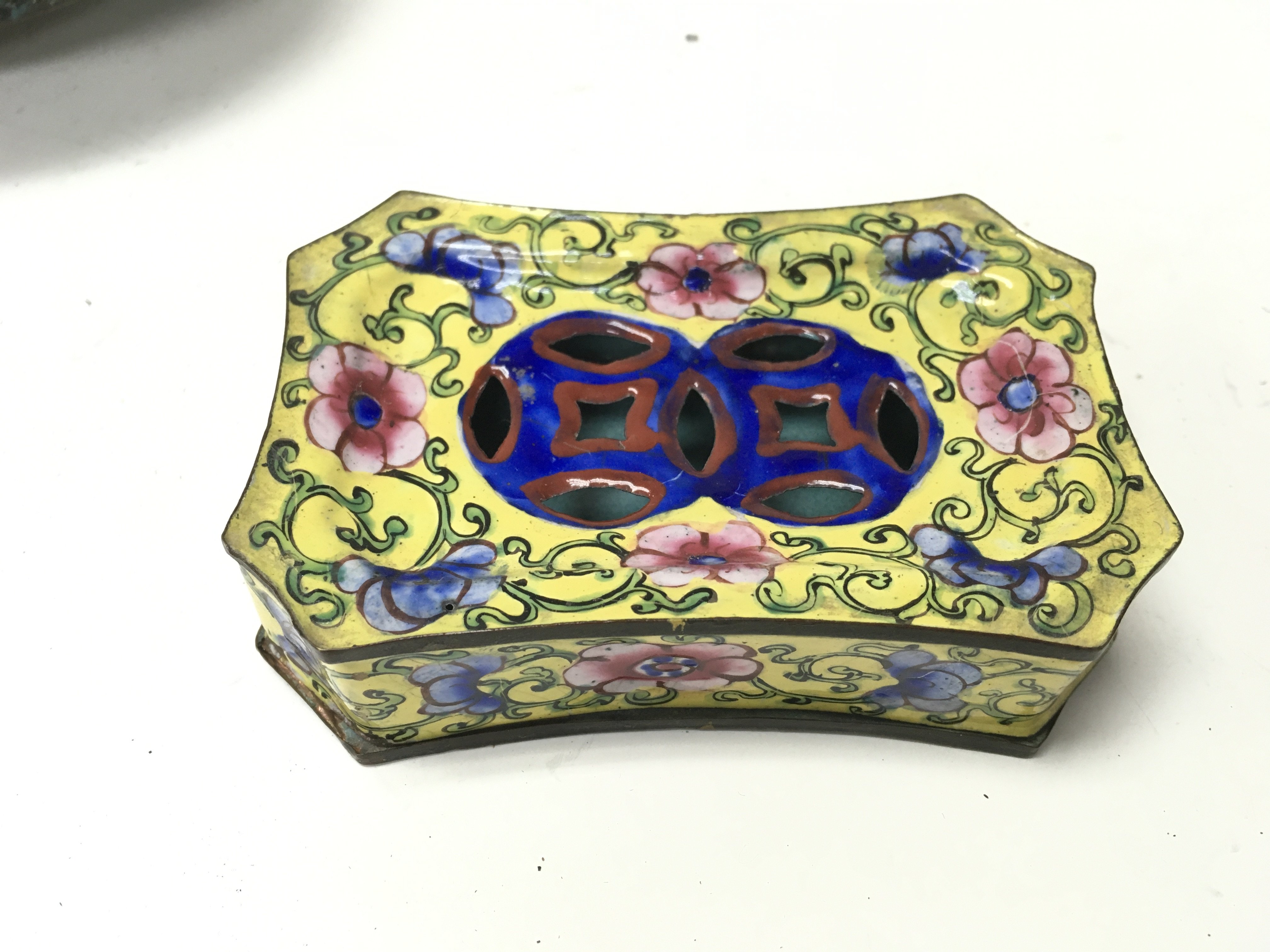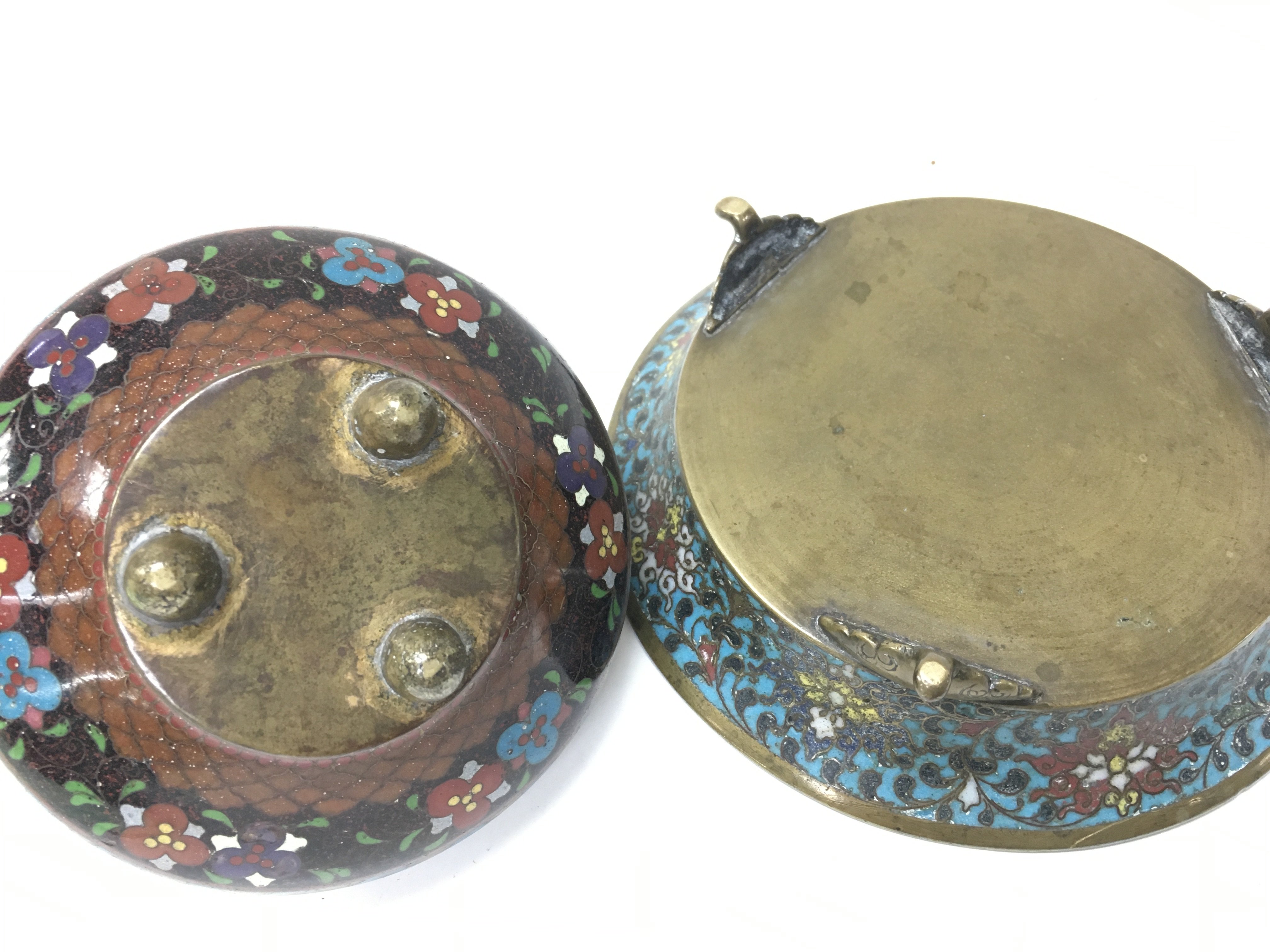 A Chinese cloisonne dish and an enamel dish and box.