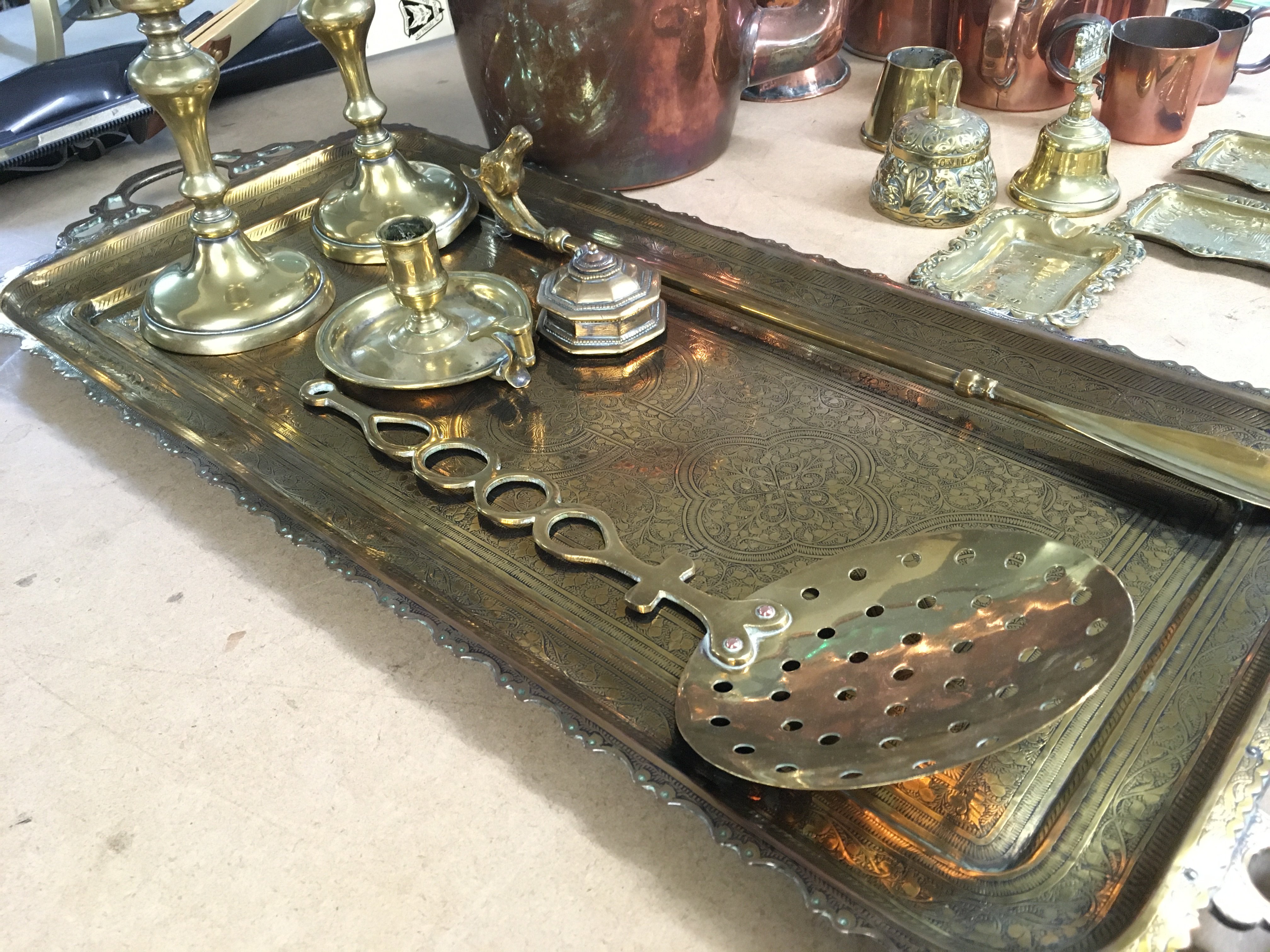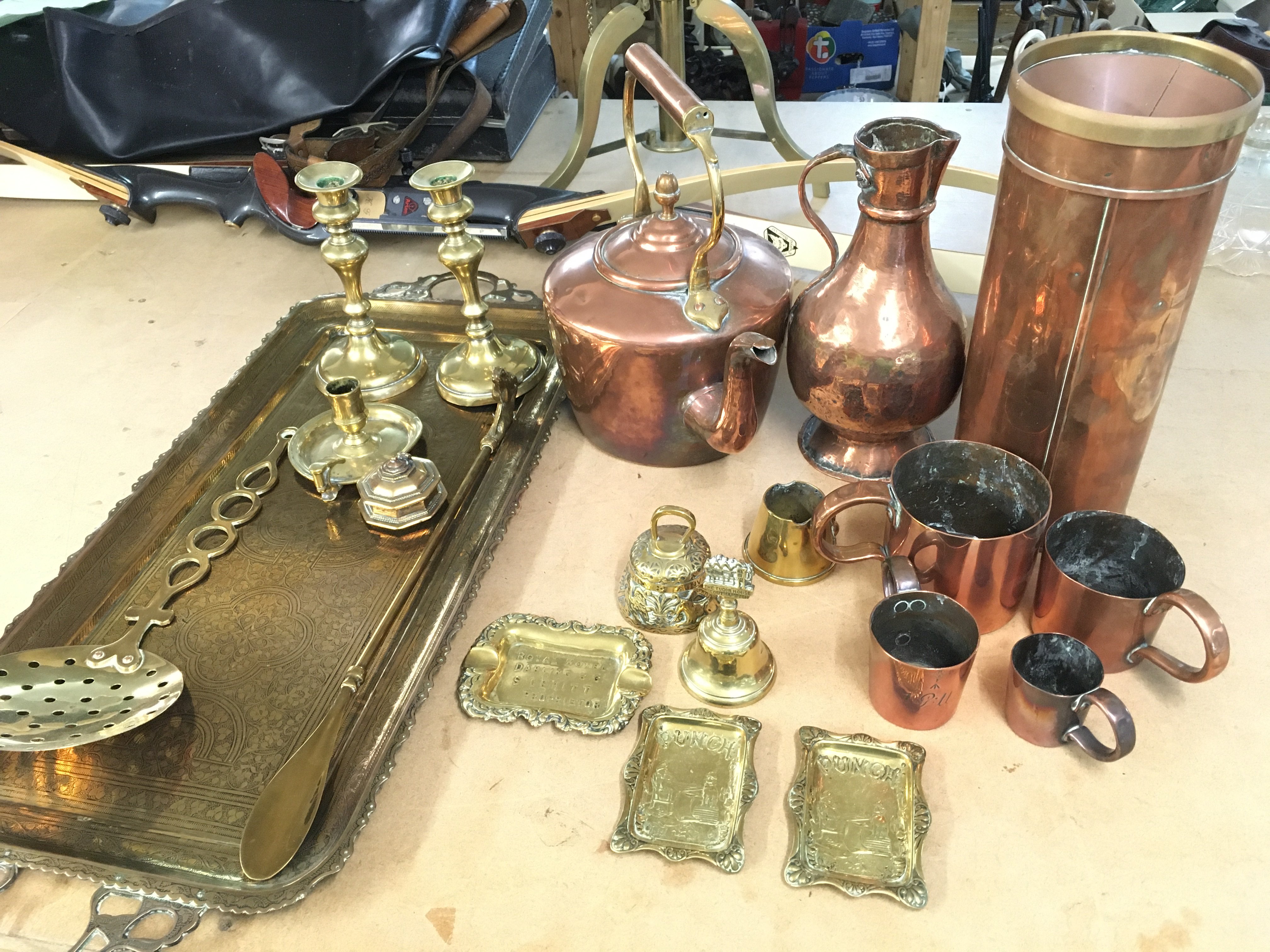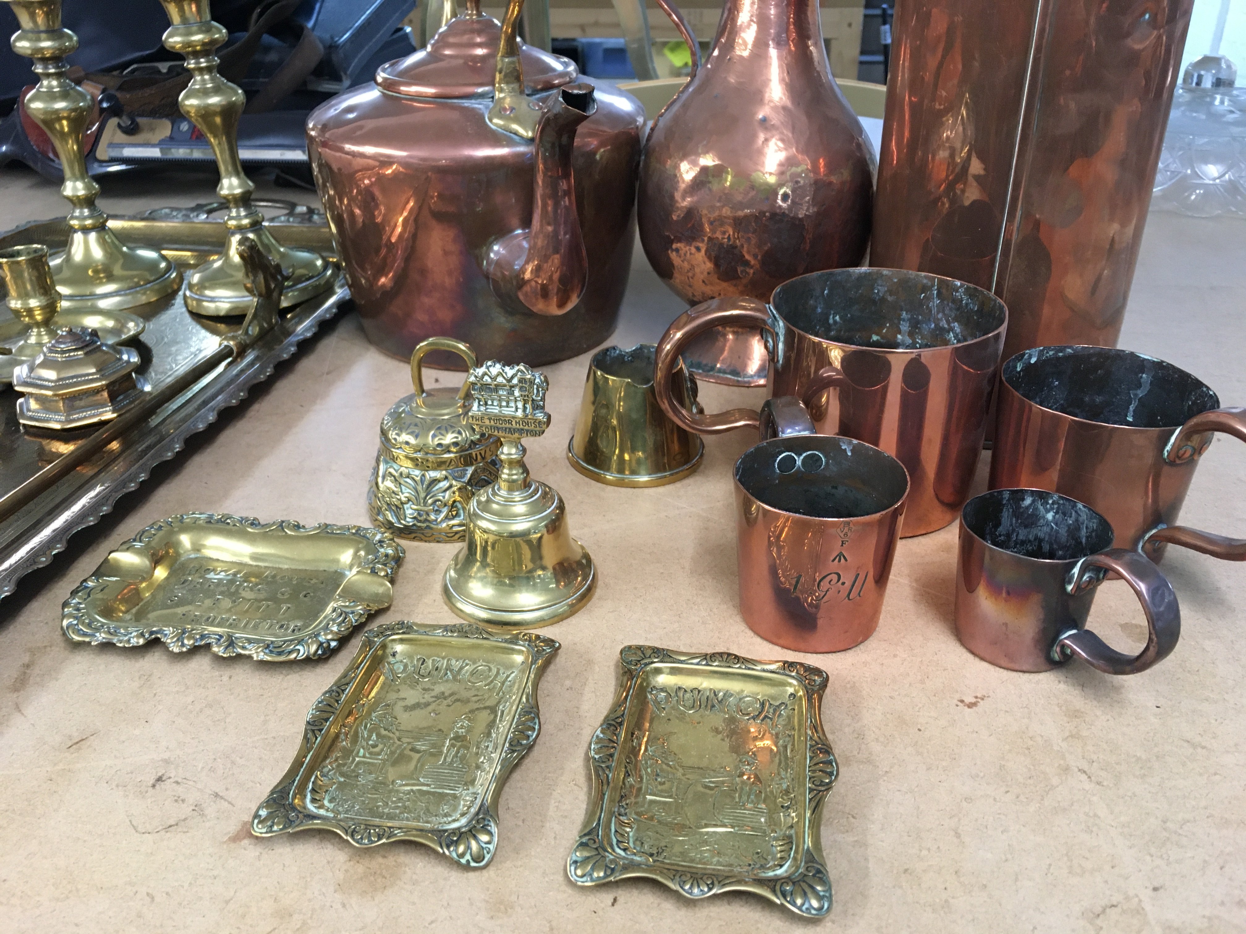 A collection of assorted copper and brass wear. Postage C
