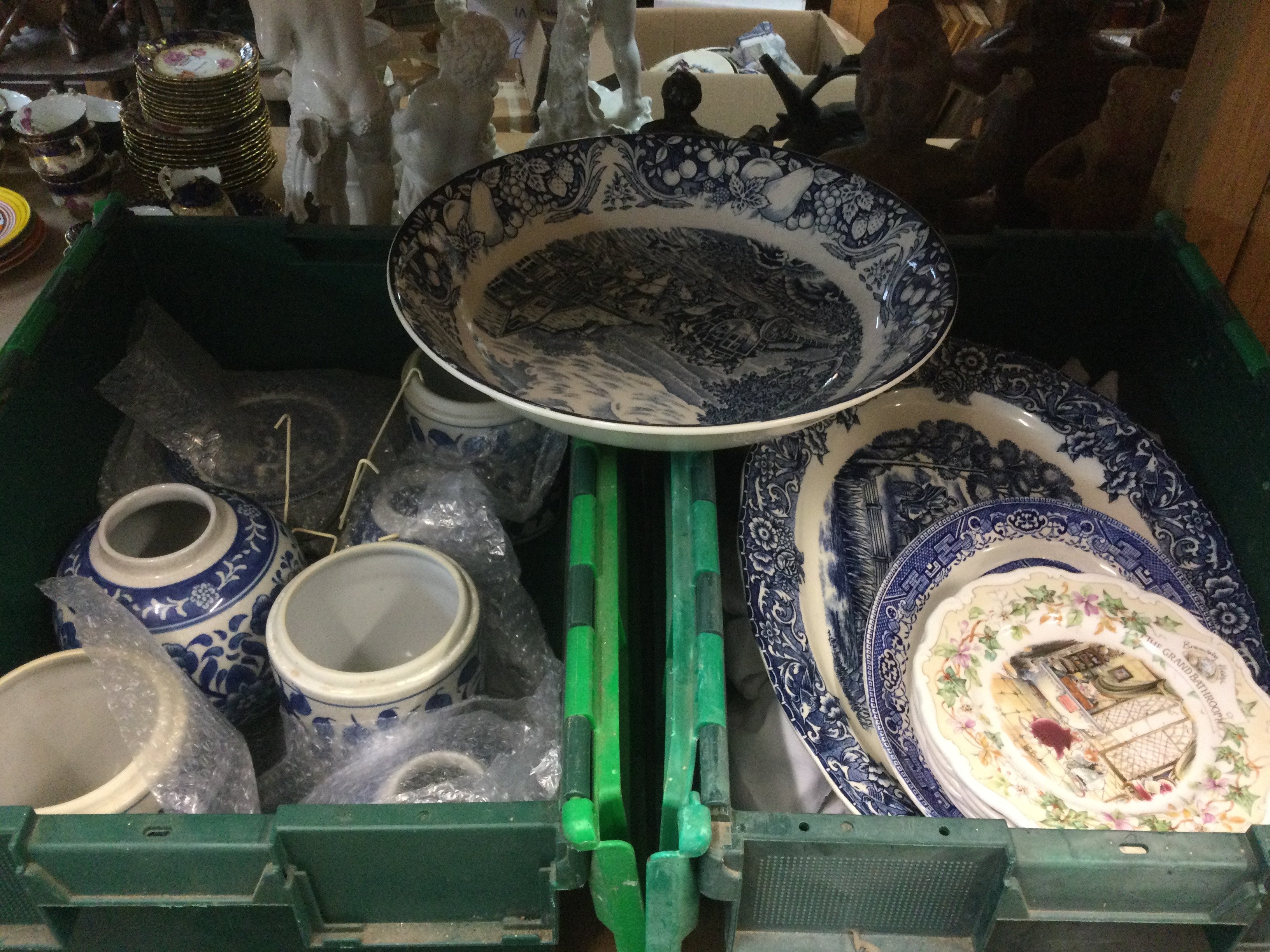 Two boxes of mainly blue and white ceramics. Shipping category D.