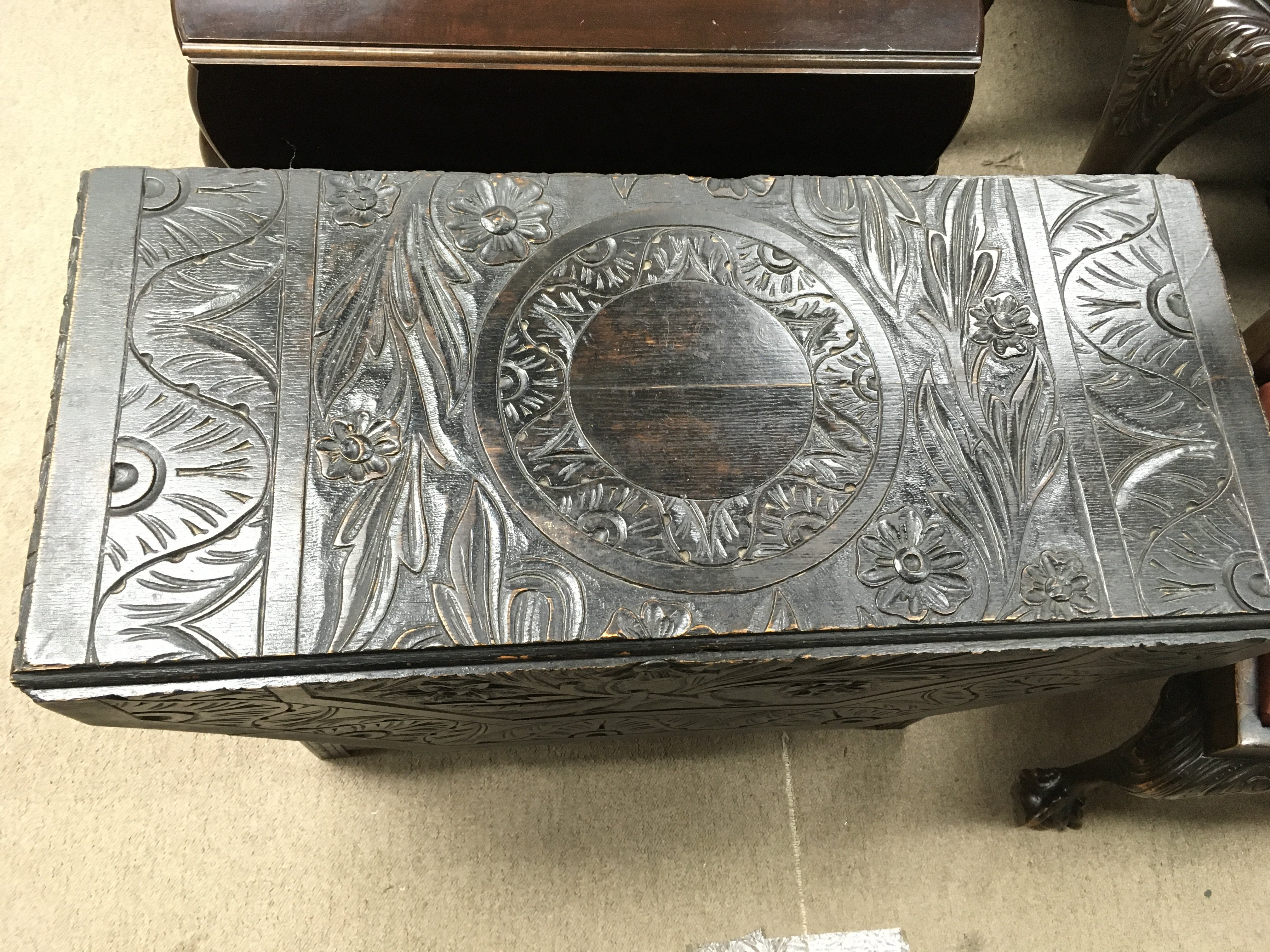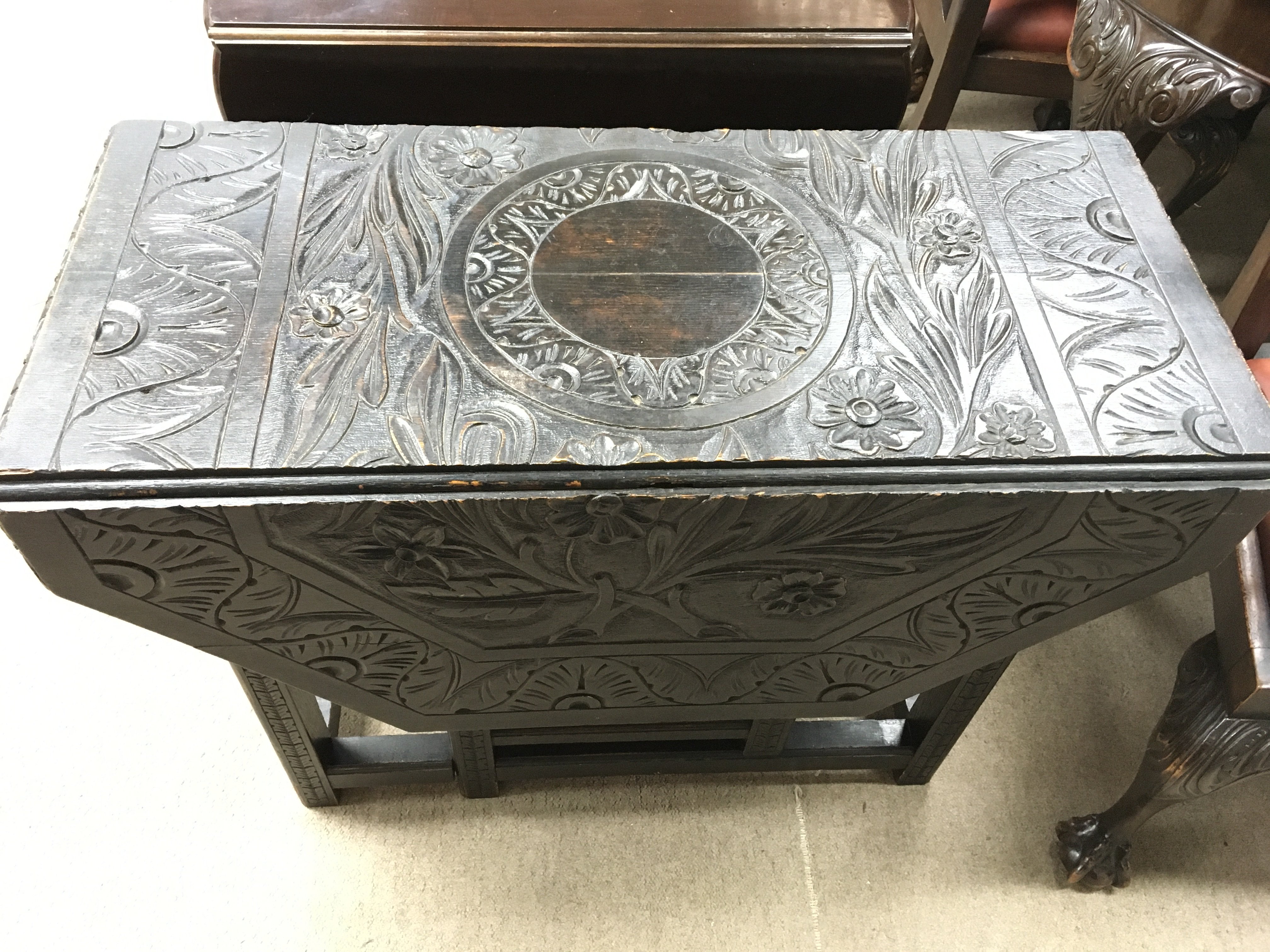 A carved oak drop leaf table. 90 cm wide. No reserve