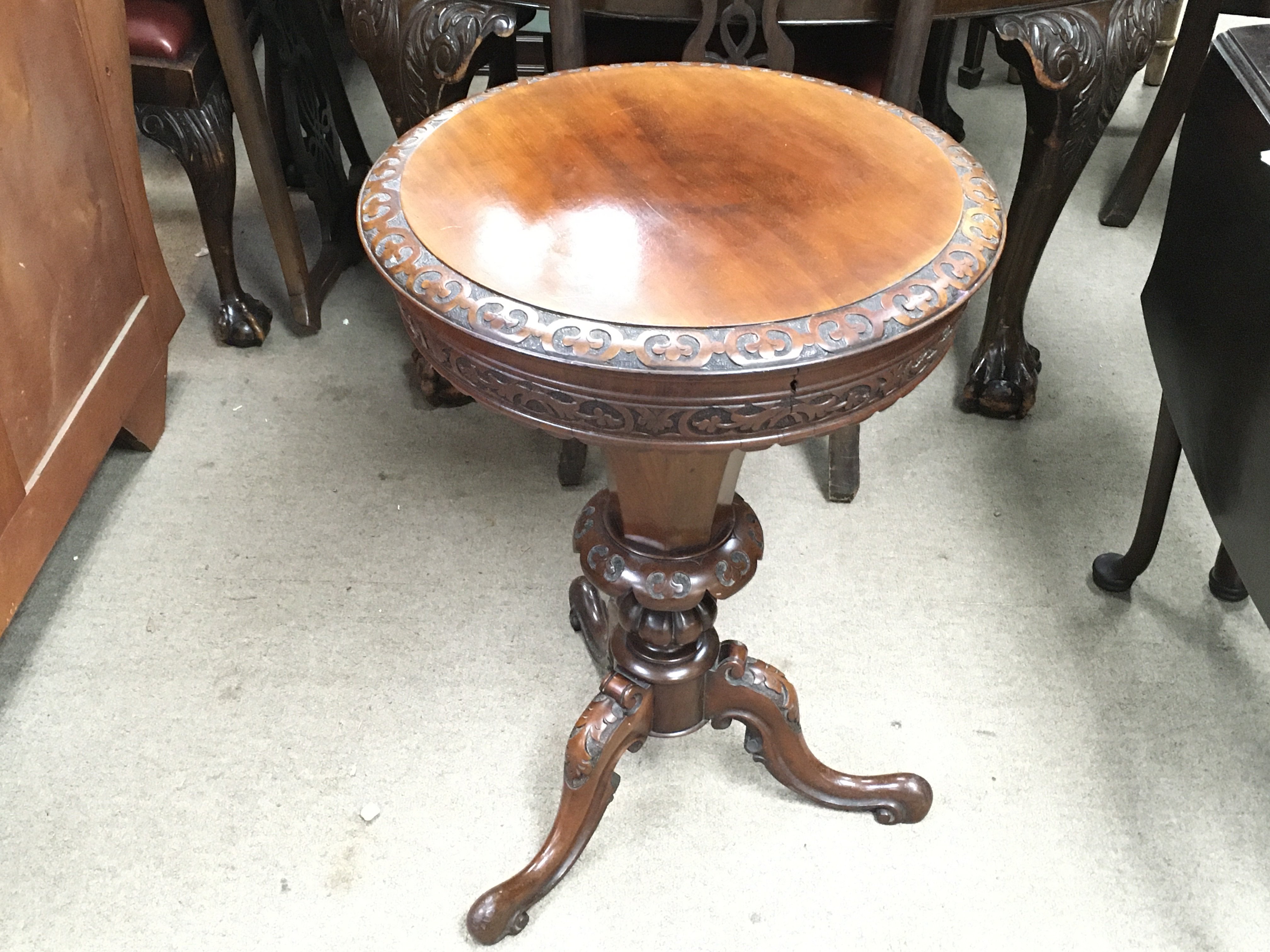 A circular mahogany sewing box. 70cm tall and 53cm diameter
