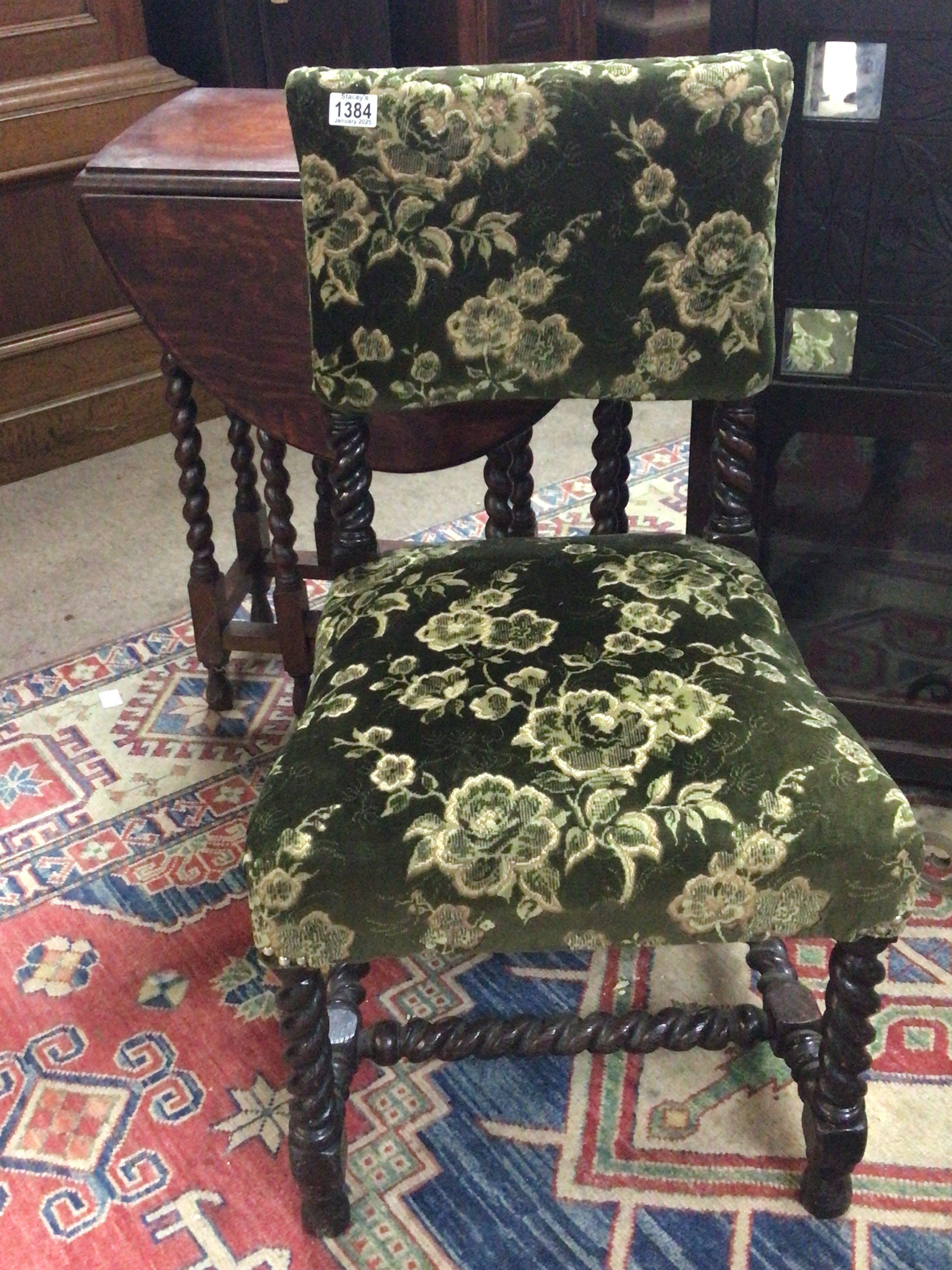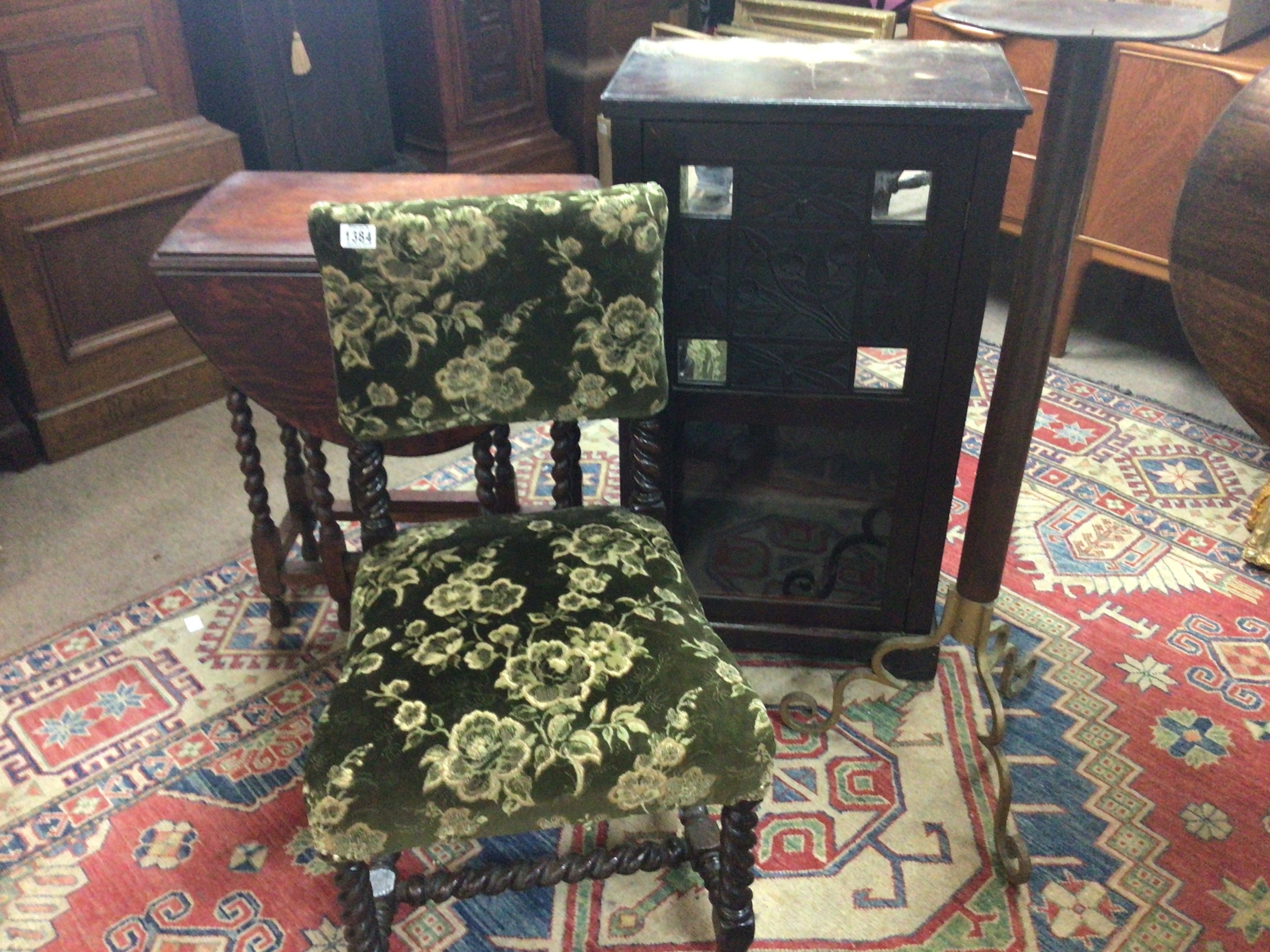A collection of furniture an oak drop leaf table a chair with barley twist supports a plant stand and music cabinet (4)