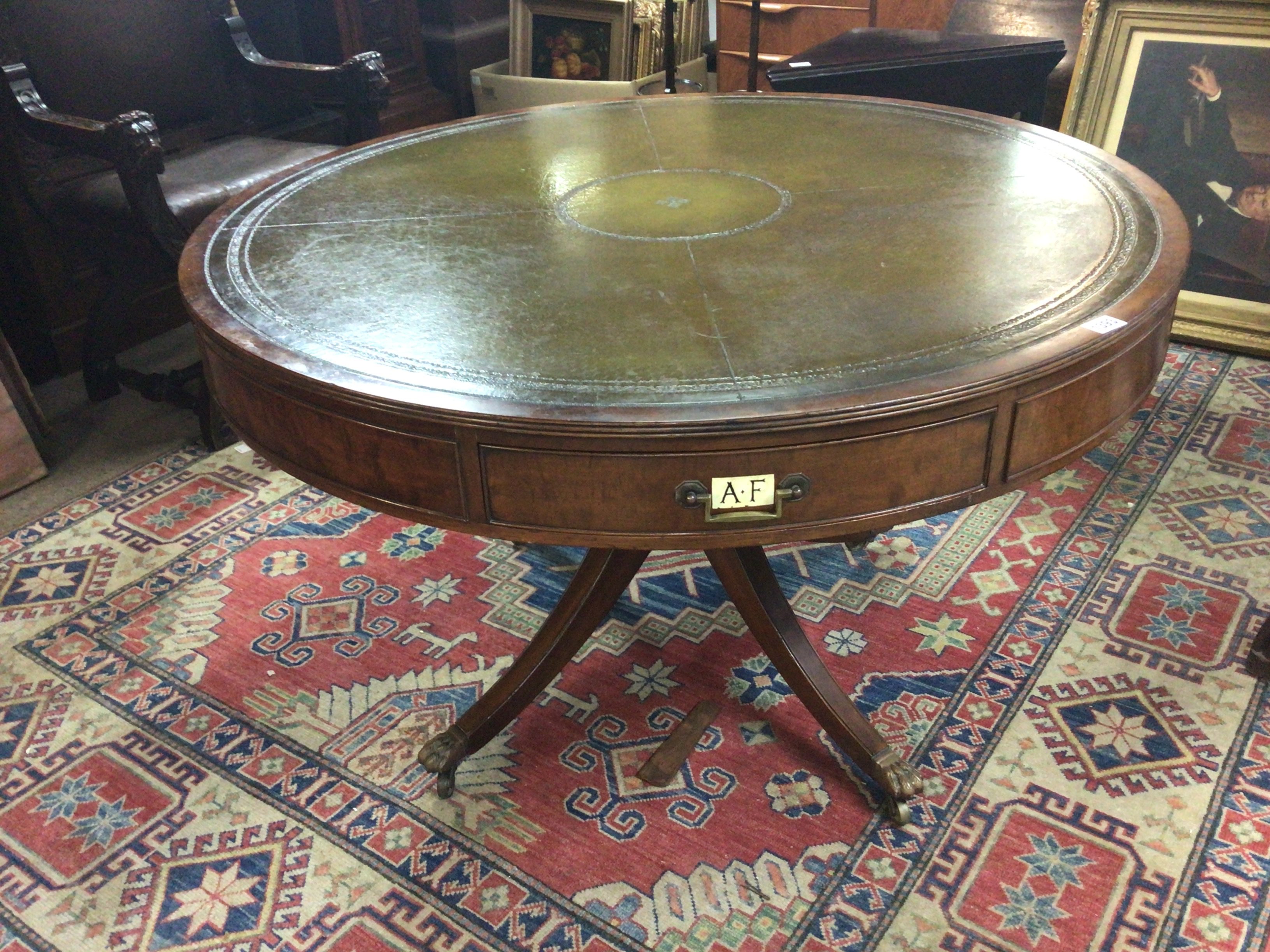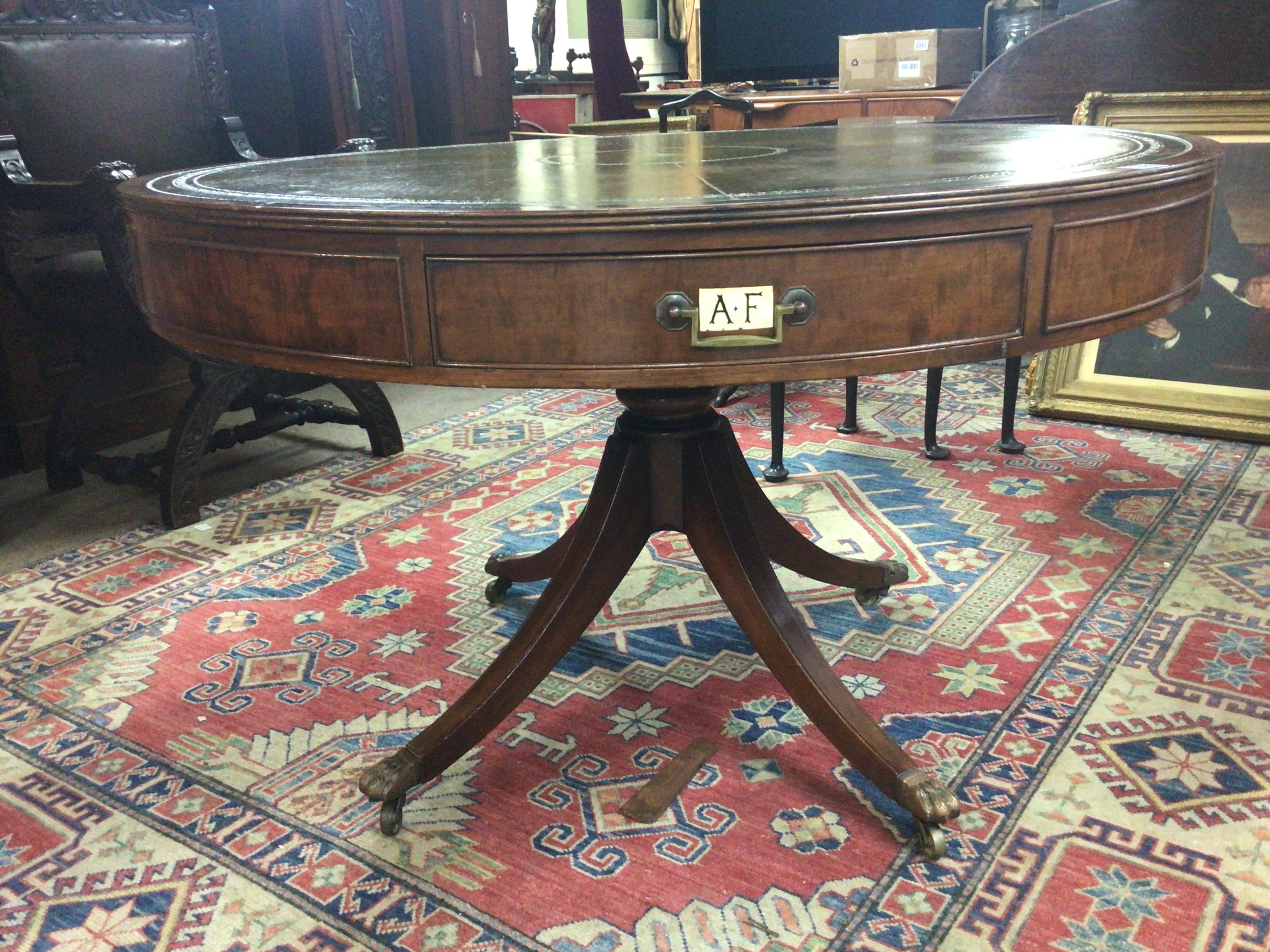 A George III style Mahogany Rent table the circular top with green leather above drawers with applied alphabet markets on a turned column and splayed legs top diameter 122cm