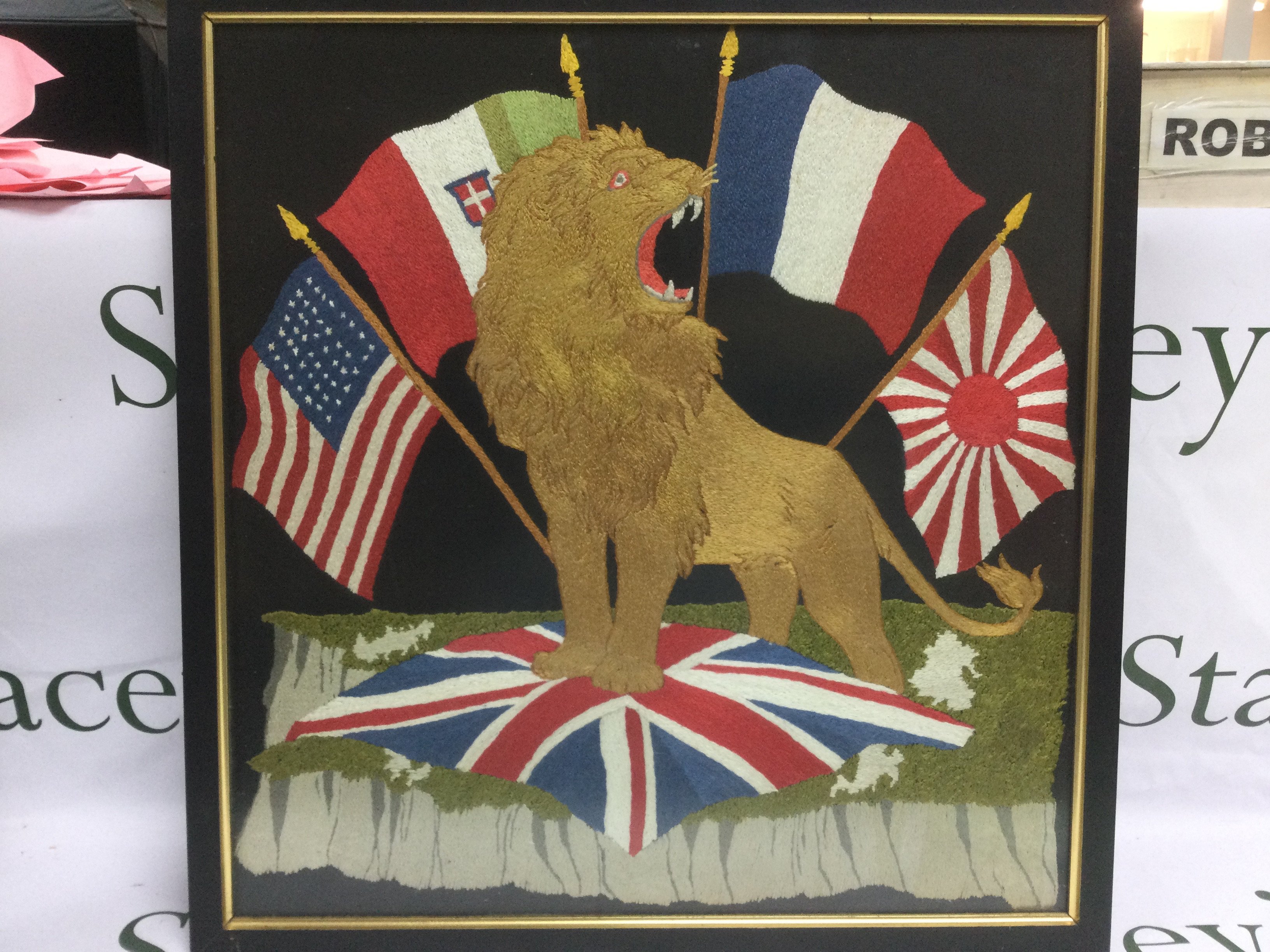 A framed and glazed WW1 embroidery of a lion amongst the flags of the allies entente, approx 46cm x 48cm. Shipping category D.
