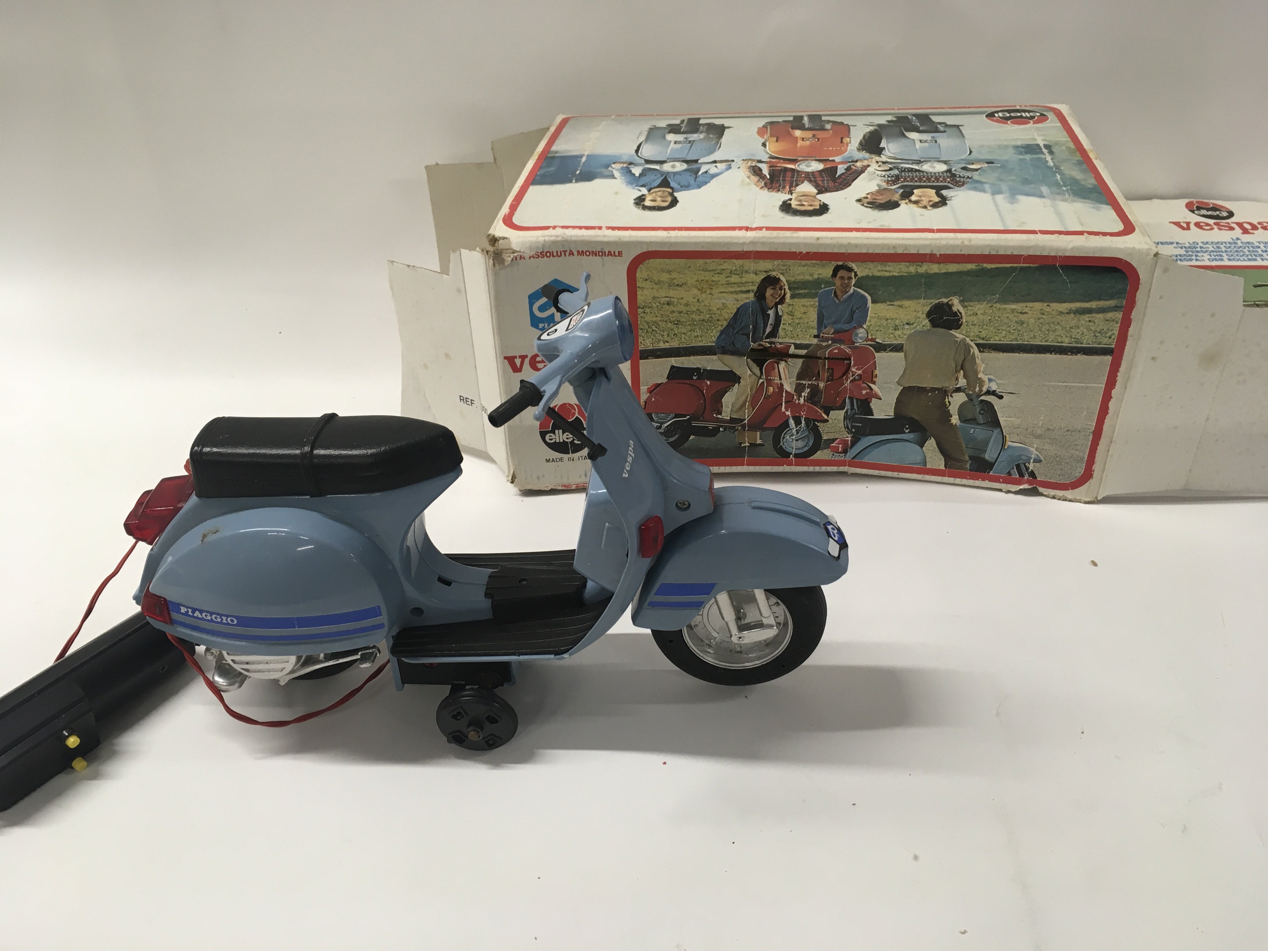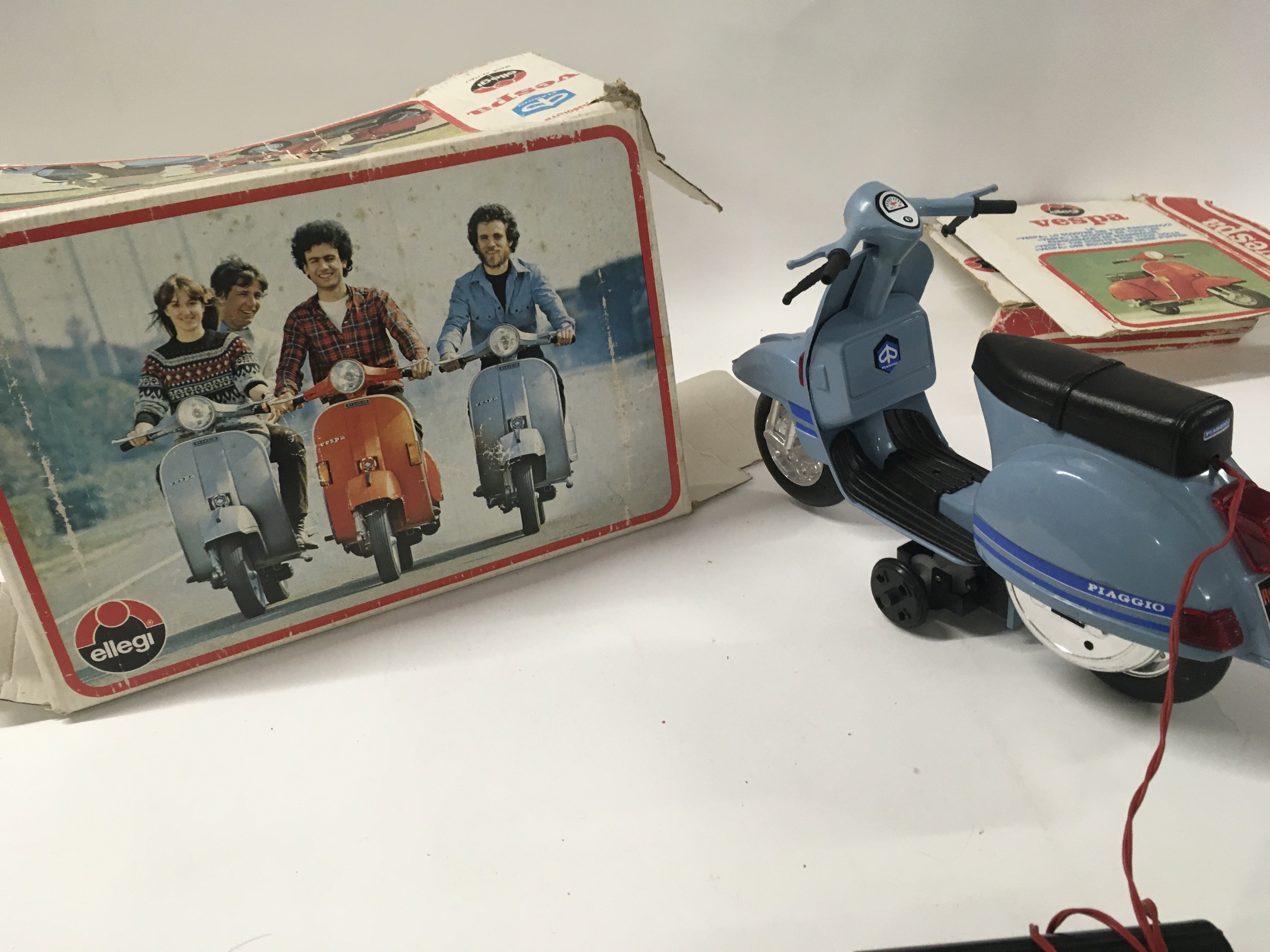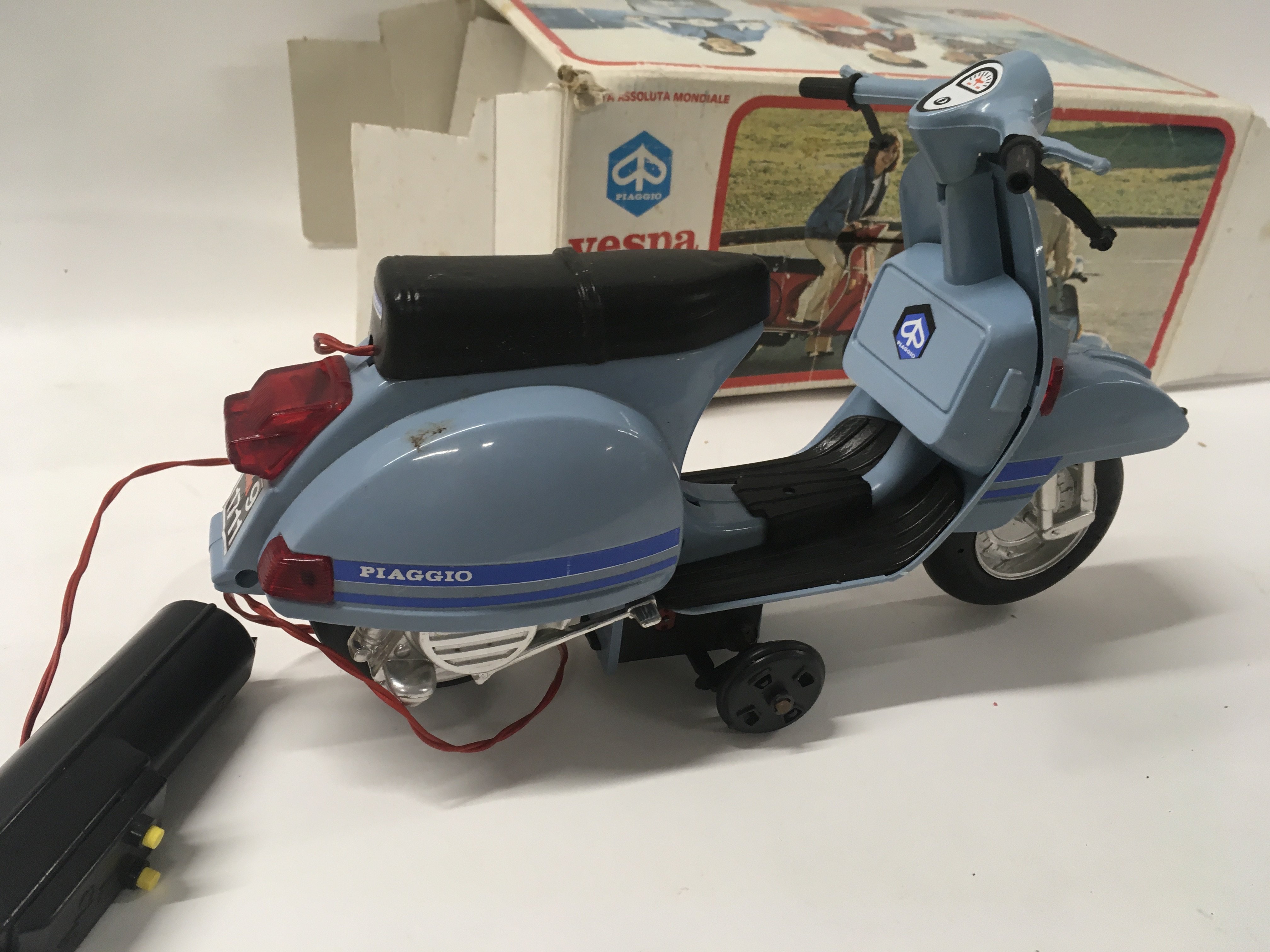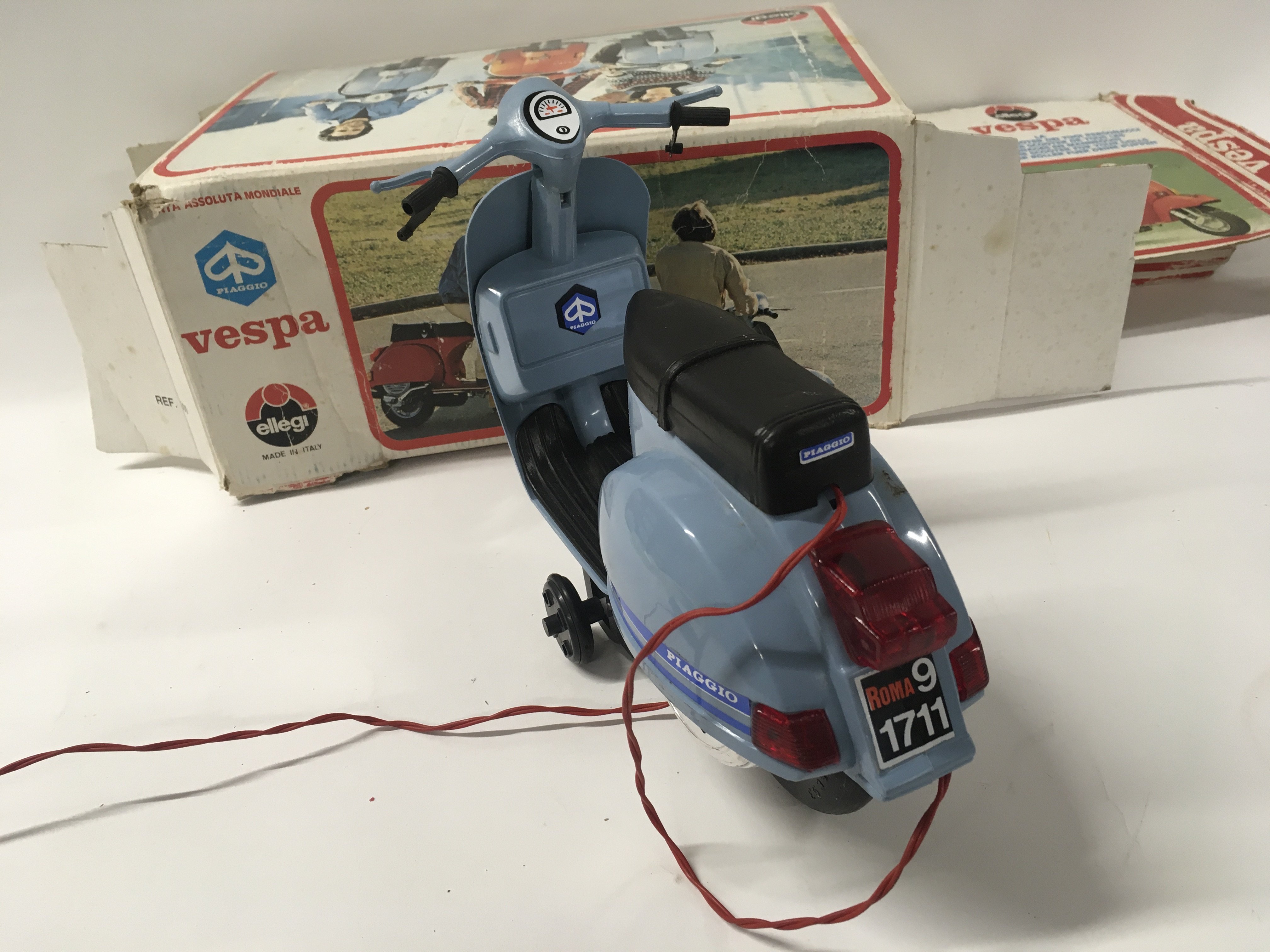 A boxed Piaggio Vespa scooter battery operated. Box in poor condition.