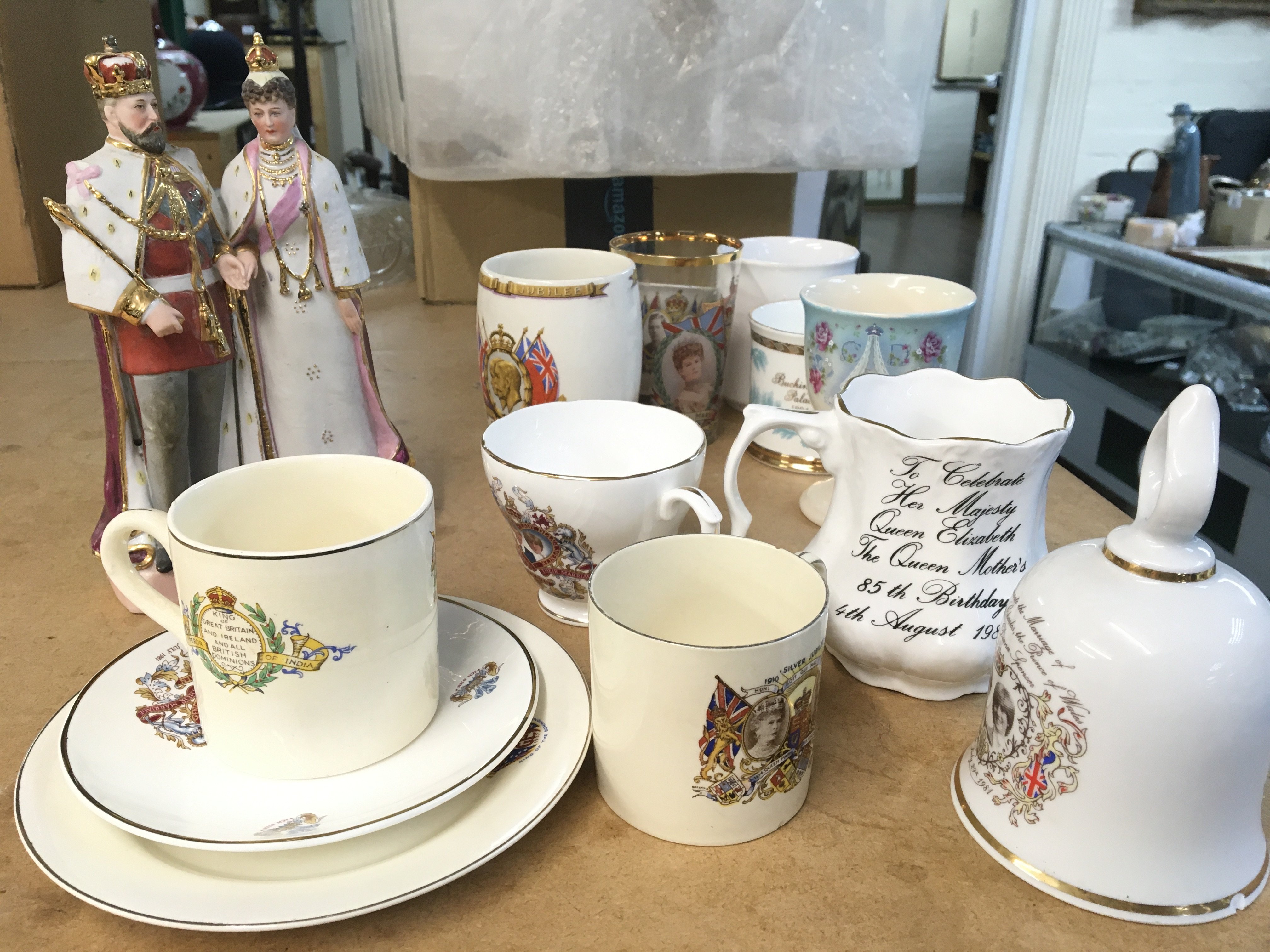 A collection of coronation ware including cups, saucers and a figure group of George V & Mary of Teck. This lot cannot be posted