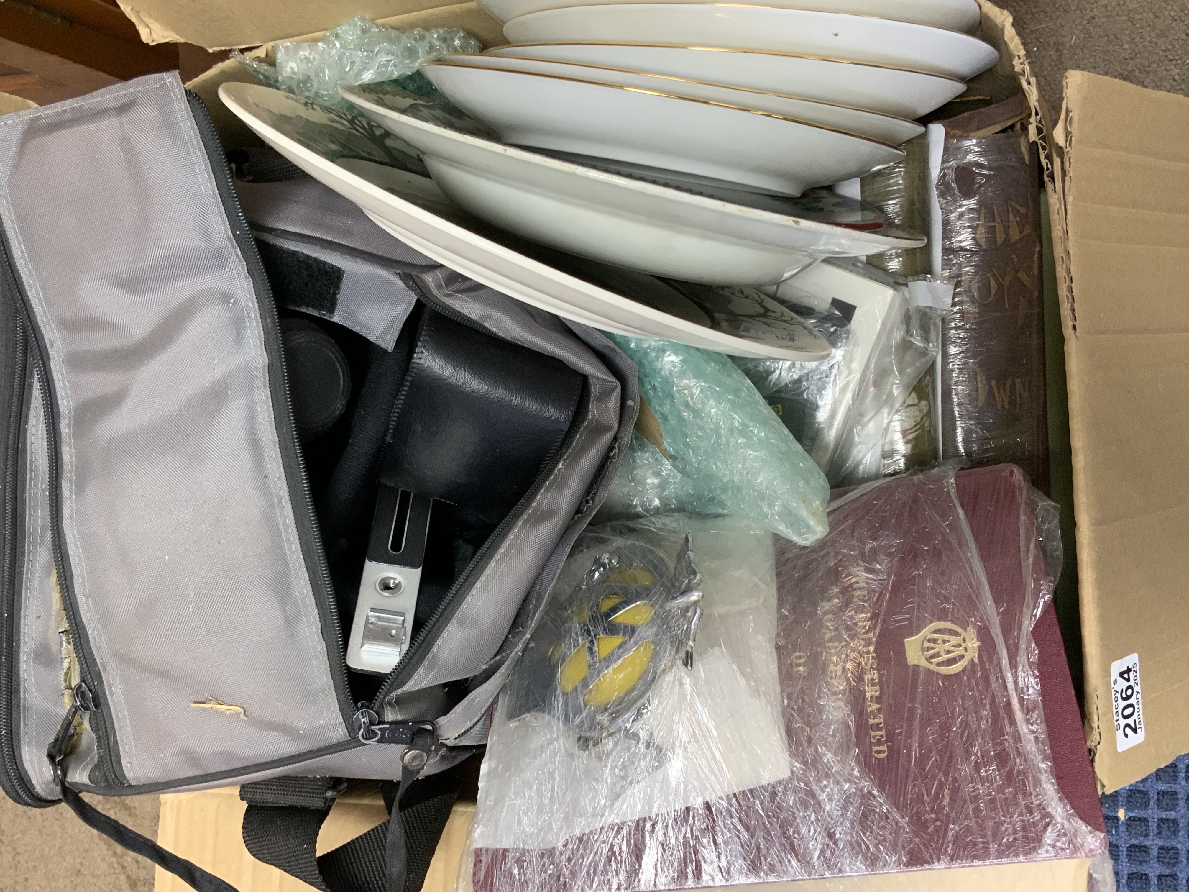 A box of mixed items, plates, cameras ephemera etc.