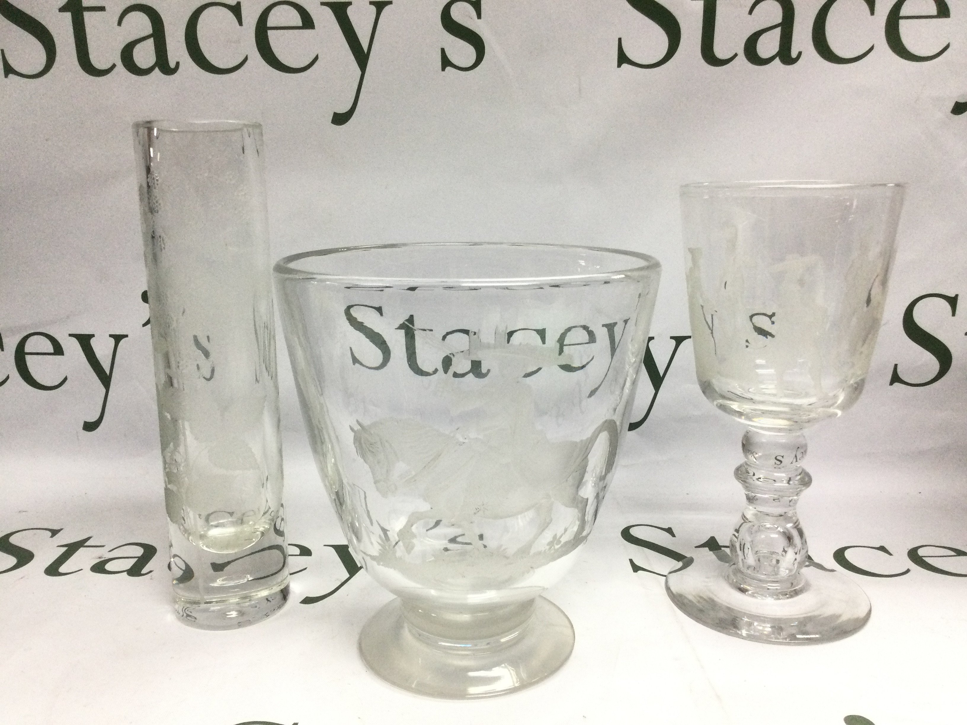Three fine quality engraved glass items comprising a glass bowl by Norman Orr, goblet and vase. Bowl approx height 18cm. Shipping category D.