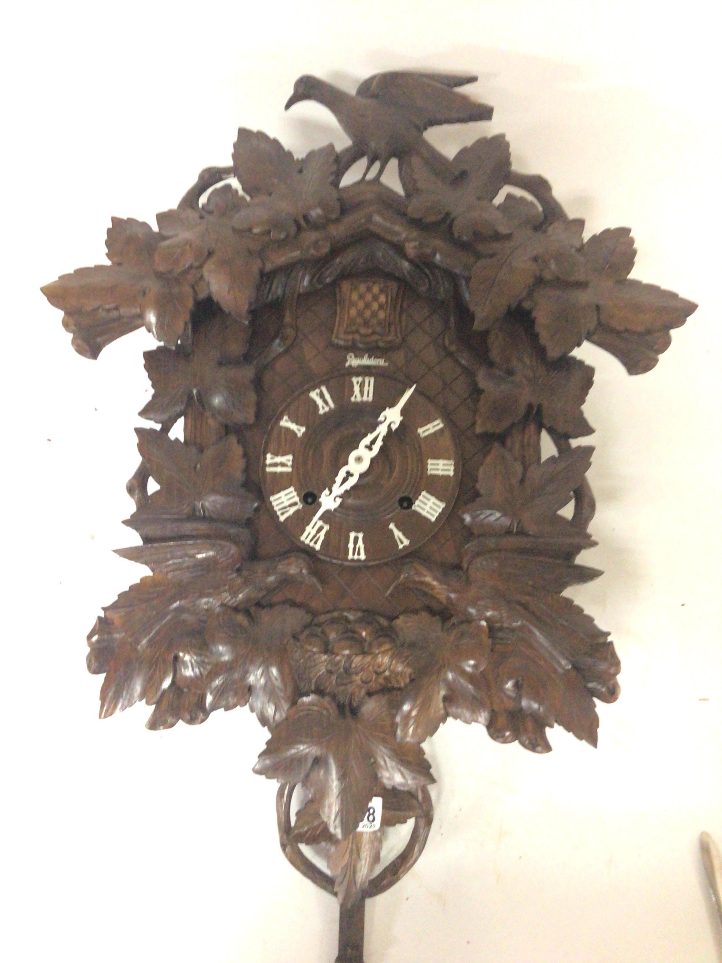 A Black forest carved wood cuckoo wall clock with applied and carved foliage. 70cm top to base