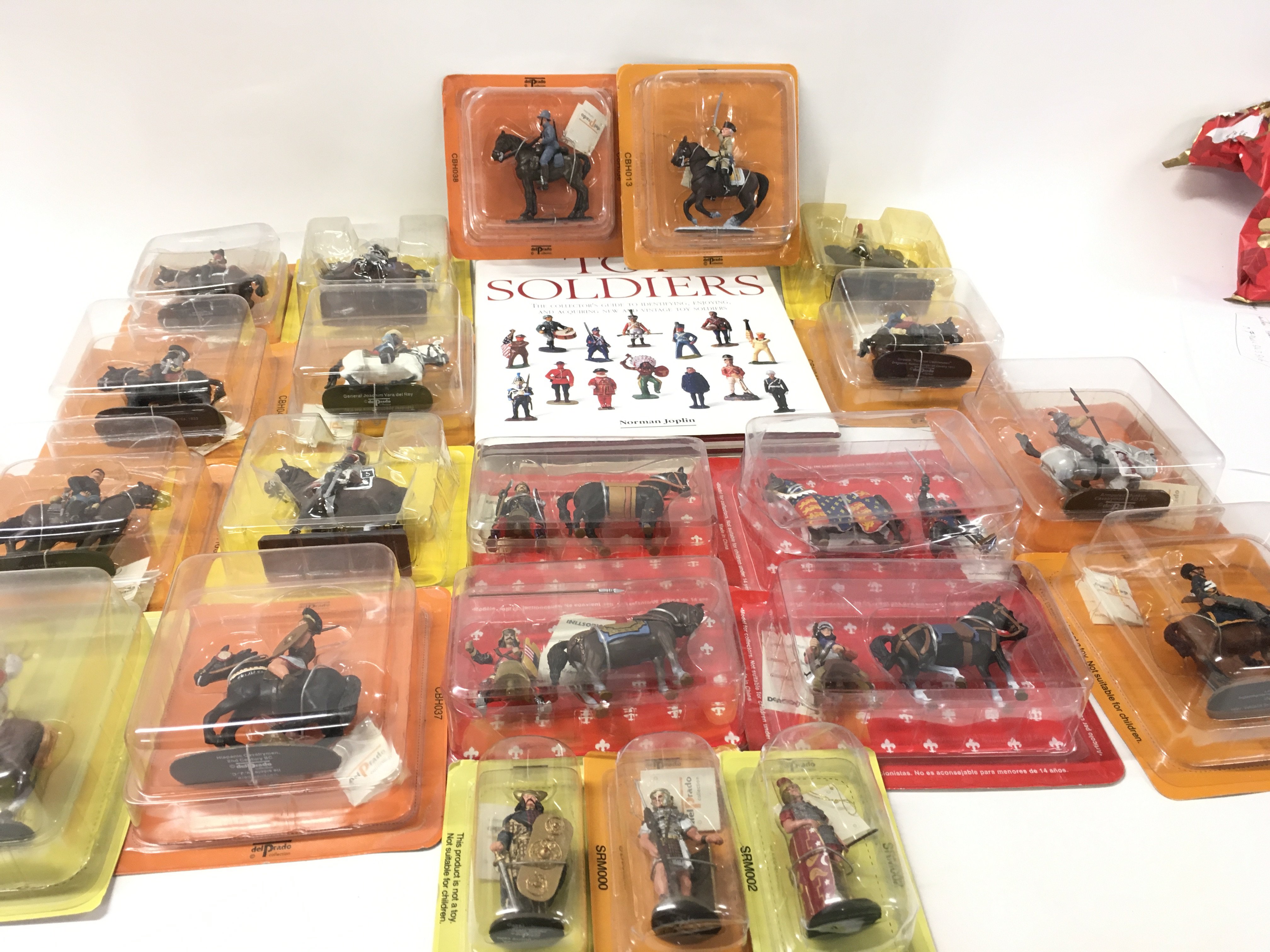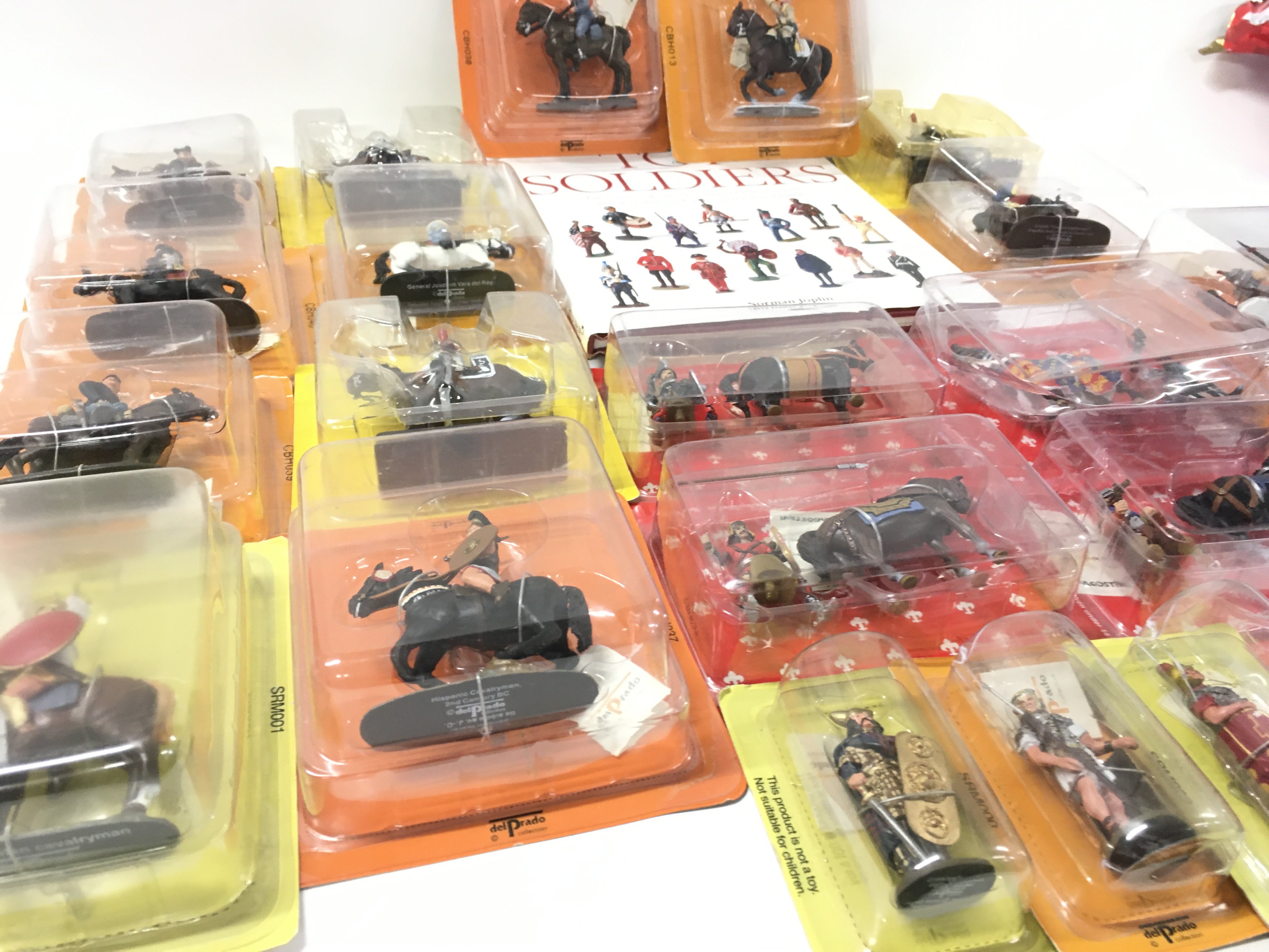 A collection in excess of 20 military figures through the ages mostly mounted with horse by delPrado Included 2 books detailing toy soldiers. No reserve