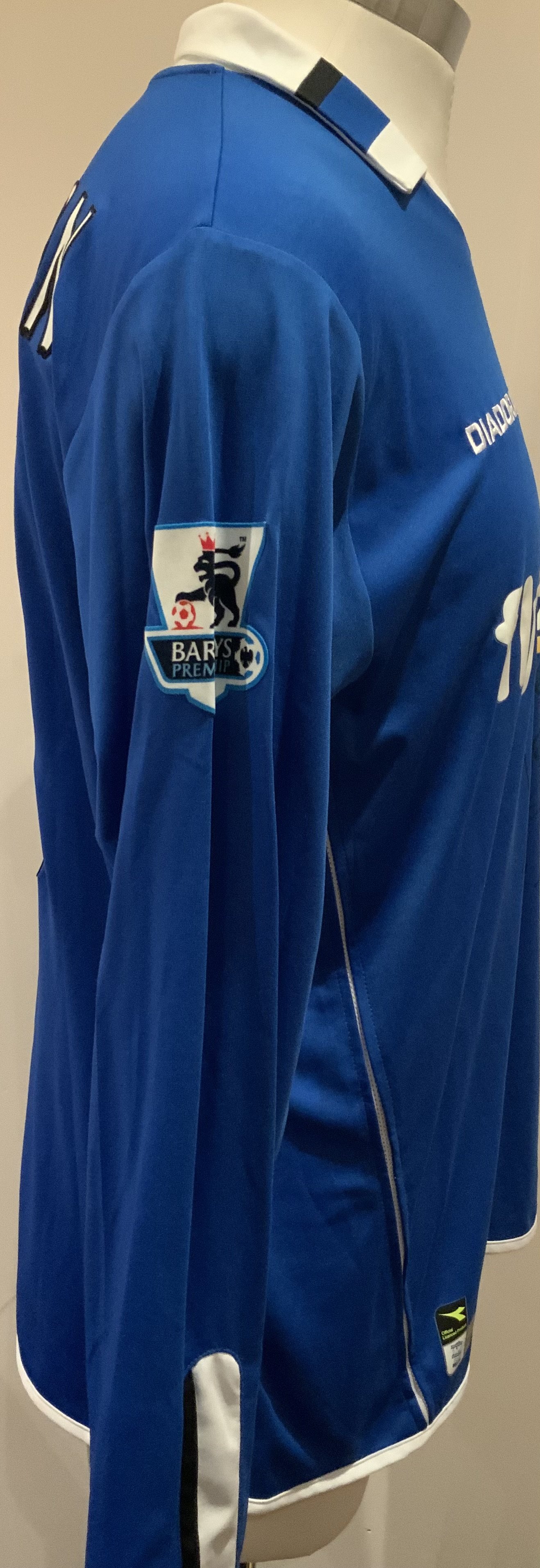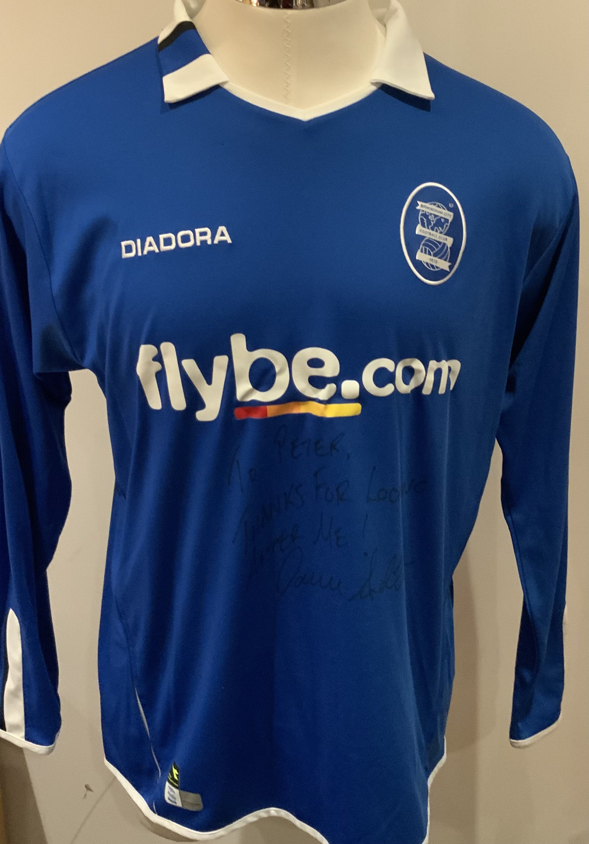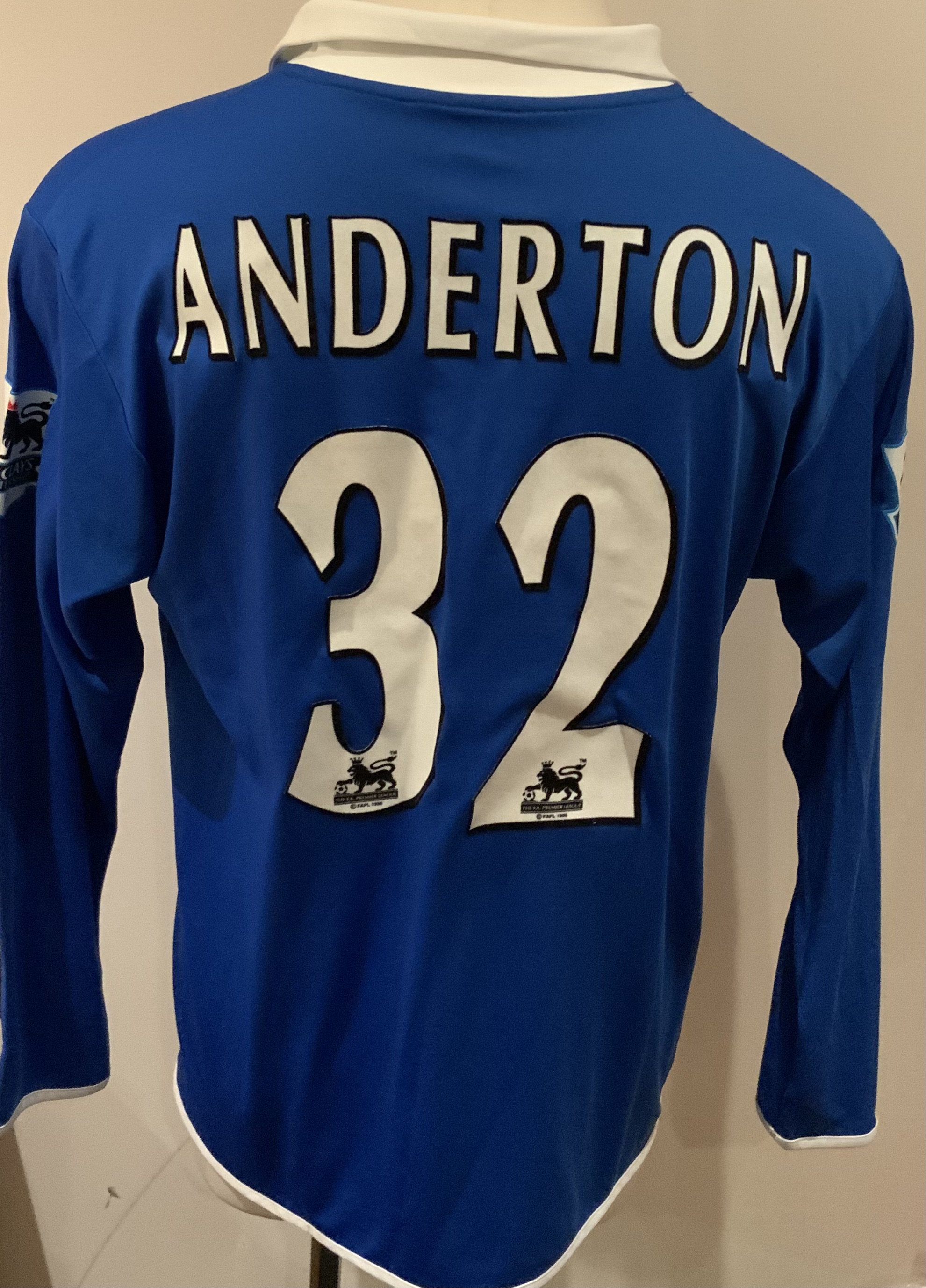 Birmingham City 2004 - 2005 Match Worn Football Shirt: Blue long sleeve shirt with Premier League badges to sleeves. Anderton 32 to rear. Signed by player with dedication.
