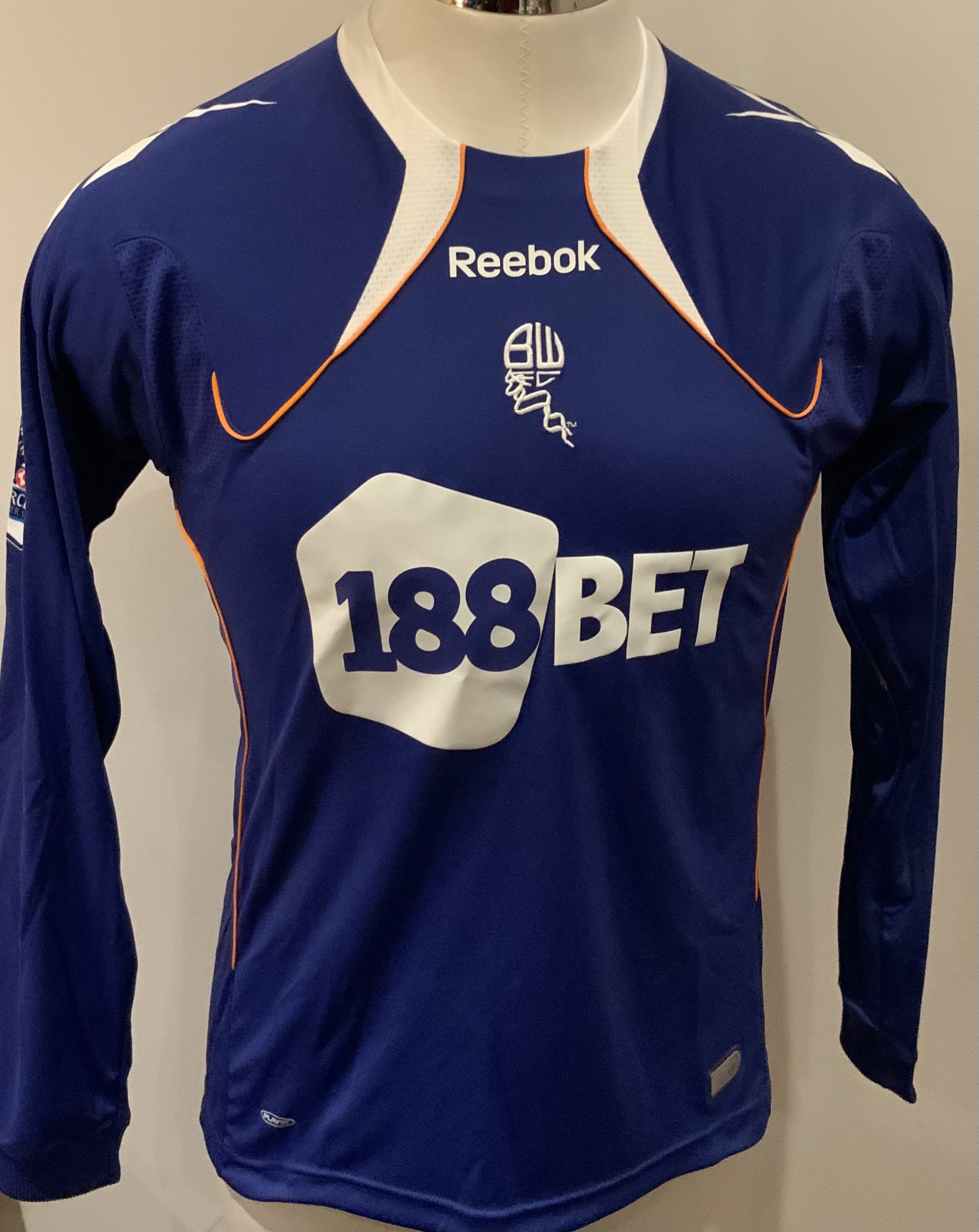 Bolton Wanderers 2010 - 2011 Match Worn Football Shirt: Blue long sleeve shirt with Premier League badges to sleeves. C Y Lee 27 to rear.