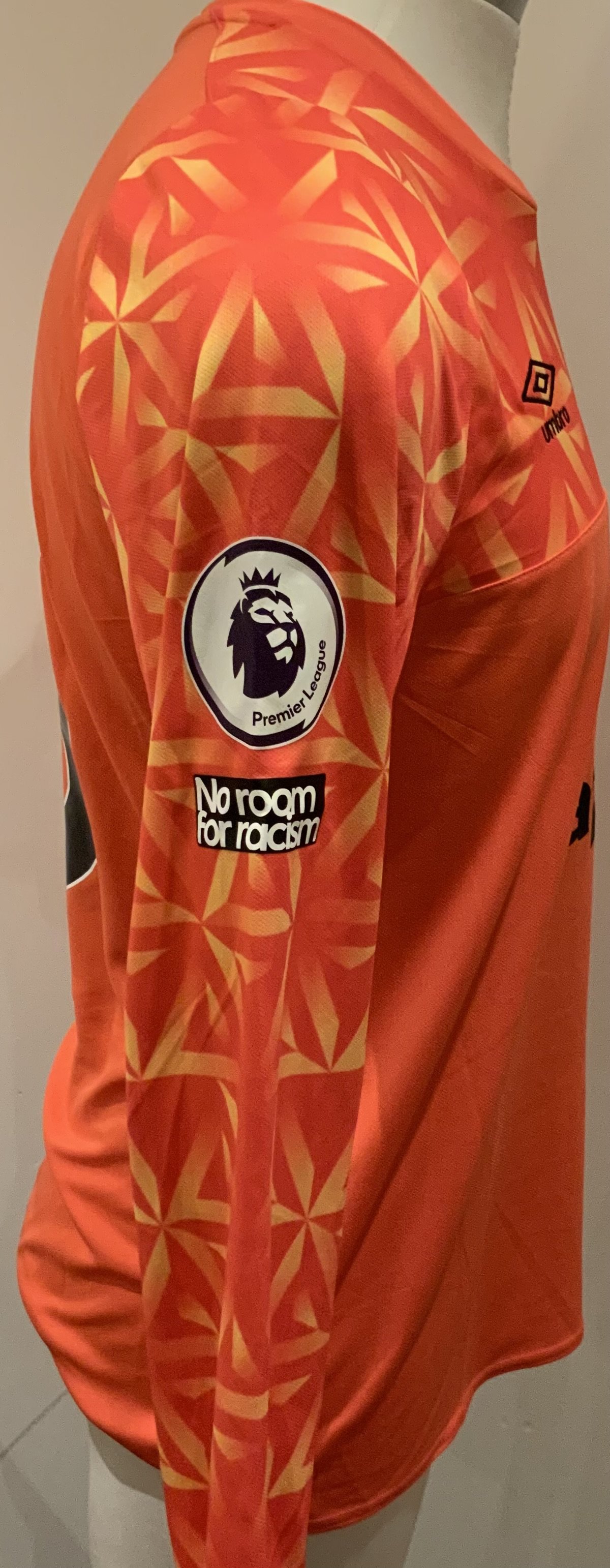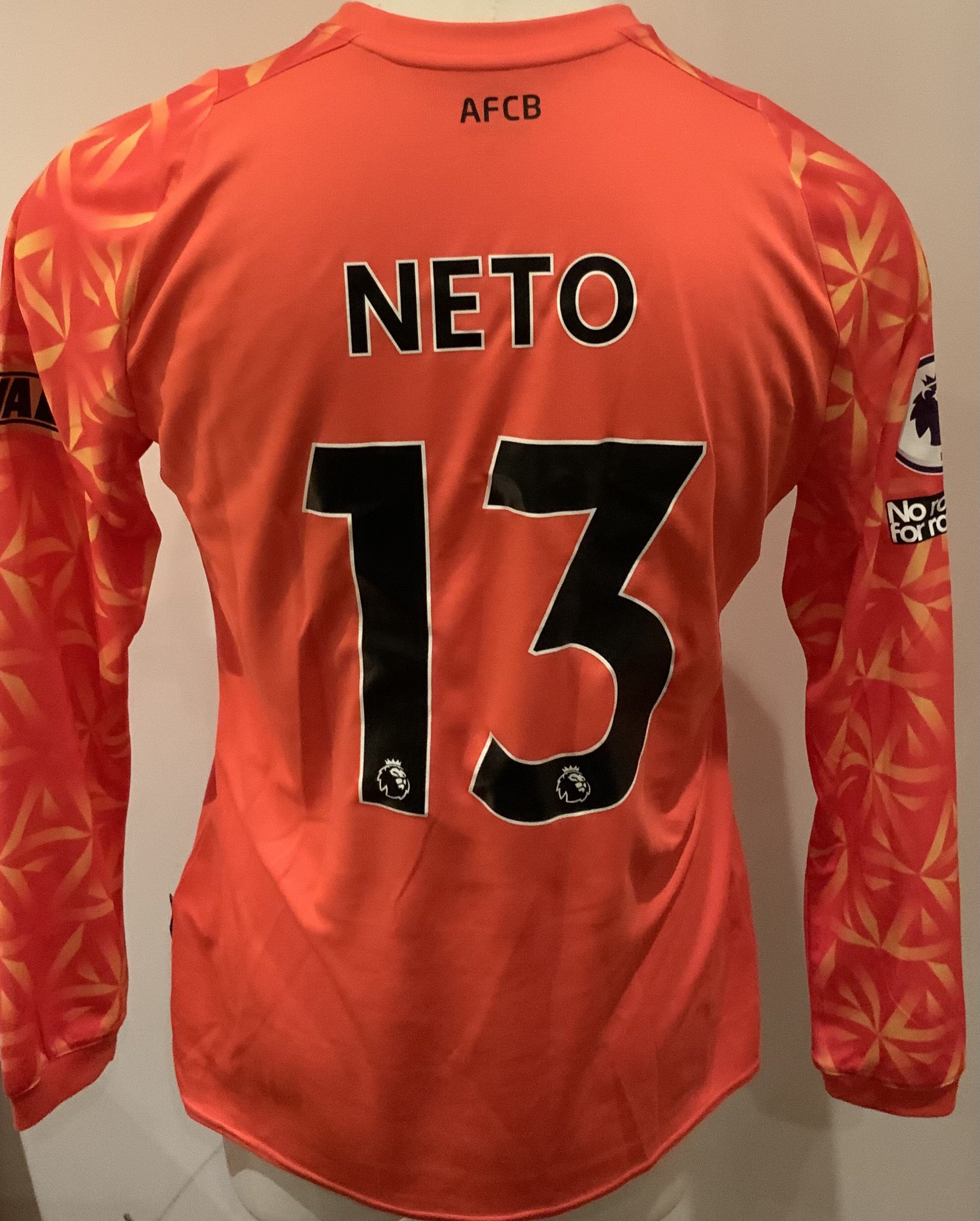 Bournemouth 2022 - 2023 Match Worn Football Shirt: Orange long sleeve goalkeeper shirt with Premier League badges to sleeves. Neto 13 to rear.