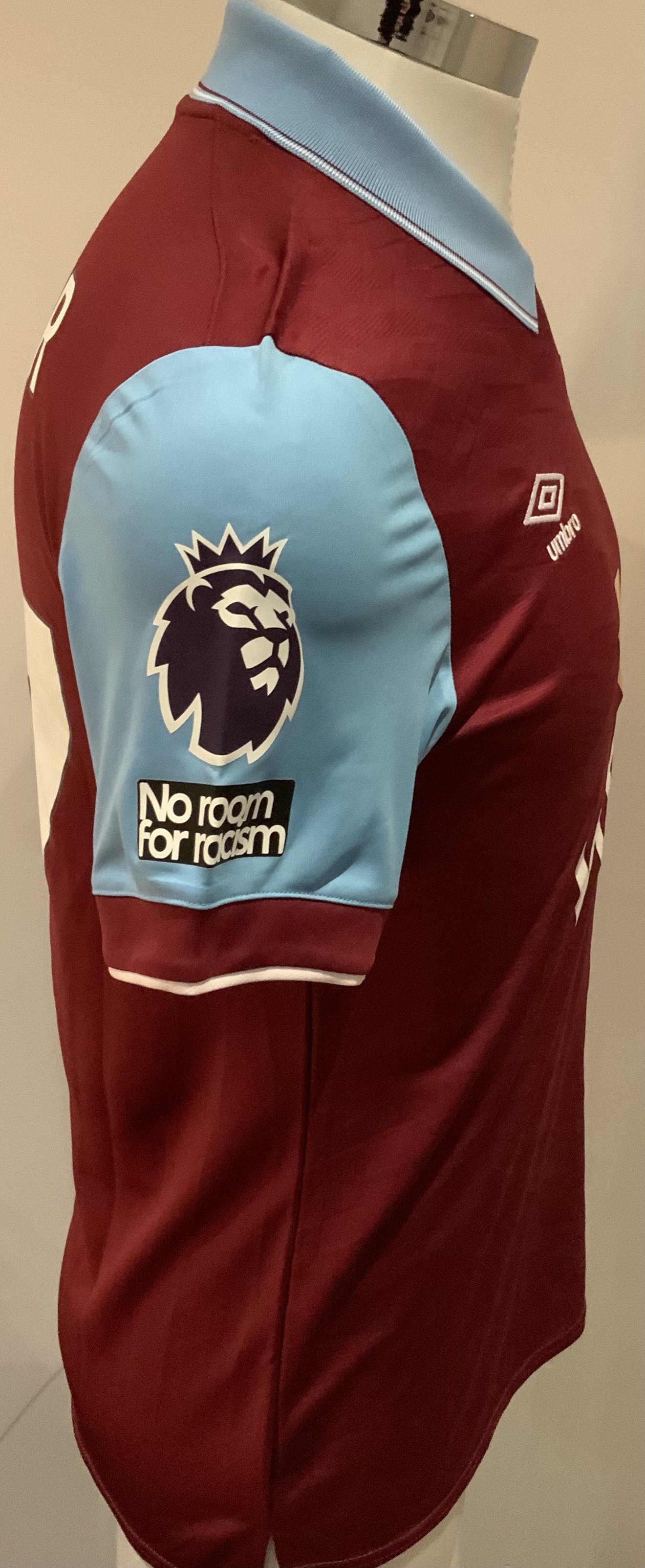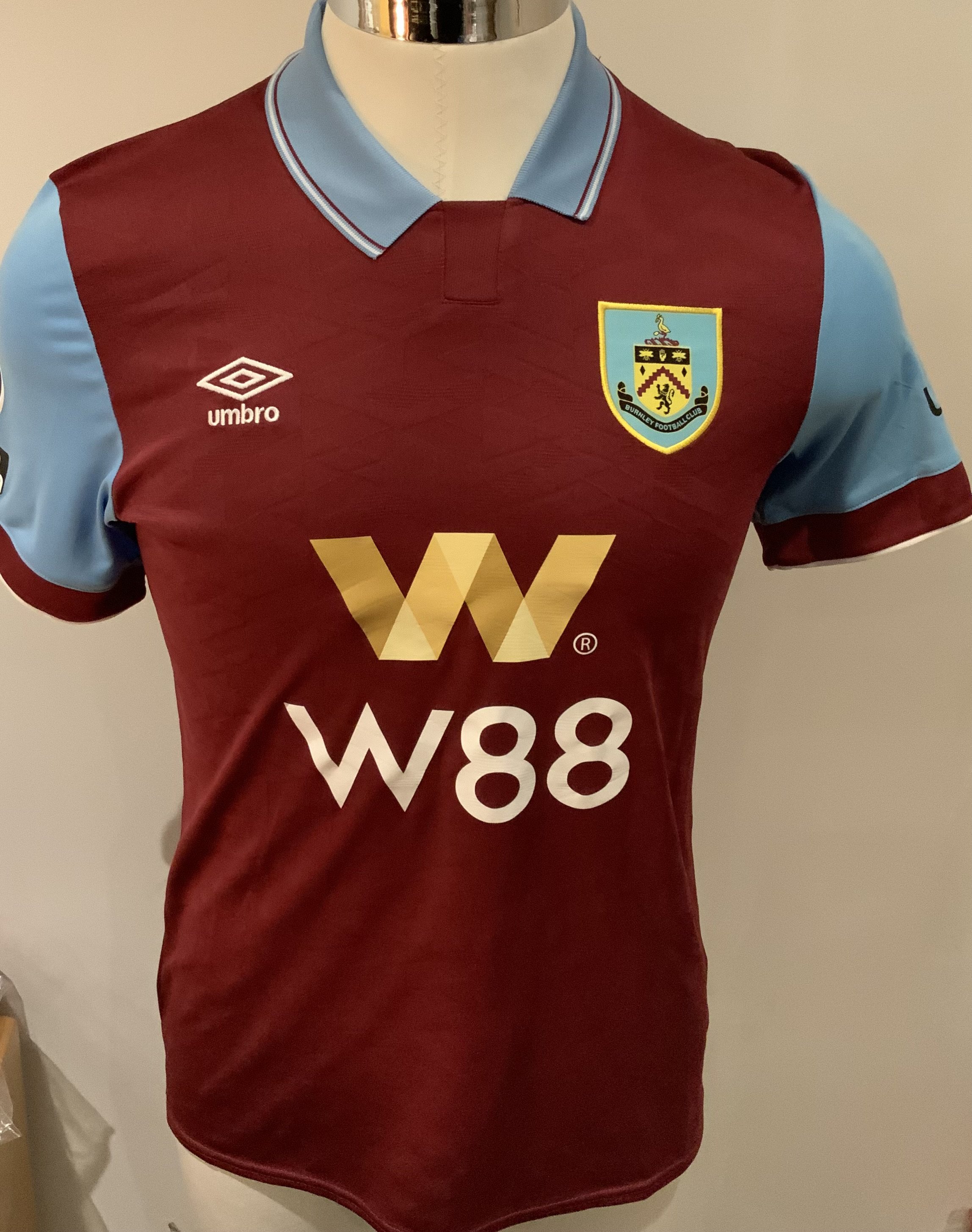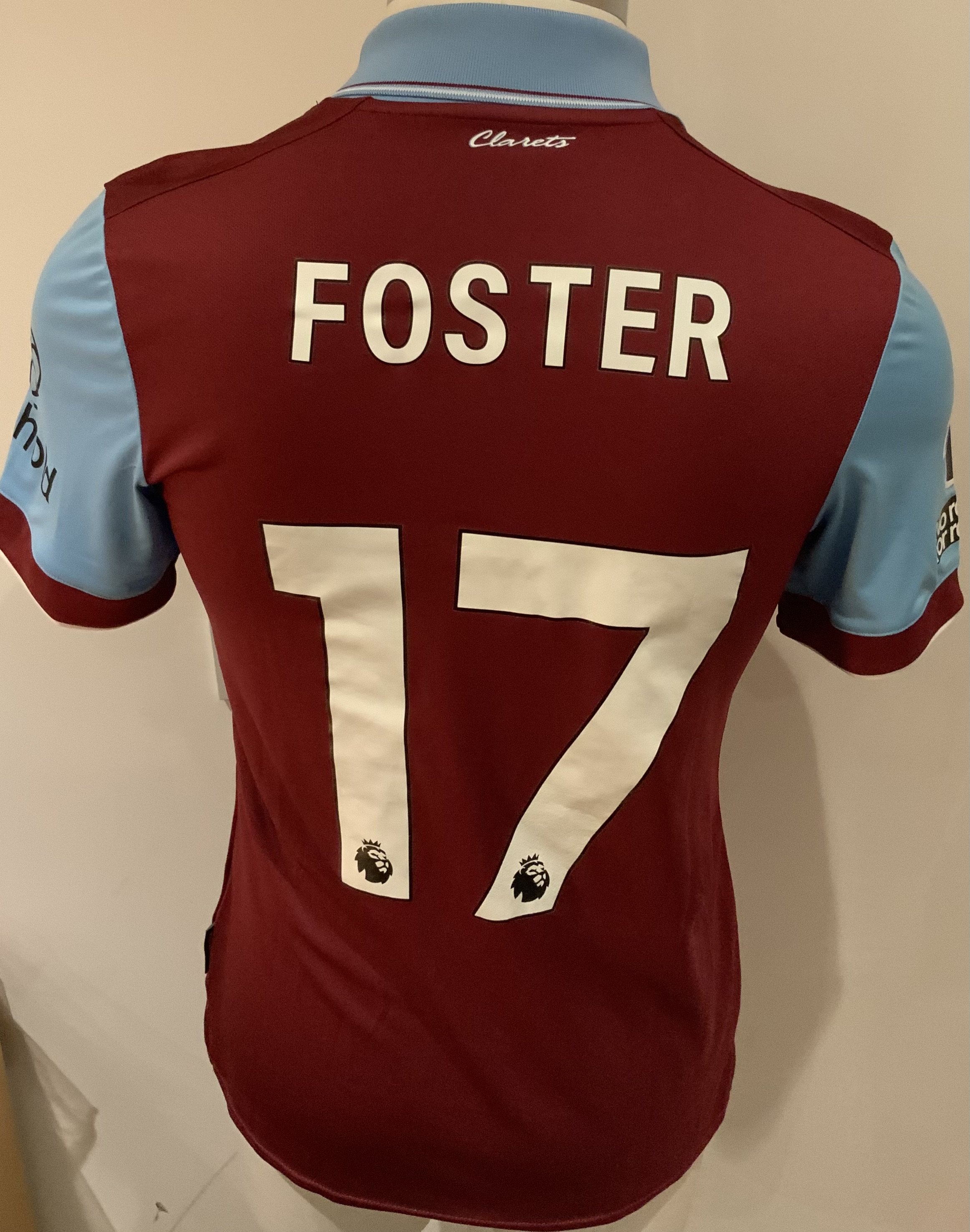Burnley 2023 - 2024 Match Worn Football Shirt: Claret and blue short sleeve shirt with Premier League badges to sleeves. Foster 17 to rear. Worn v Tottenham on 2 September 2023. Player scored in the match.