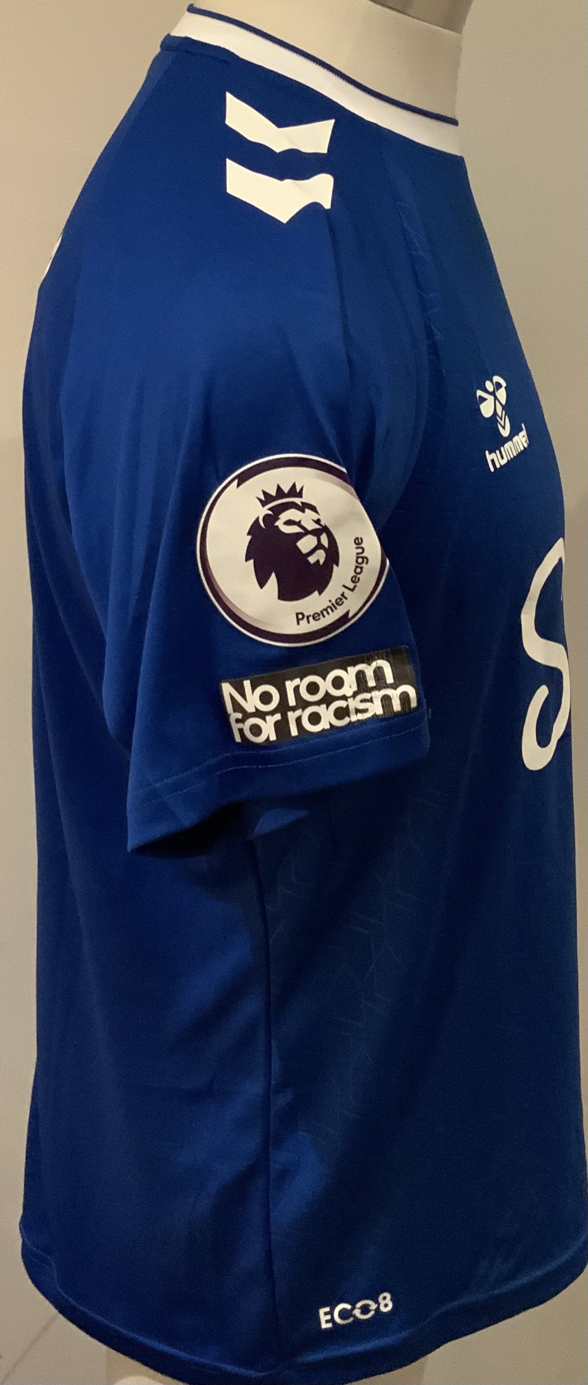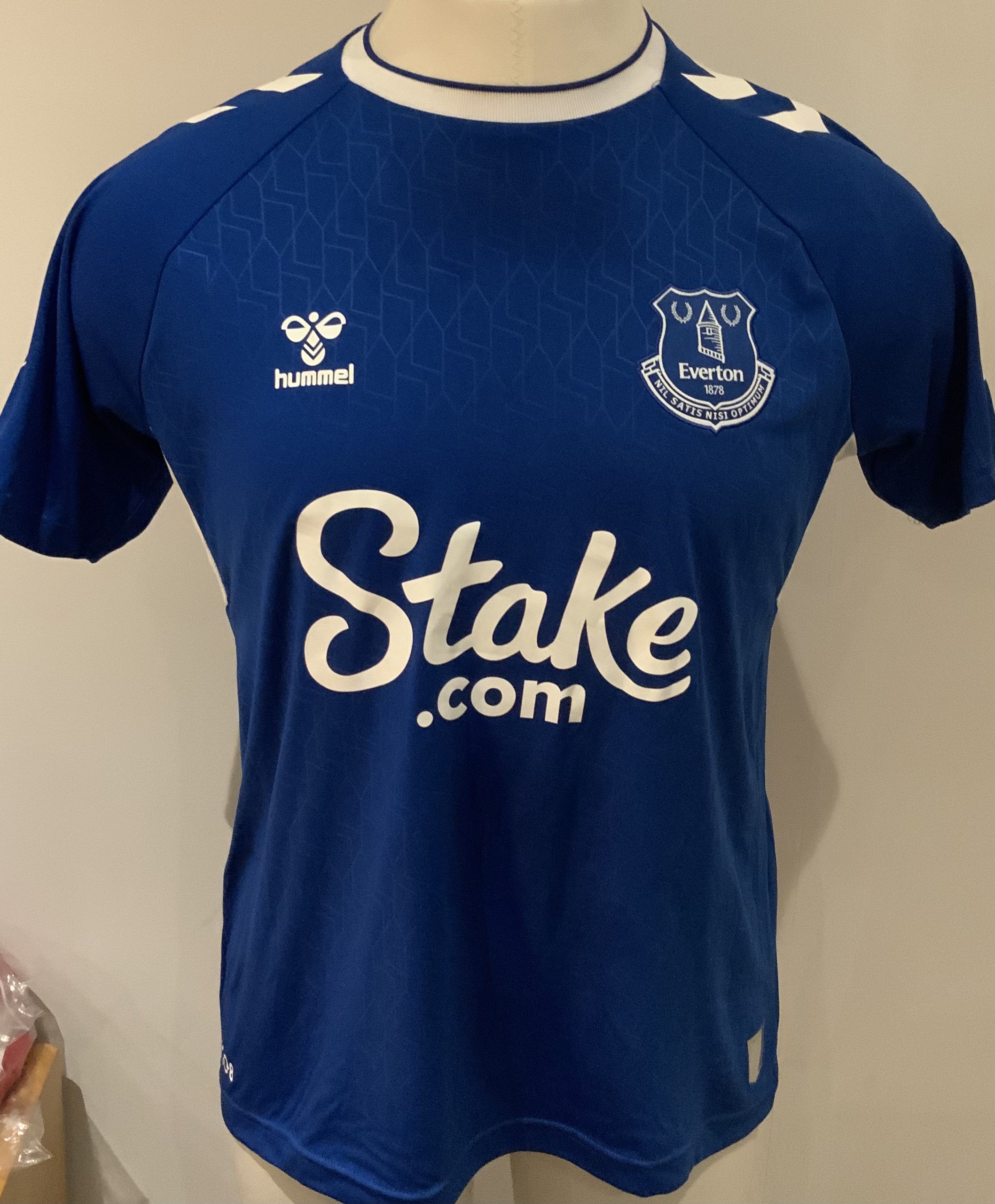 Everton 2022 - 2023 Match Worn Football Shirt: Blue short sleeve shirt with Premier League badges to sleeves. Onana 8 to rear. Worn v Tottenham on 15 October 2022.