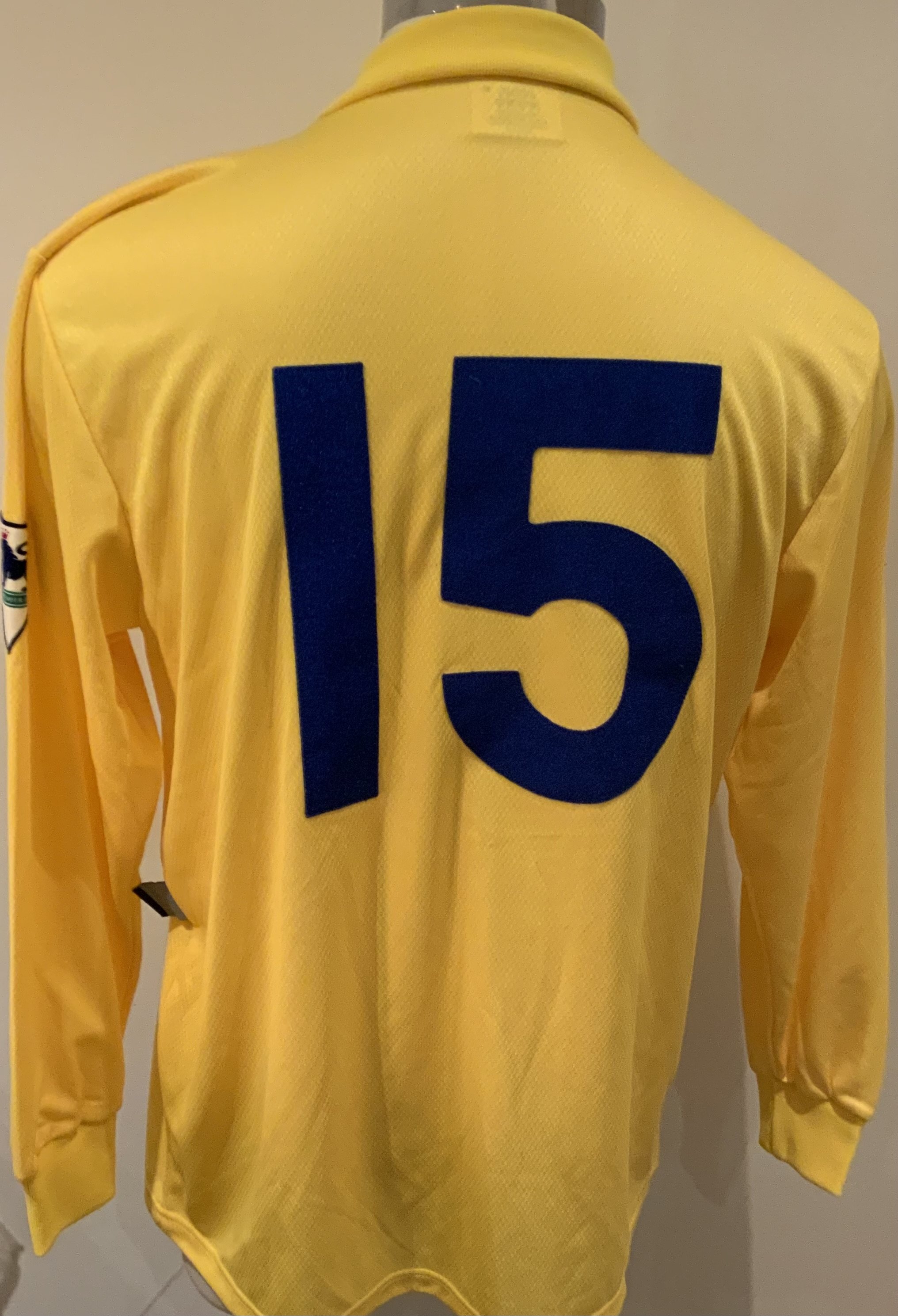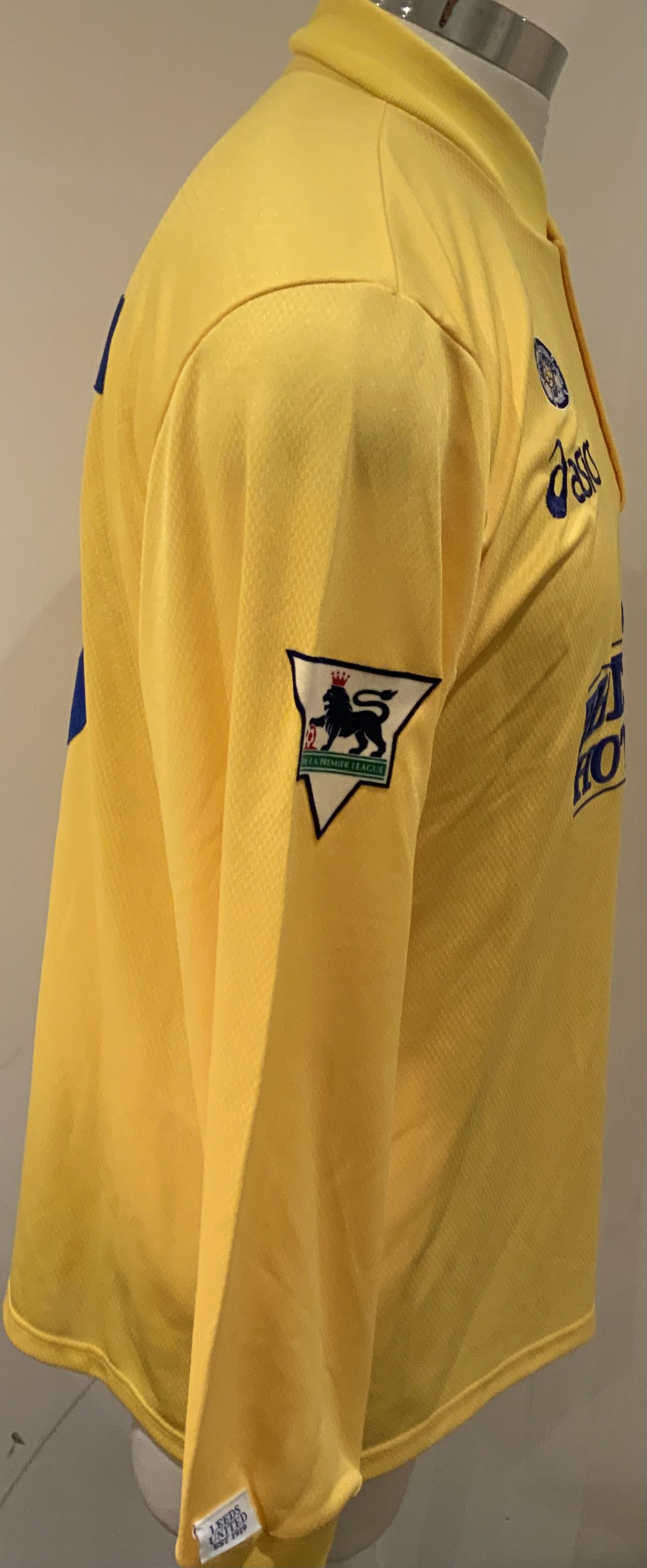 Leeds 1995 - 1996 Match Worn Football Shirt: Yellow long sleeve shirt with Premier League badges to sleeves. Number 15 to rear. Worn during the season by Nigel Worthington.