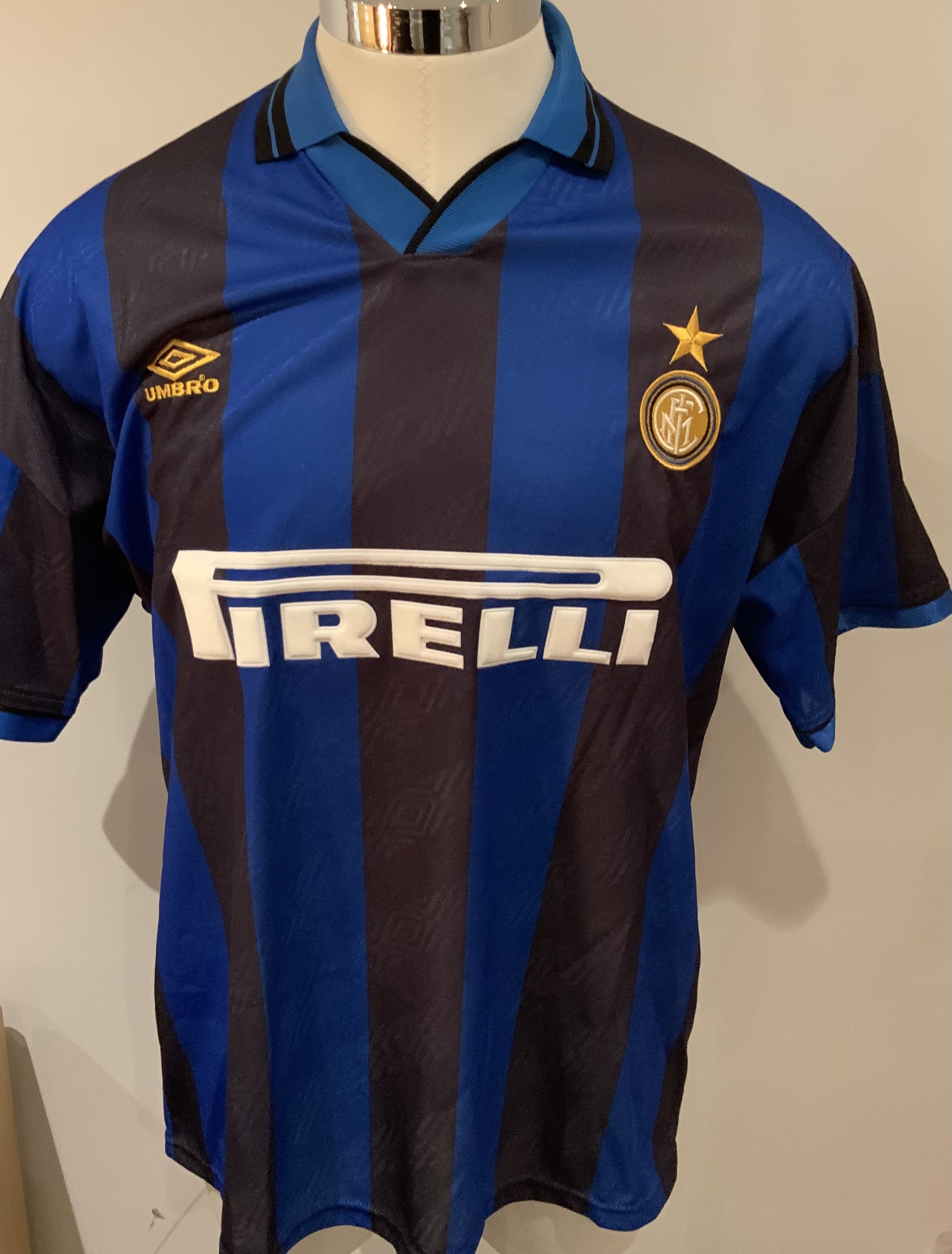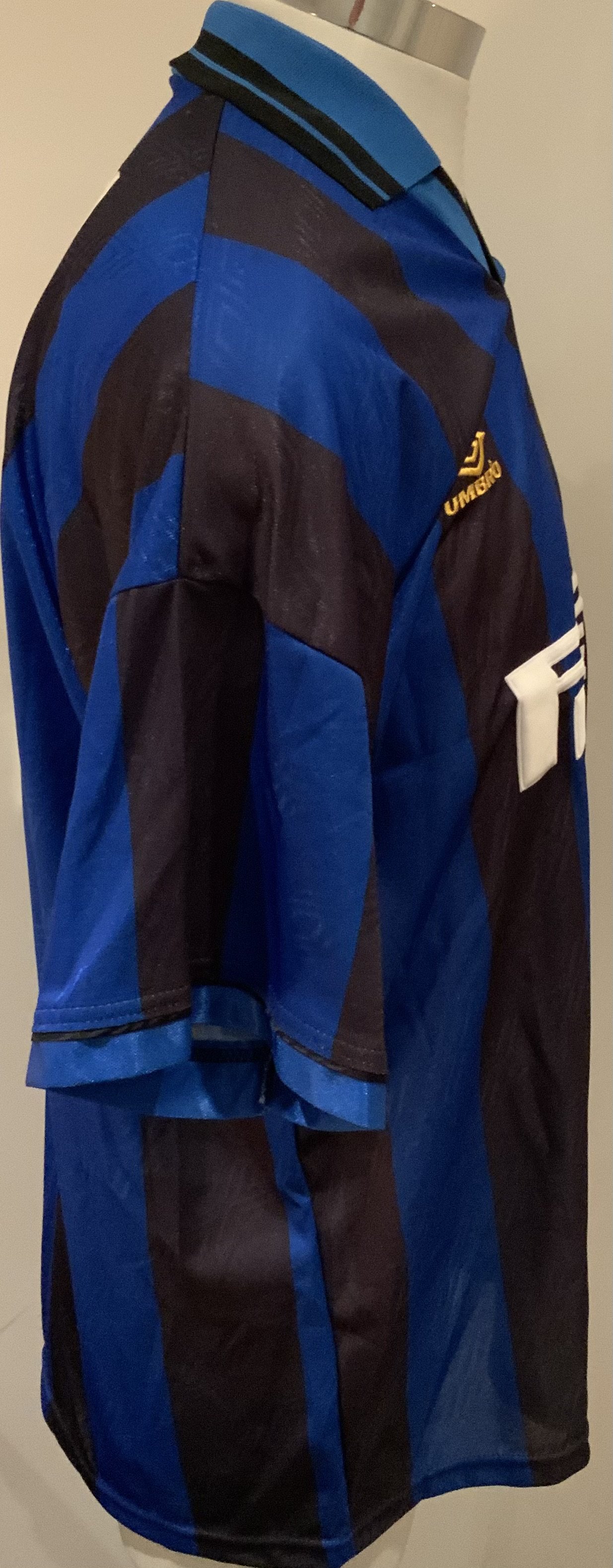 WITHDRAWN - Inter Milan 1995 - 1996 Match Worn Football Shirt: Blue and black short sleeve shirt with Berti 18 to rear. Worn v Arsenal in the friendly on 10 August 1995. Berti captained Milan in the game which also featured Denis Bergkamp debut for Arsenal. The match finished 0-0.