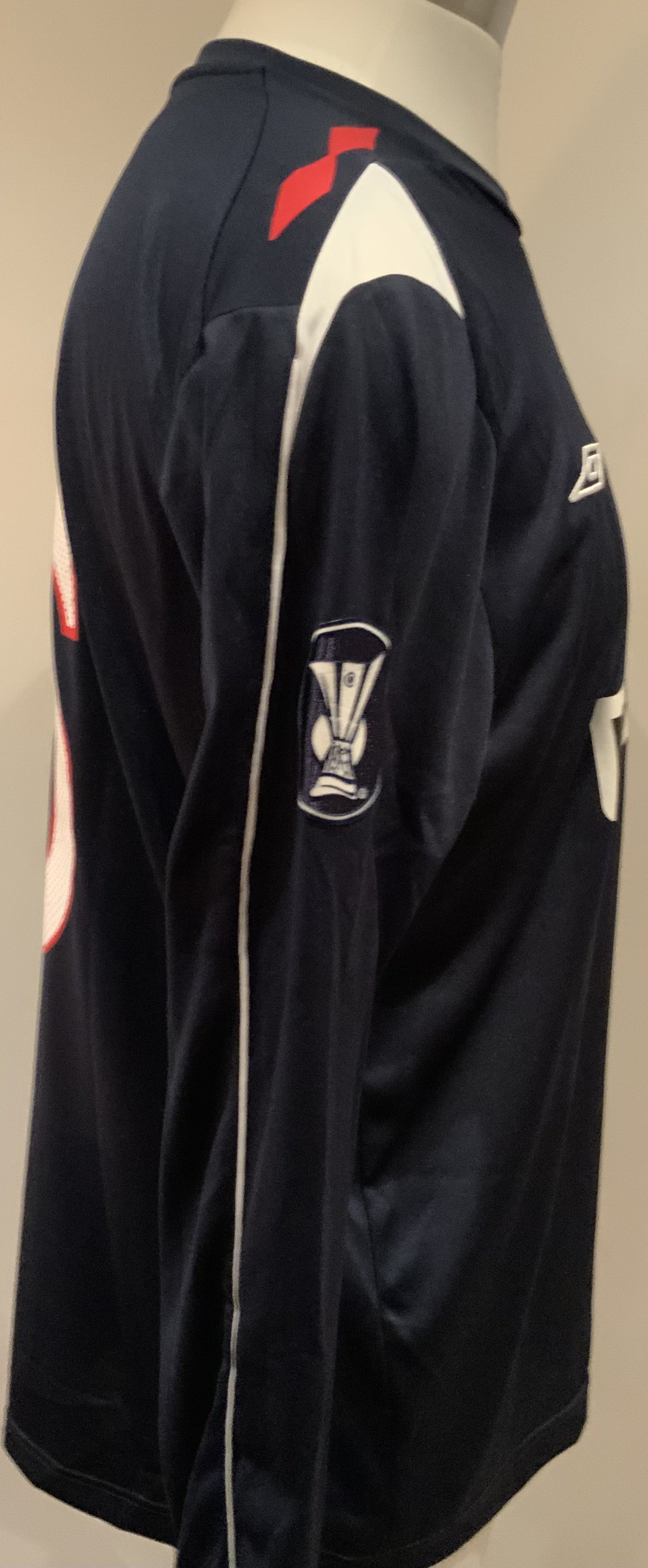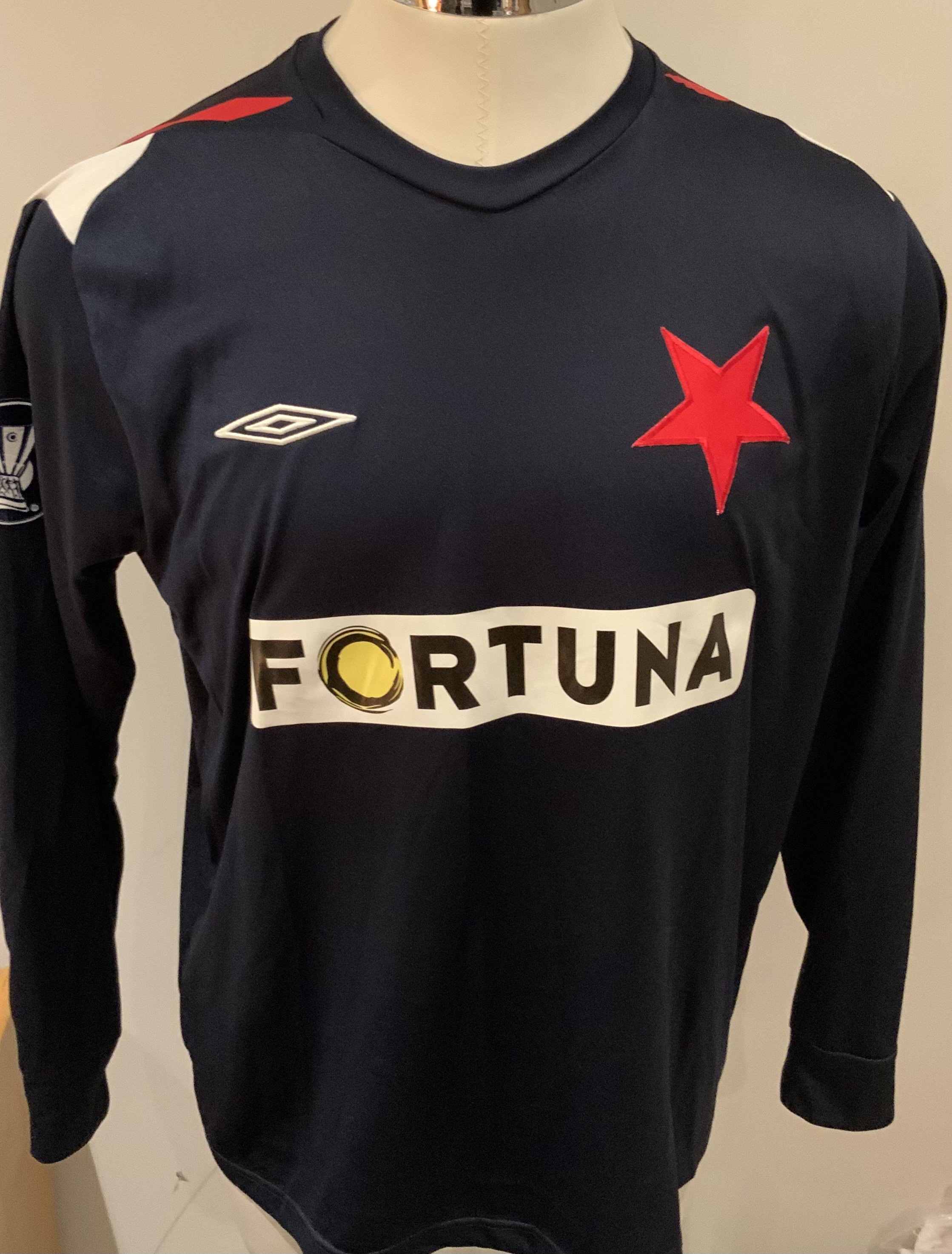 Slavia Prague 2007 - 2008 Match Worn Football Shirt: Black long sleeve shirt with Europa League badging to sleeves. Pudil 16 to rear. Worn during the 1-1 draw against Tottenham on 21 February 2008. Player played the whole match and was also booked.