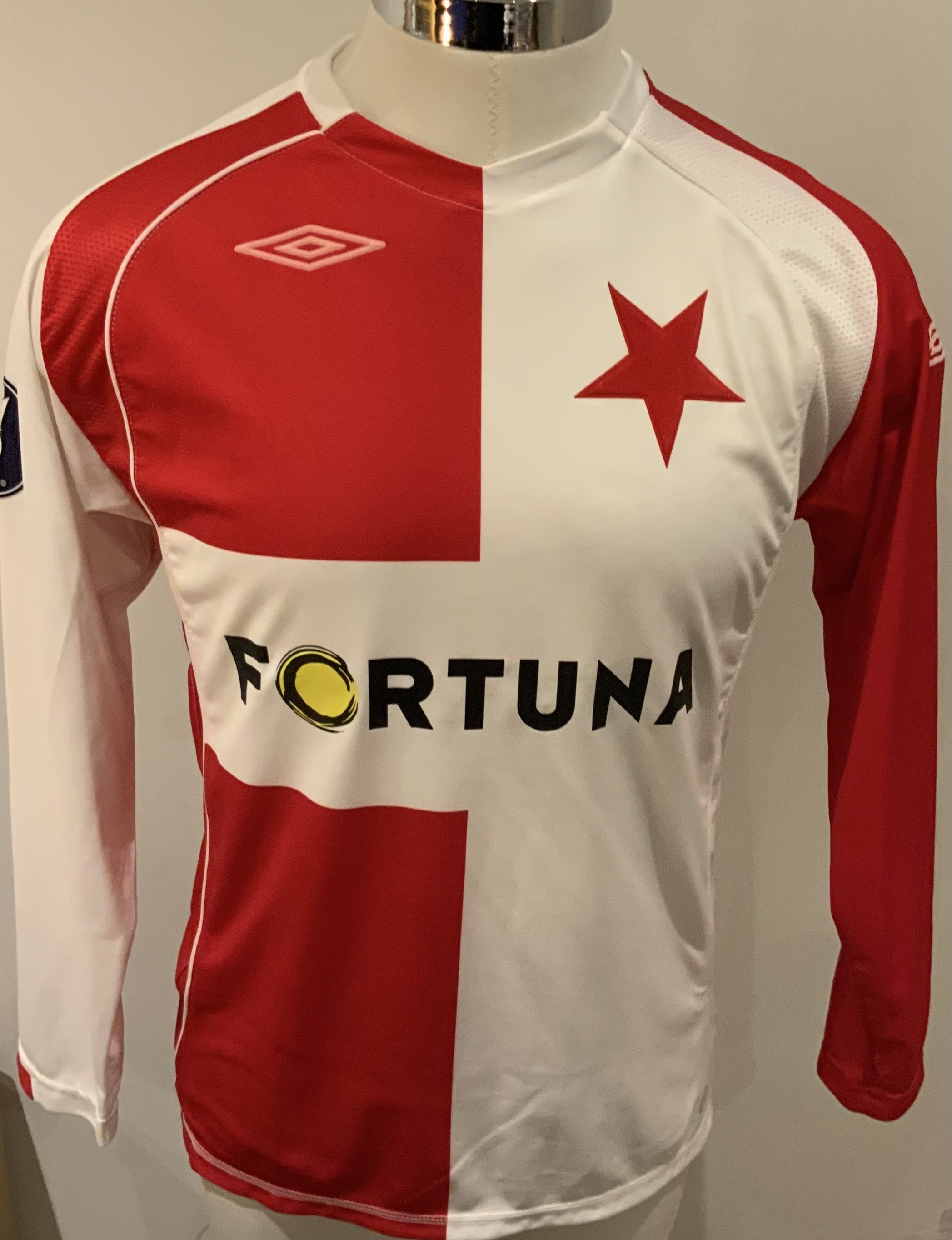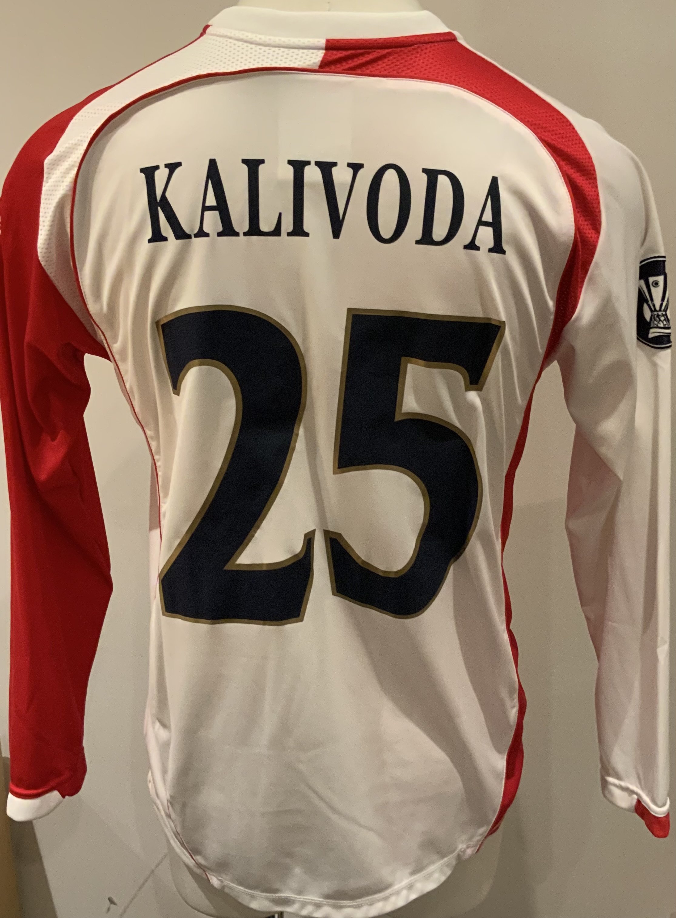Slavia Prague 2007 - 2008 Match Worn Football Shirt: Red and white long sleeve shirt with Europa League badging to sleeves. Kalivoda 25 to rear. Worn v Tottenham on 14 February 2008. Player was a second half substitute.