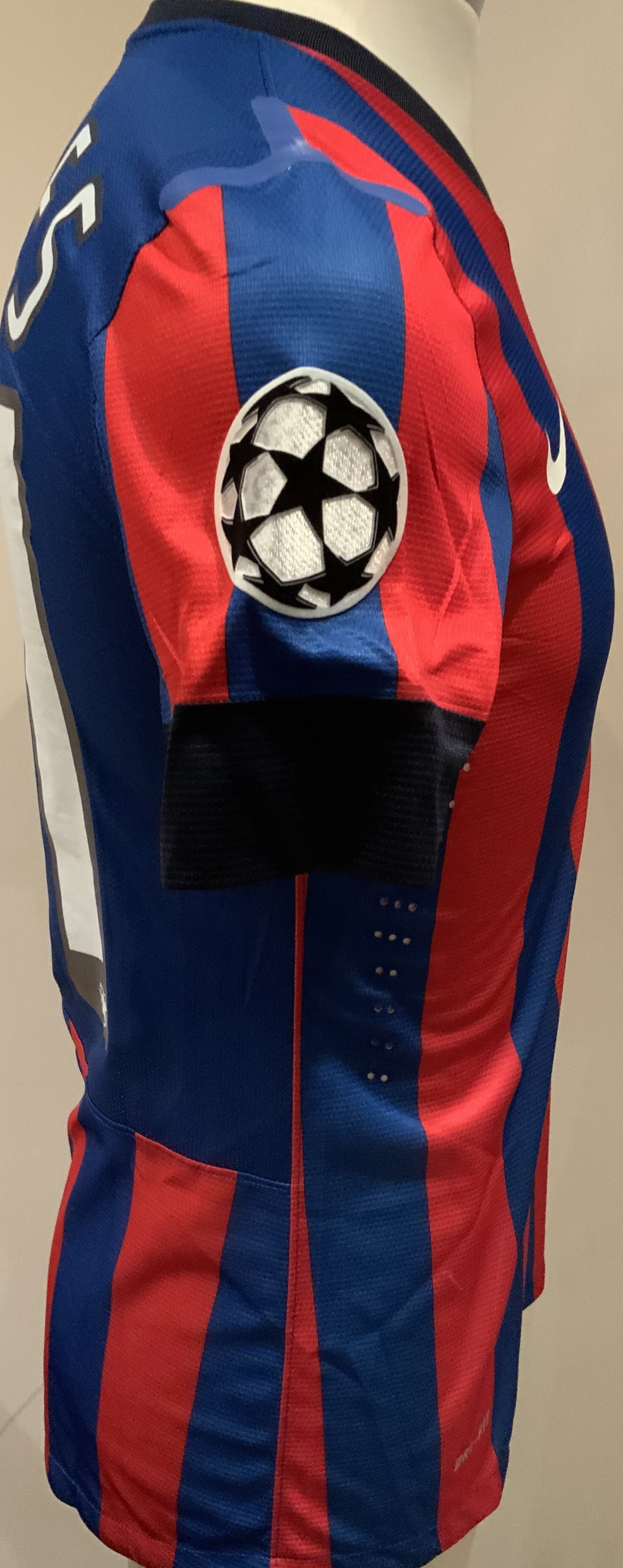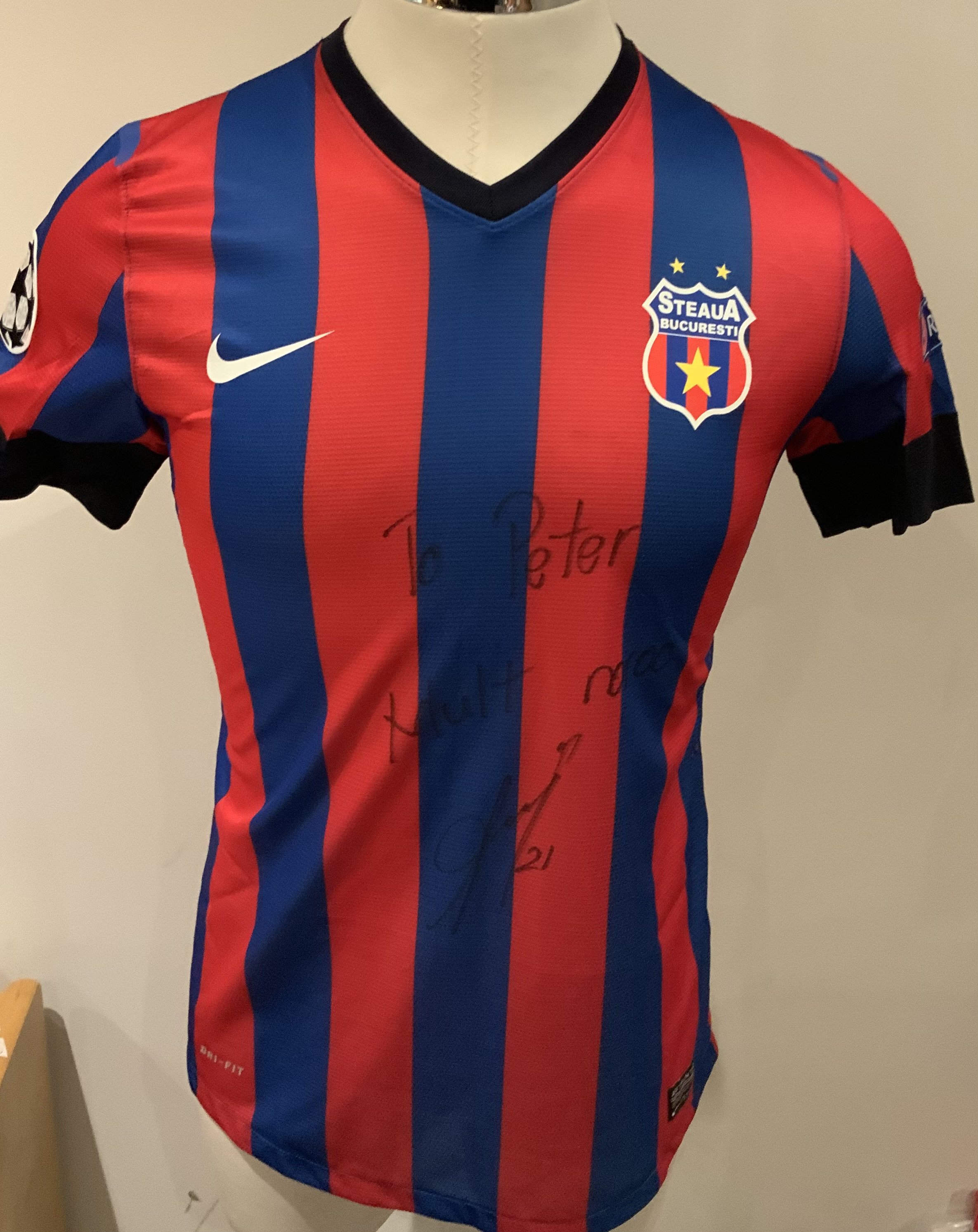 Steaua Bucharest 2013 - 2014 Match Worn Football Shirt: Blue and red short sleeve shirt with Champions League badging to sleeves. Chiriches 21 to rear. Worn during the qualifying campaign. Signed by the player with a dedication.