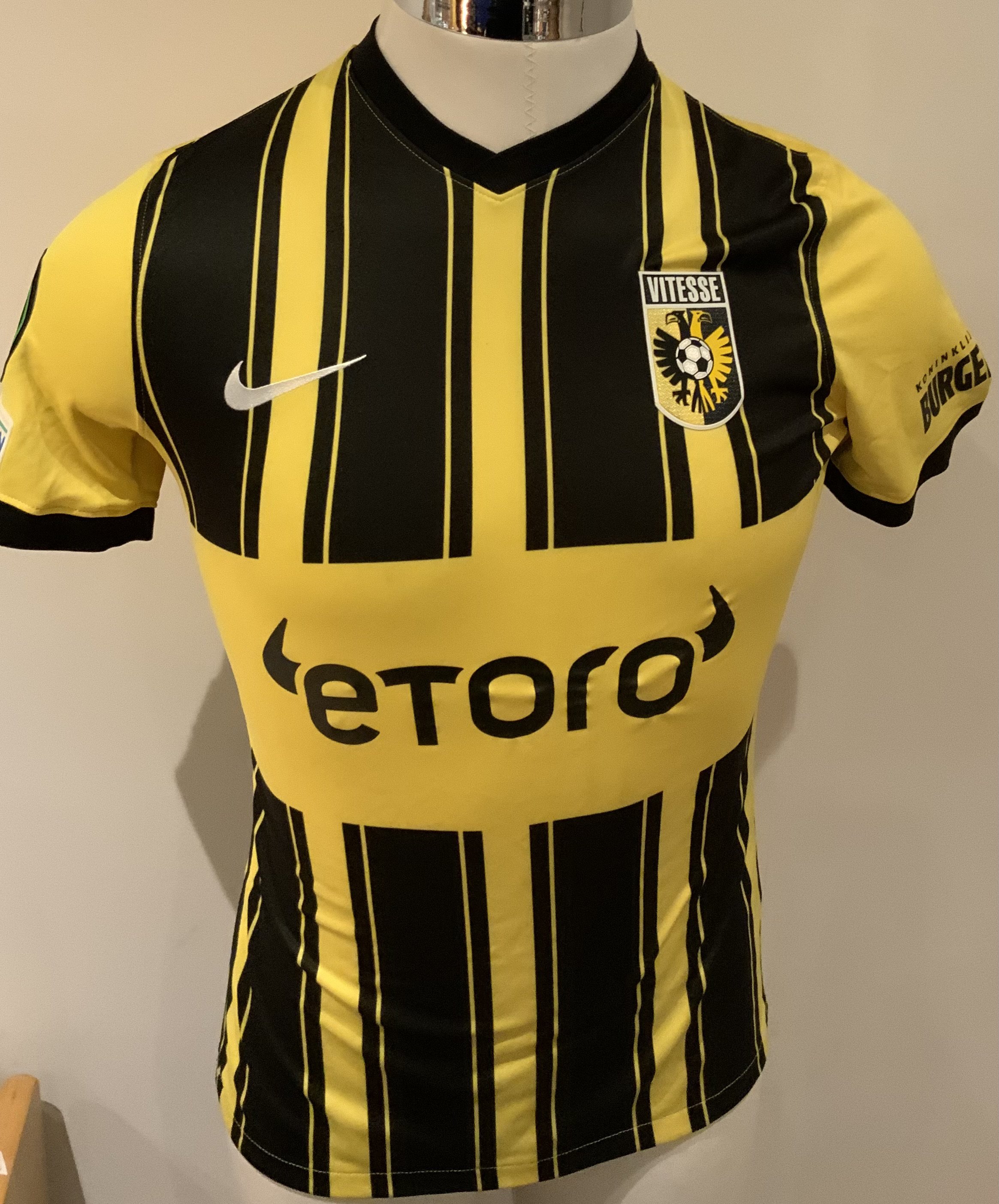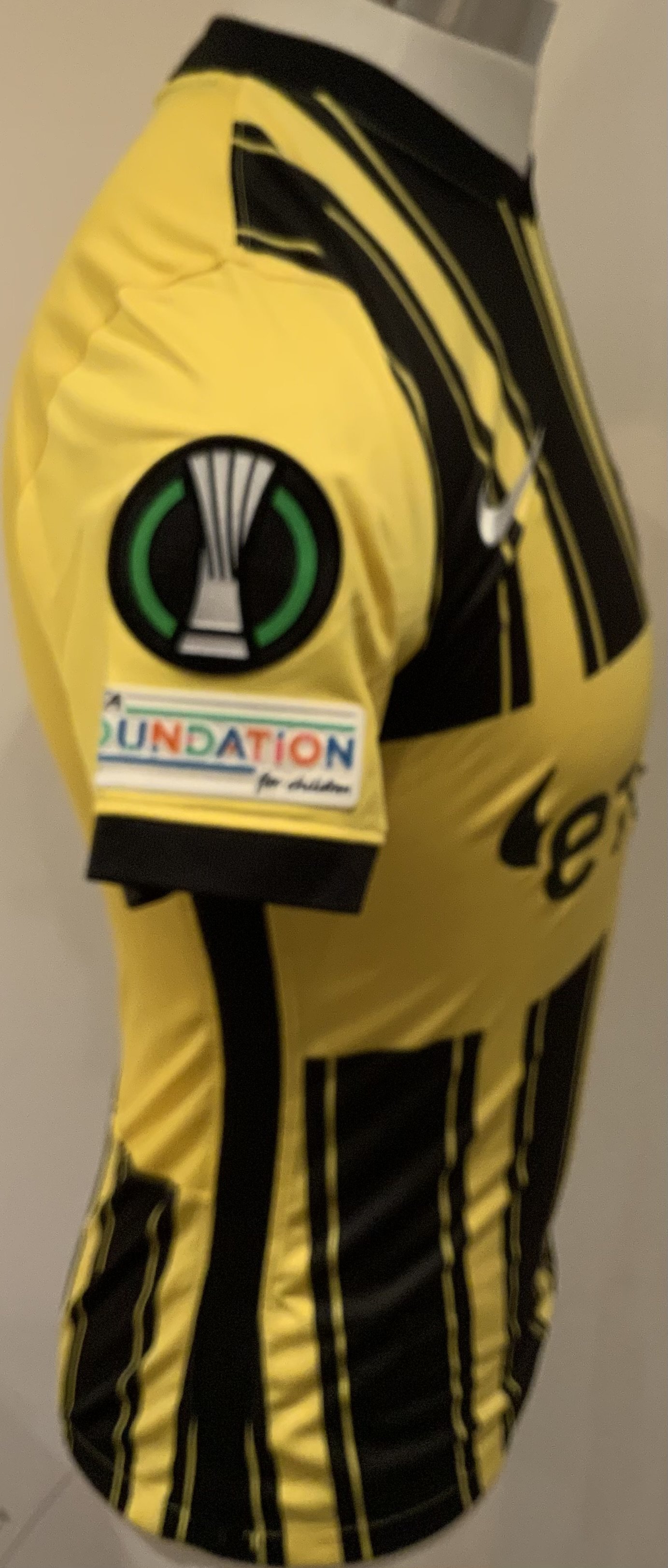 Vitesse Arnhem 2021 - 2022 Match Prepared Football Shirt: Yellow and black short sleeve shirt with Europa League badging to sleeves. Gong 17 to rear. Prepared for the 1-0 win against Tottenham on 21 October 2021.