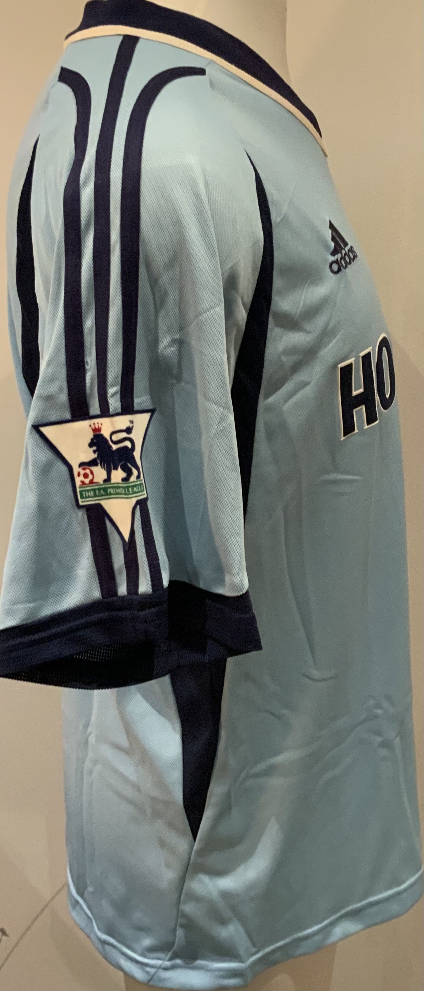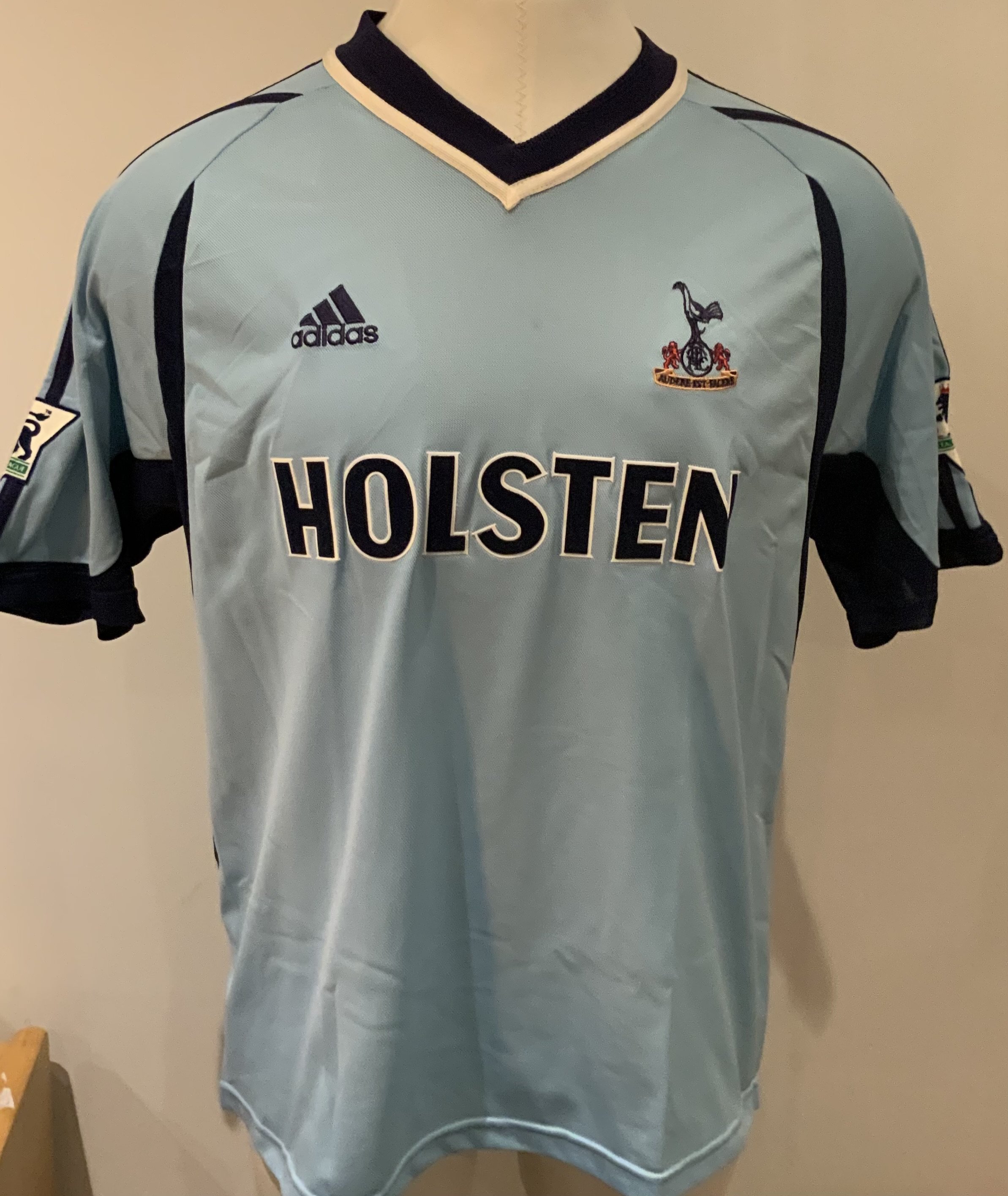Tottenham 2001 - 2002 Match Worn Football Shirt: Blue away short sleeve shirt with Premier League badging to sleeves Number 2 Carr to rear. Shirt is signed to rear by the player.