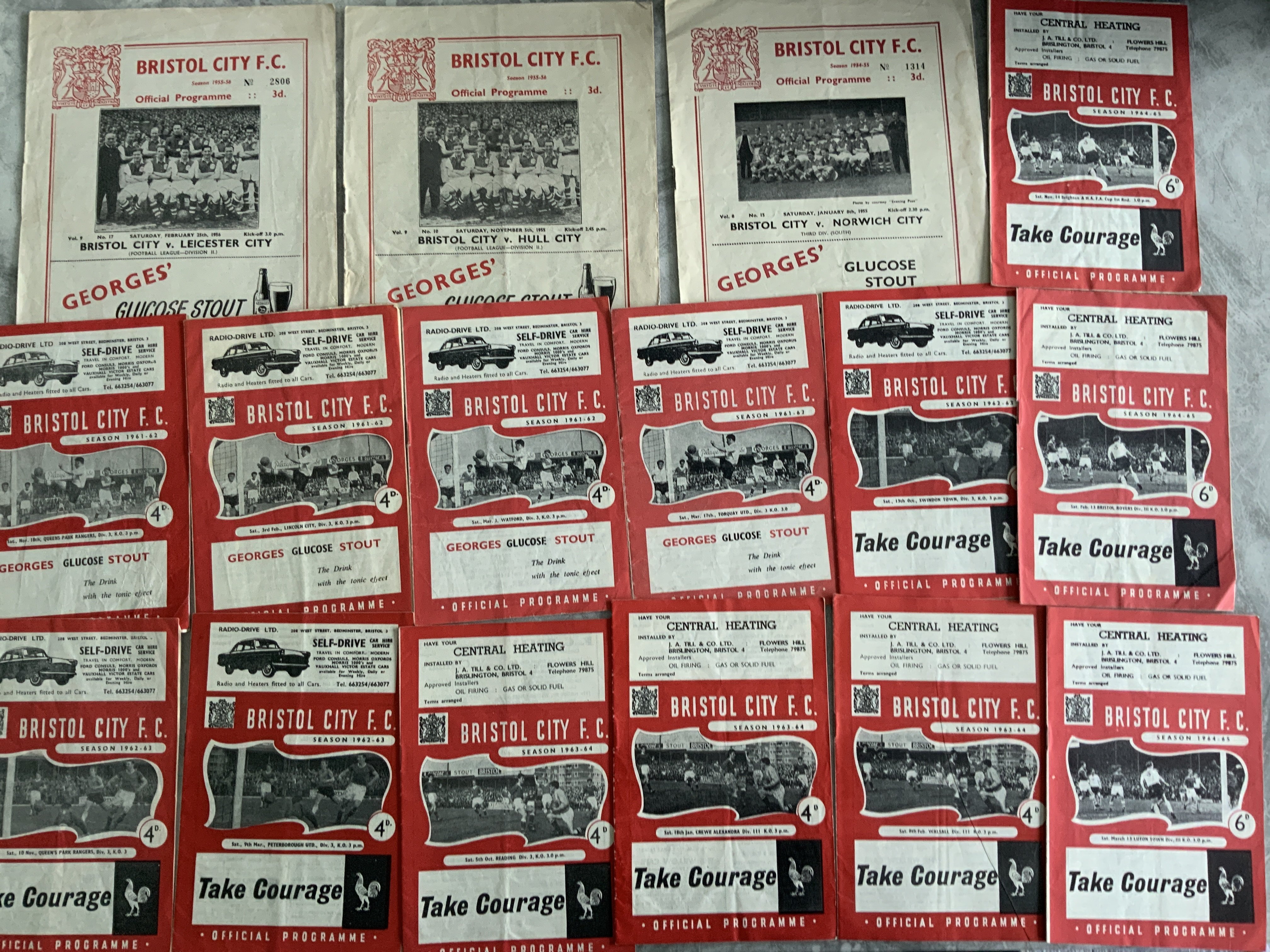 Bristol City Home Football Programmes: 54/55 Norwich, 55/56 Hull, Leicester then a further 13 from the early 60s. Mainly good.with instructions to sell. (16)
