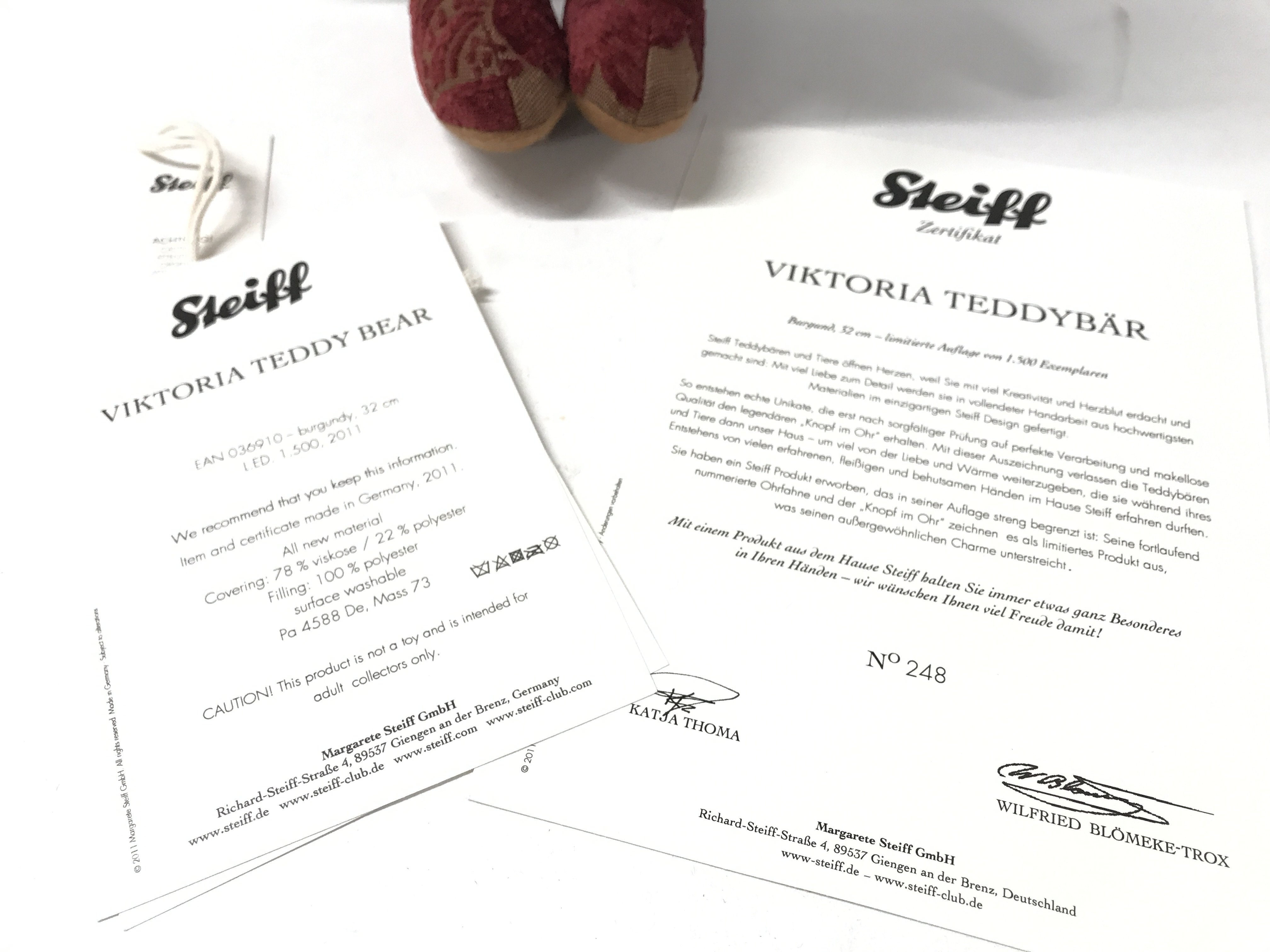 A Boxed Steiff Viktoria Teddy Bear. 2011. With Certificate.