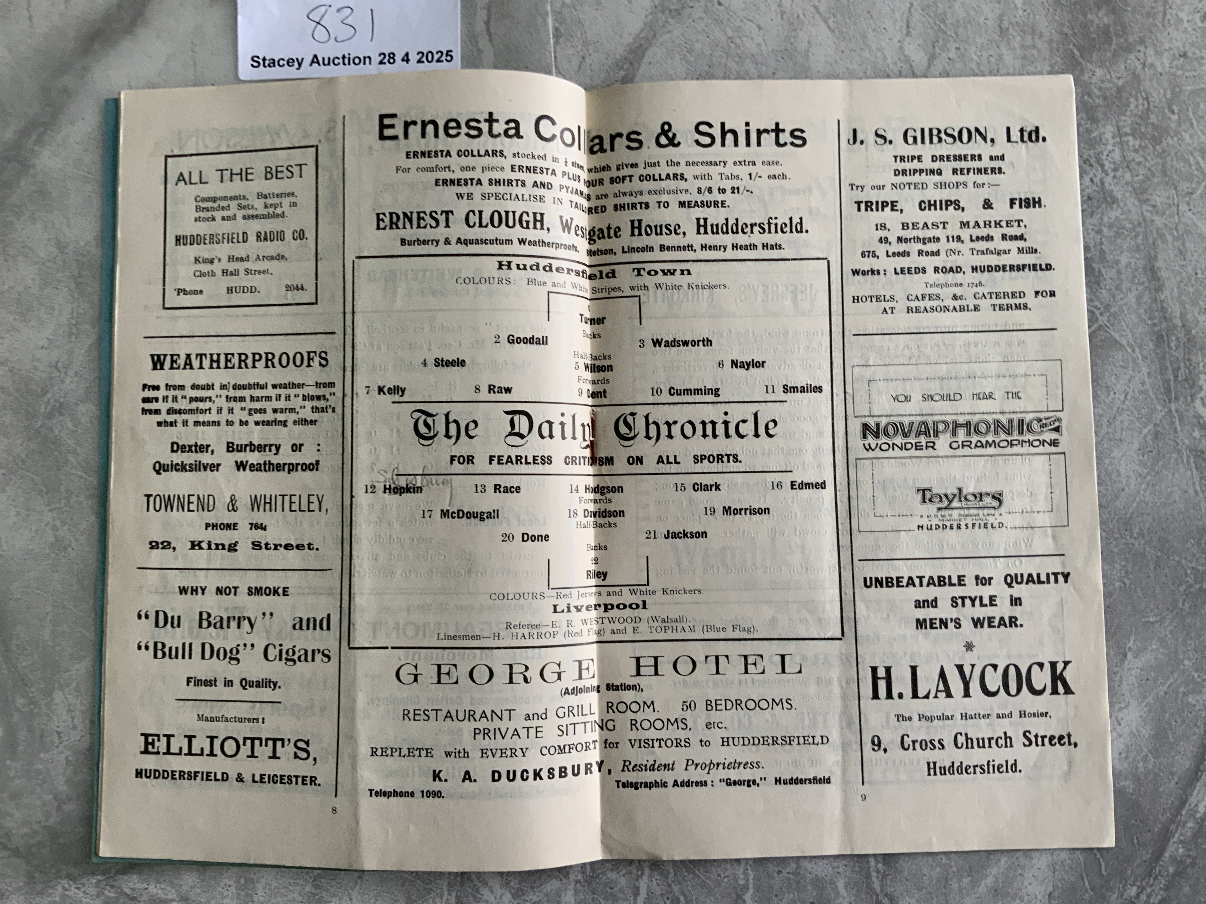 28/29 Huddersfield Town v Liverpool Football Programme: Very good condition programme dated 10 4 1929 with no team changes. We are not sure if this is a friendly or a re arranged first division fixture which is more likely.