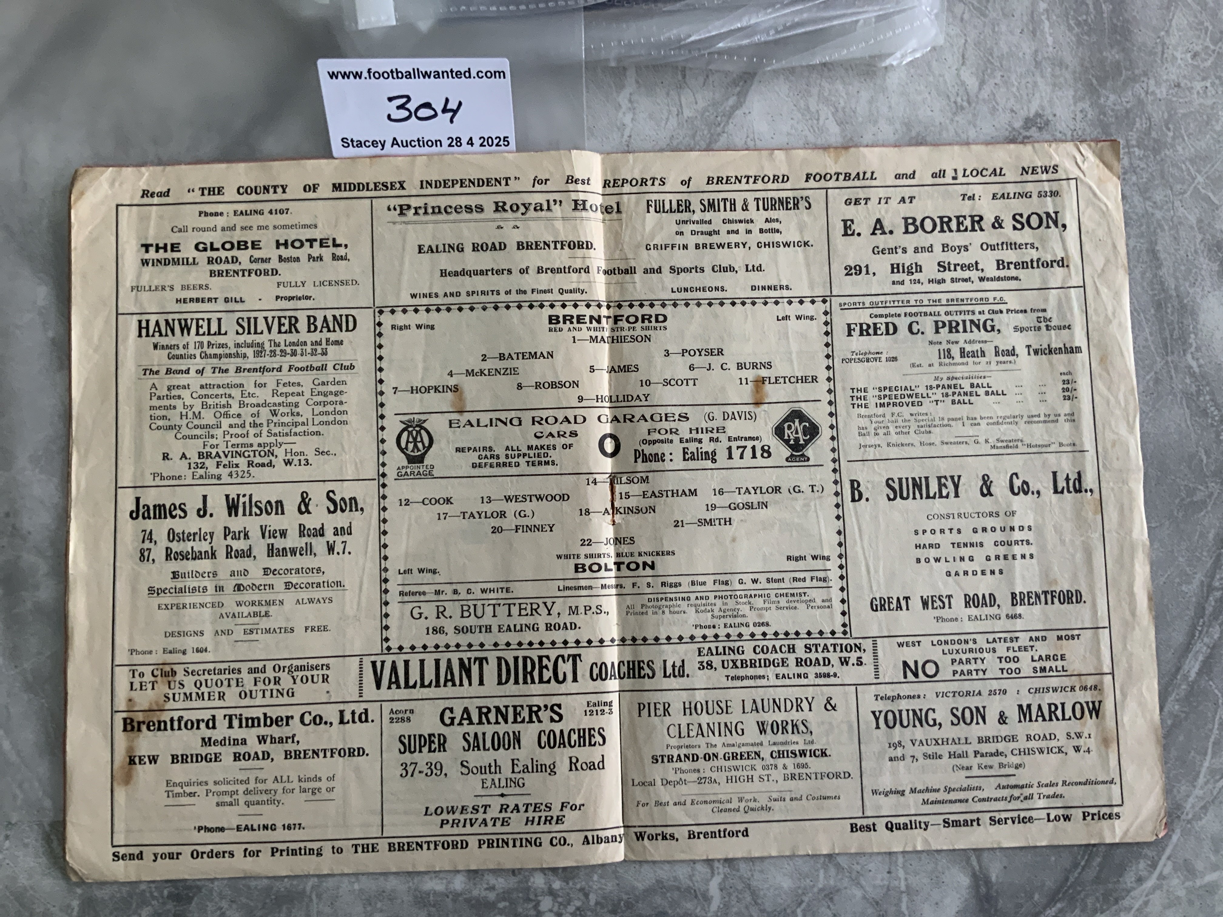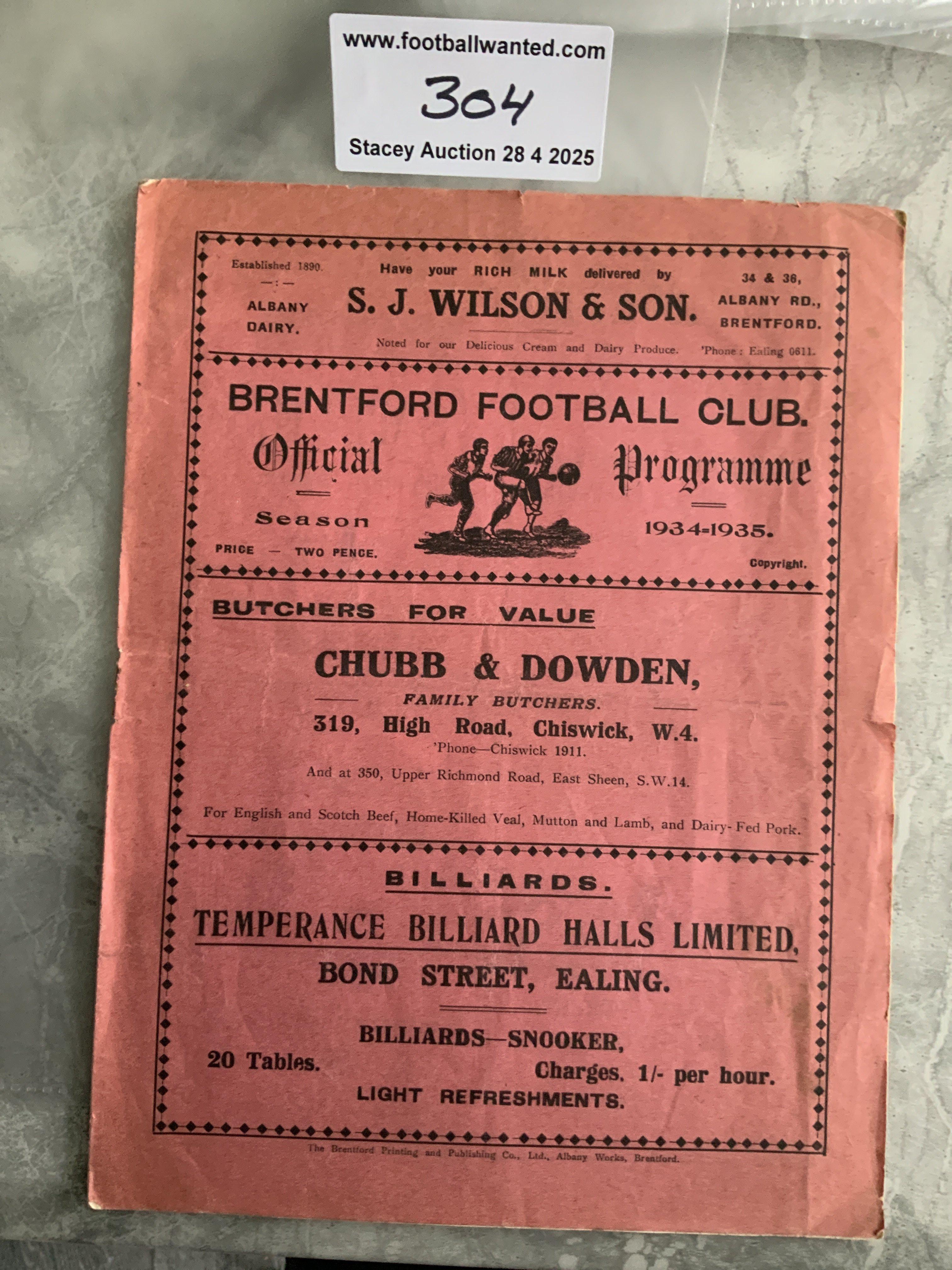 34/35 Brentford v Bolton Football Programme: Fair/good condition Division Two programme with no team changes. Staple removed not rotted away. Both teams promoted this season.