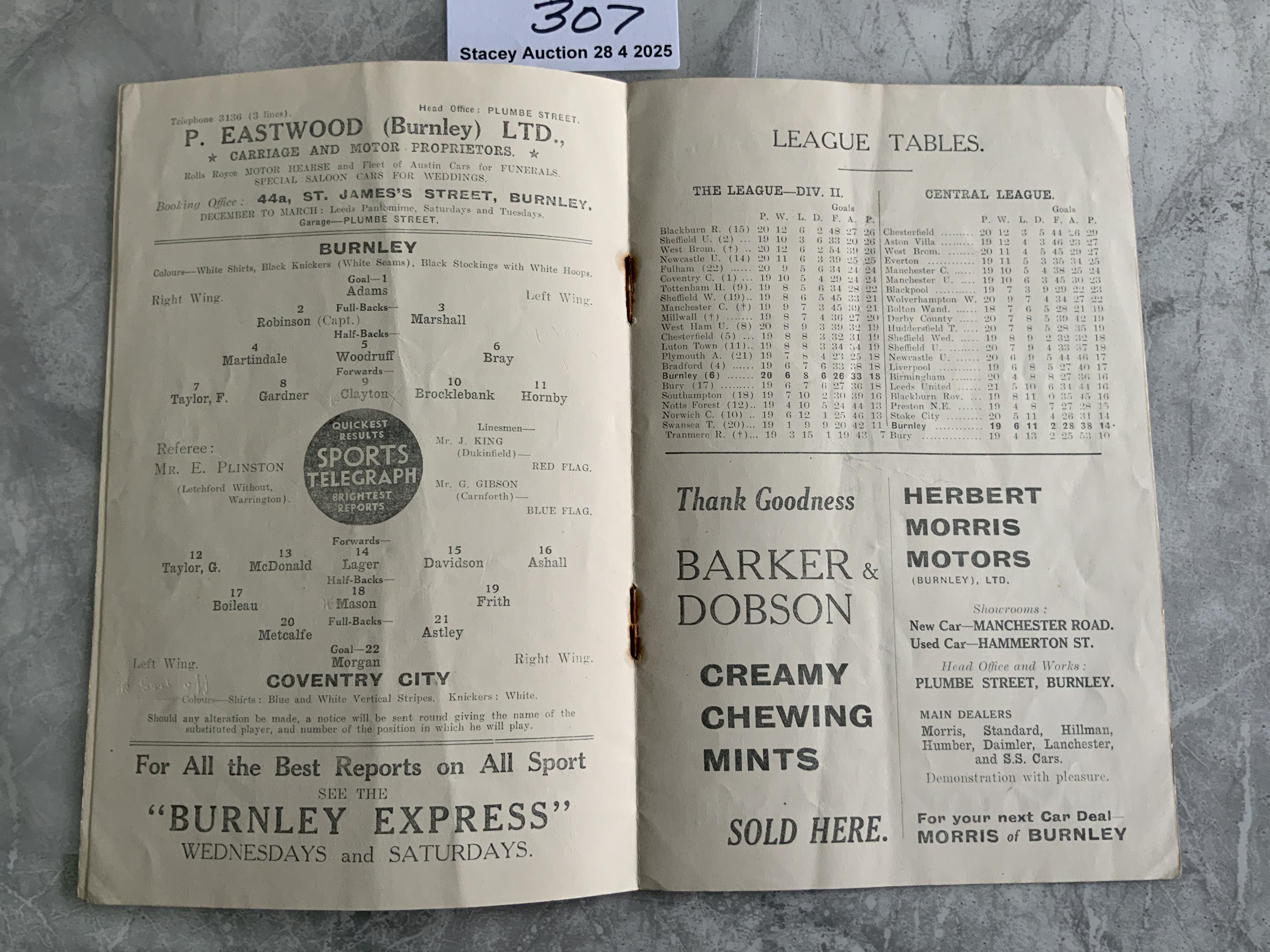 38/39 Burnley v Coventry City Football Programme: Good condition Division Two programme with no team changes. Rusty staples holding firm.