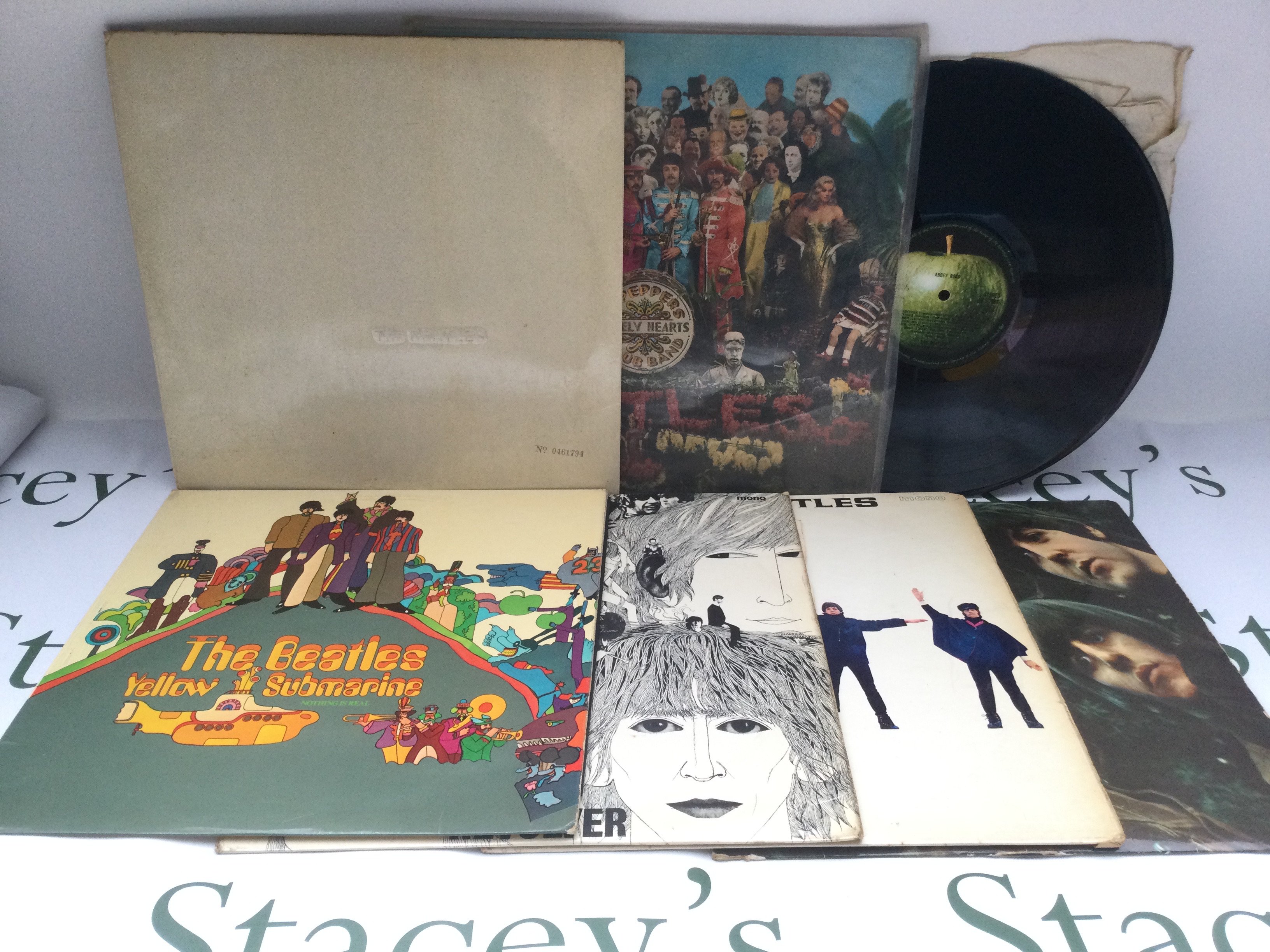 Seven early pressings of Beatles LPs comprising a numbered 'White Album' 0461794 and complete with all inserts, 'Sgt Pepper', a mono 'Revolver' and others. 'Abbey Road' is lacking it's cover.