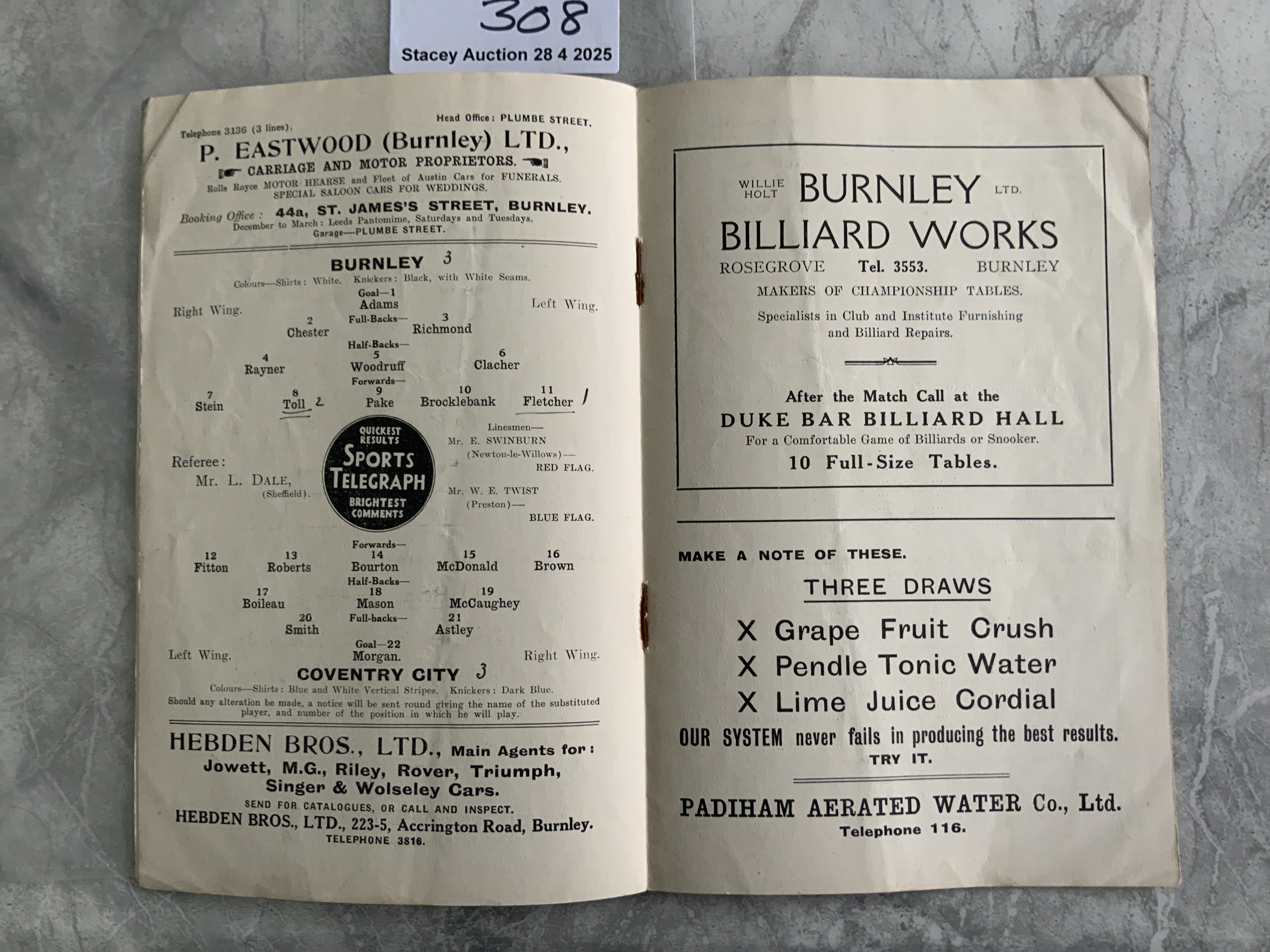 36/37 Burnley v Coventry City Football Programme: Good condition Division Two programme with no team changes. Rusty staples holding firm. Score and scorers noted on team page inside.
