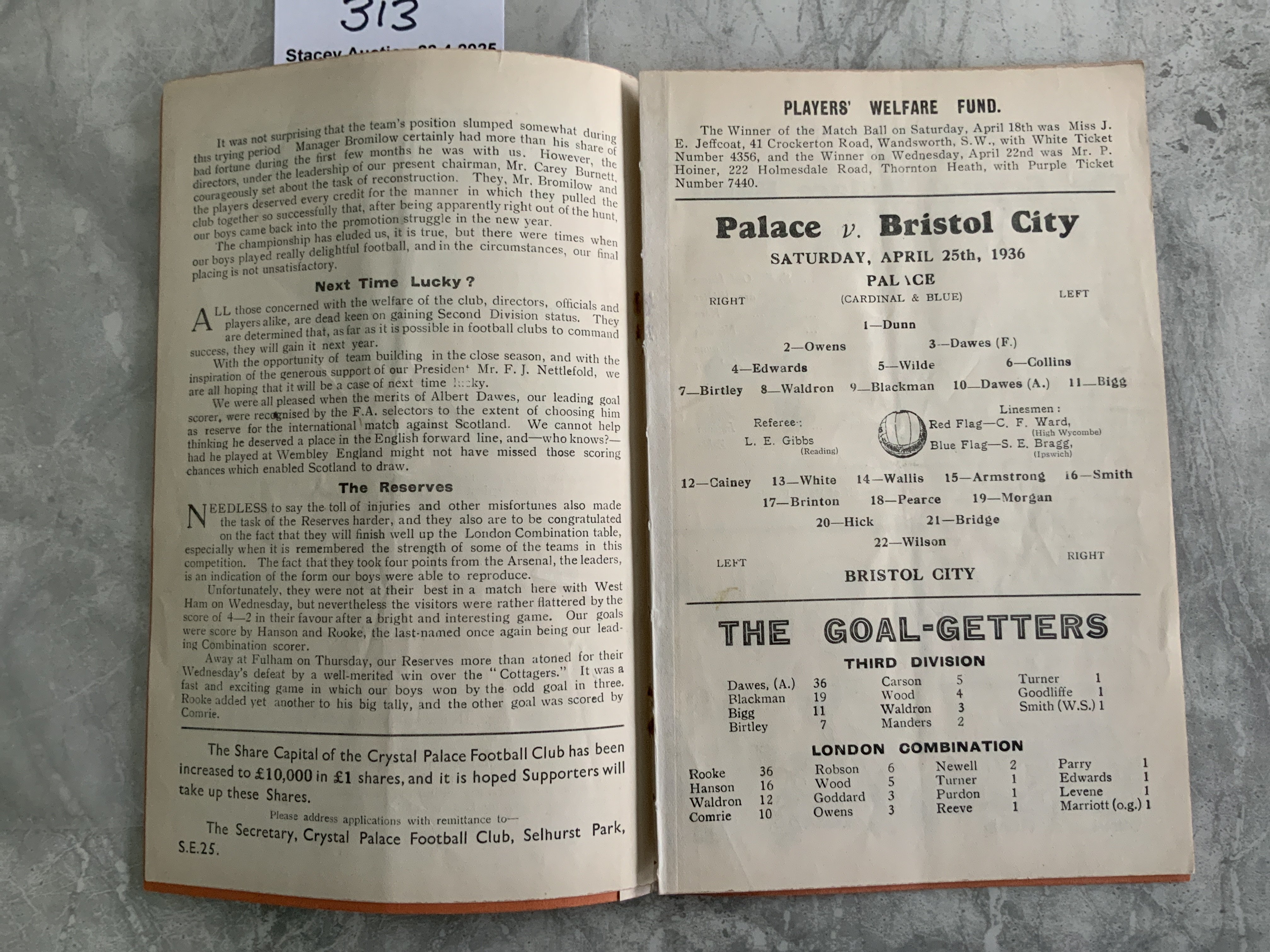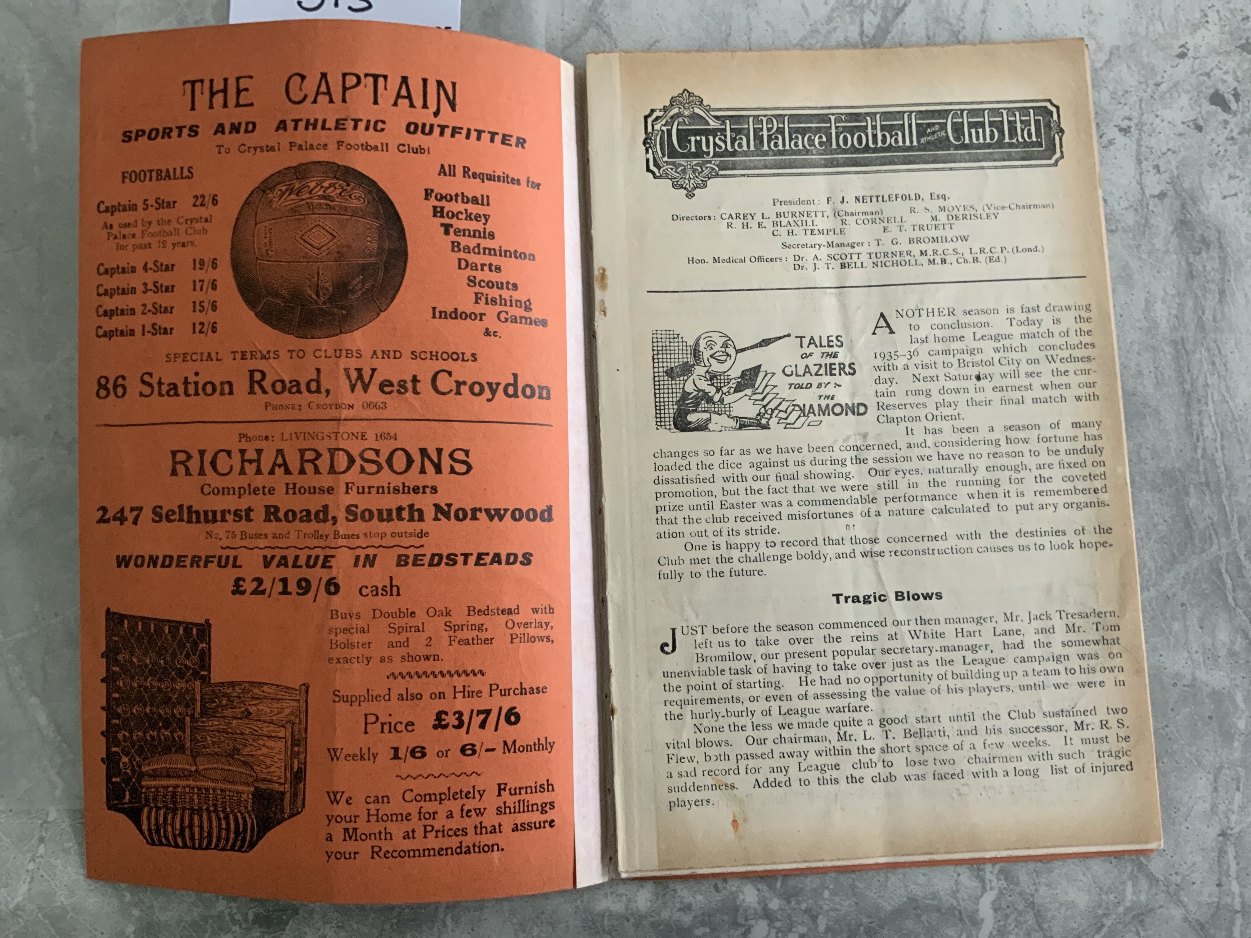 35/36 Crystal Palace v Bristol City Football Programme: Very good condition Division Three programme with no team changes. Inside of spine has a repair.