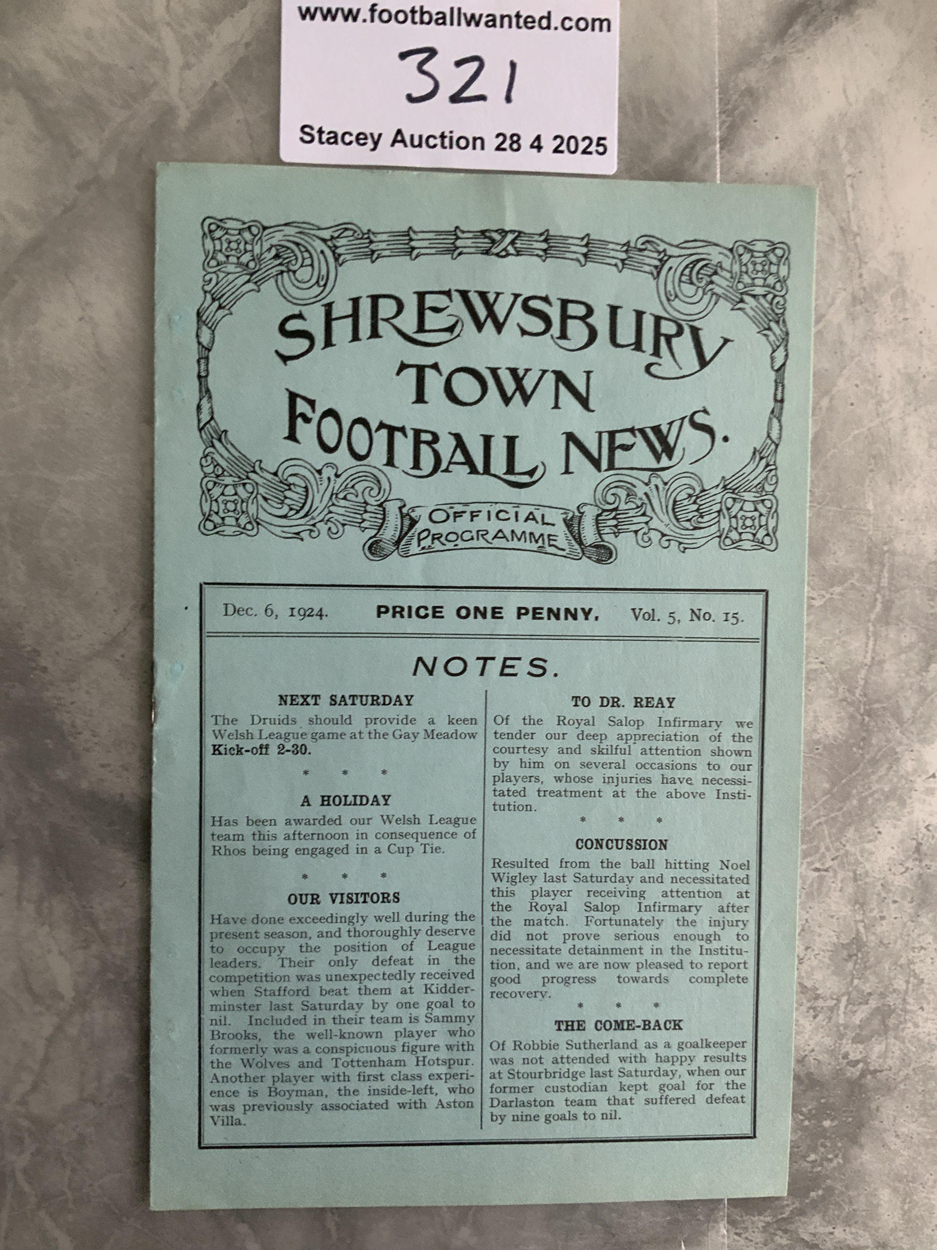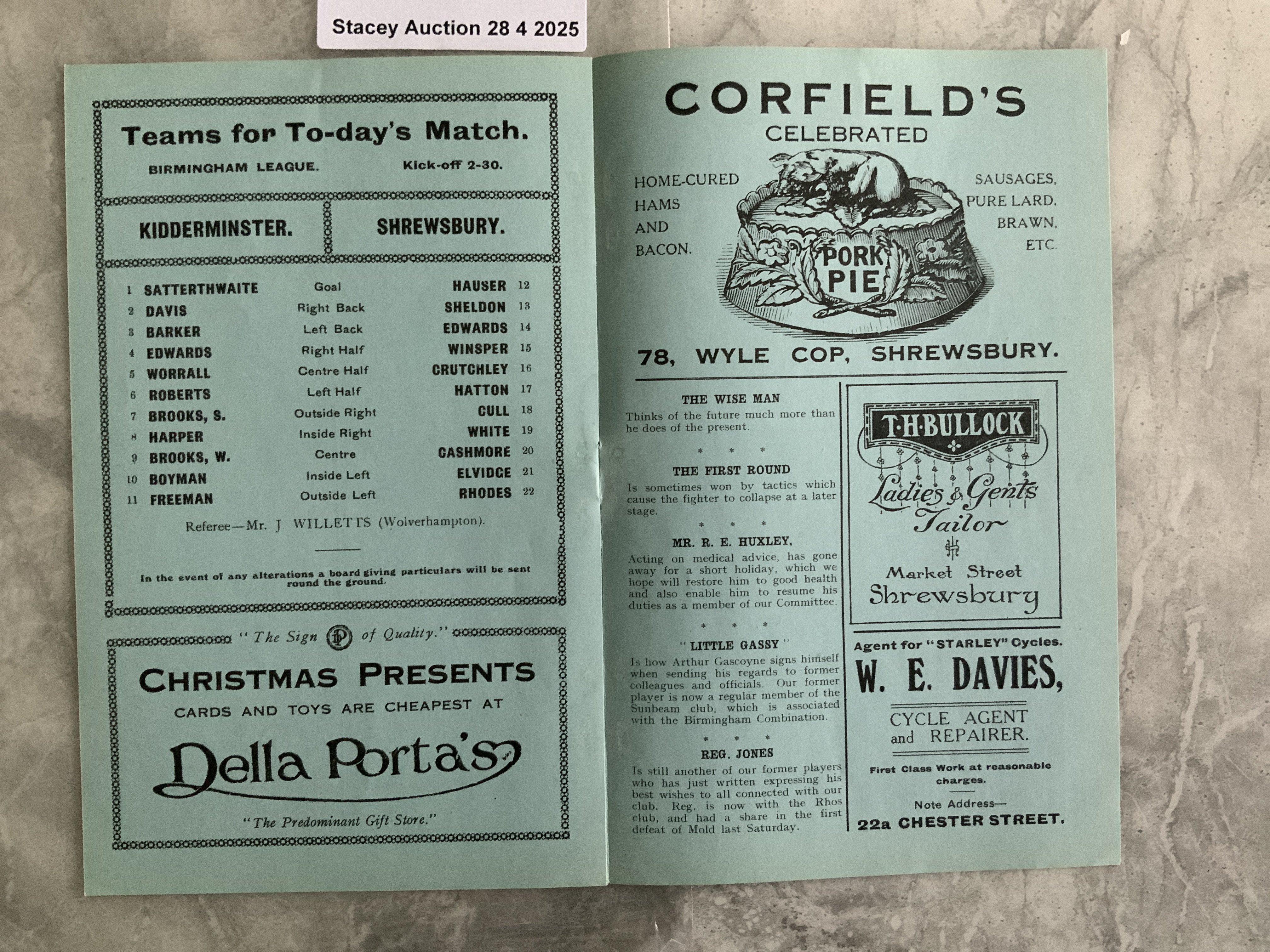 1924 - 1925 Shrewsbury Town v Kidderminster Football Programme: Excellent condition Birmingham League programme with no team changes.