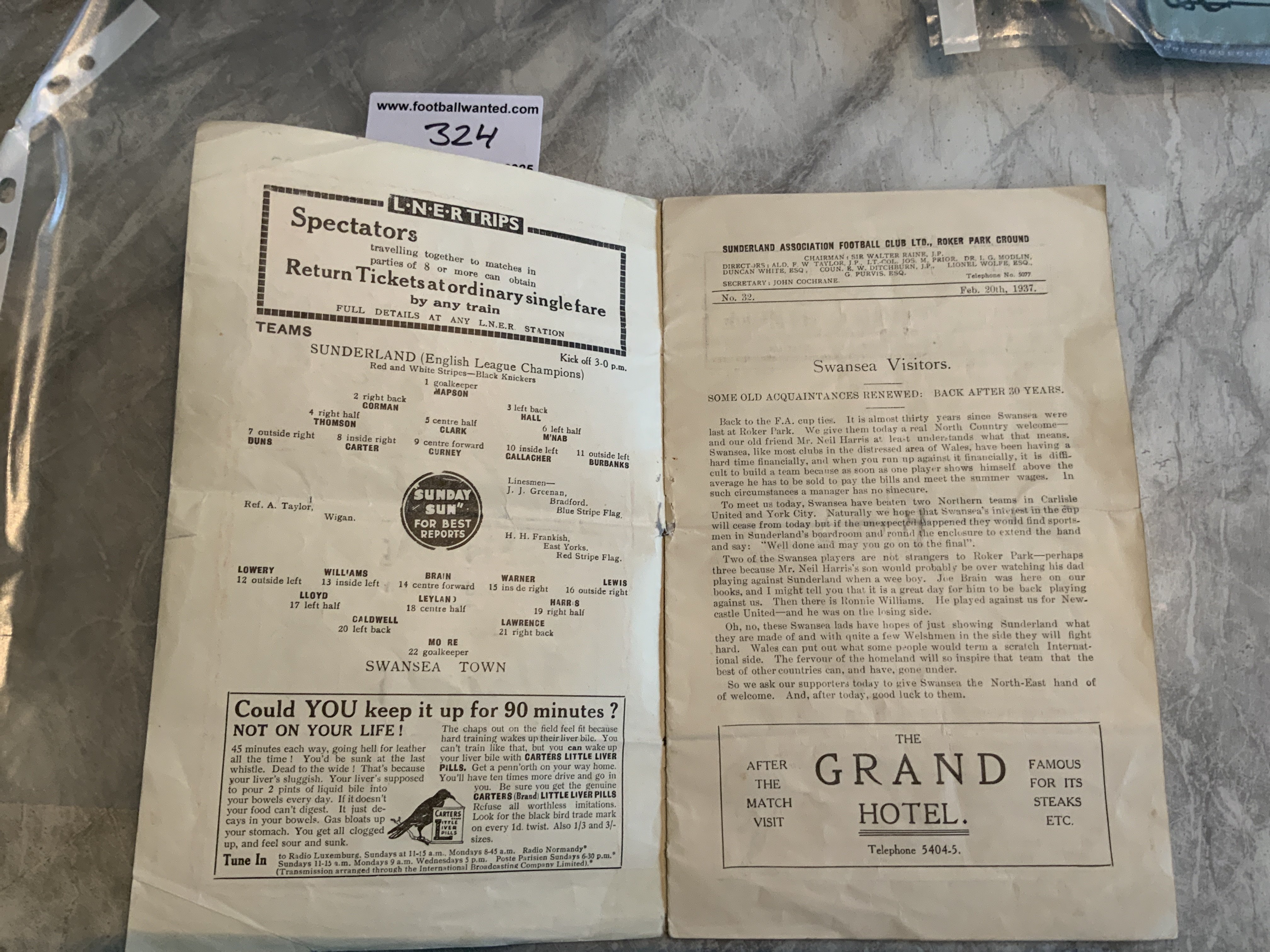 36/37 Sunderland v Swansea FA Cup Football Programme: Fair/good condition round 5 programme with no team changes. Small tear inside and handling marks. Sunderland went on to win the FA Cup.