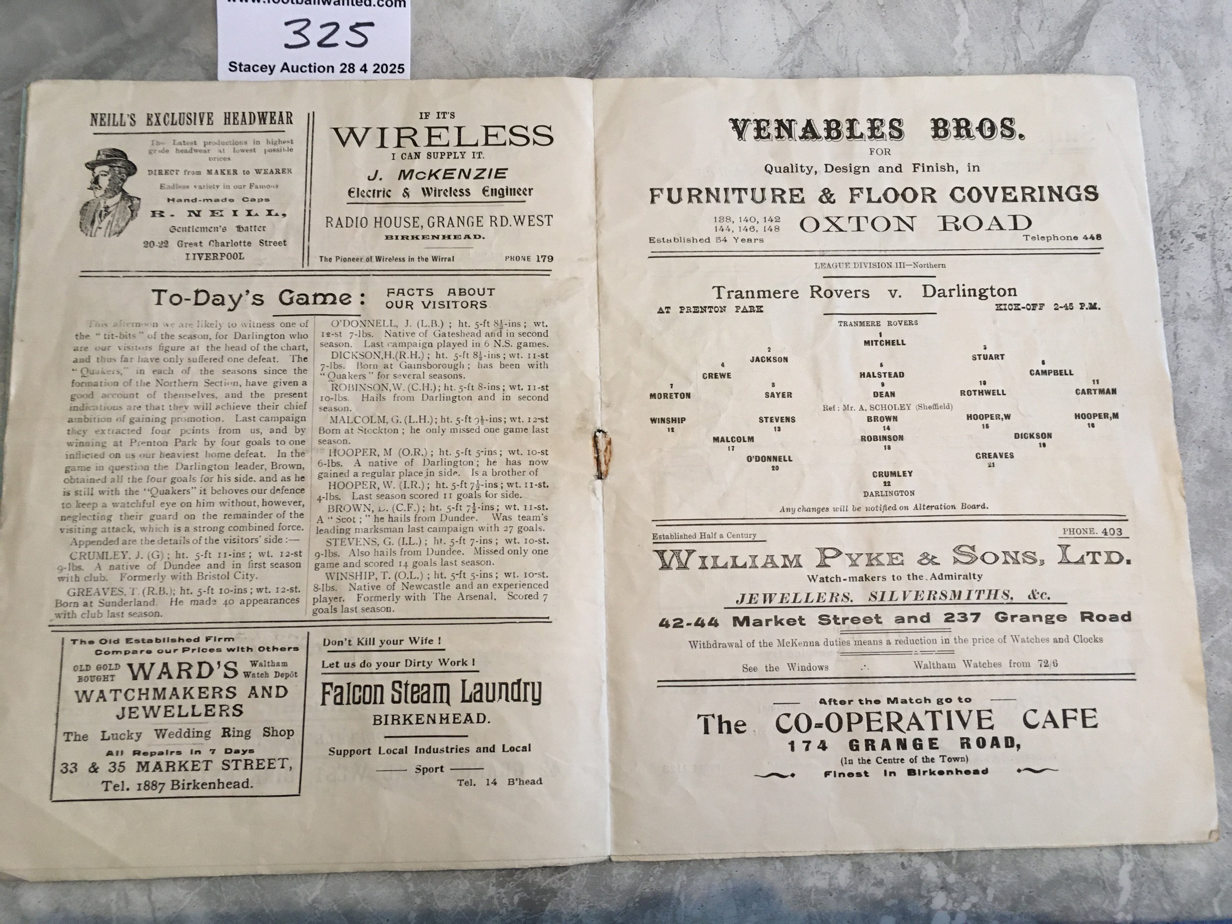 1924 - 1925 Tranmere Rovers v Darlington Football Programme: Good condition Division Three programme with no team changes. Darlington were champions this season.