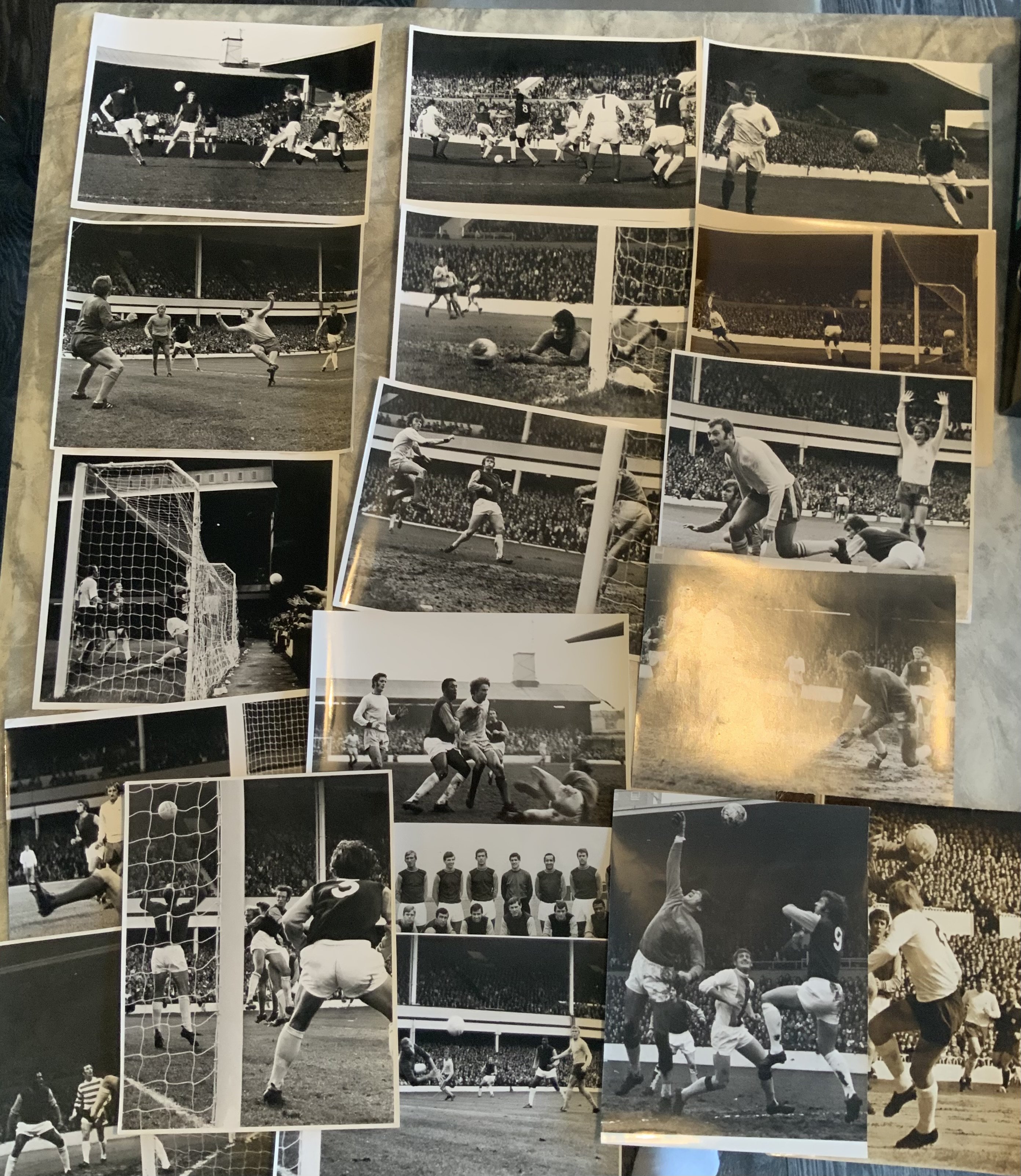 West Ham Football Press Photos: Original black and white press photos mainly from the 60s with a few early 70s. 18 are large and 6 are small all in good condition. Whilst these are press photos only around 6 have press stamps to rear. 22 are match action. (24)