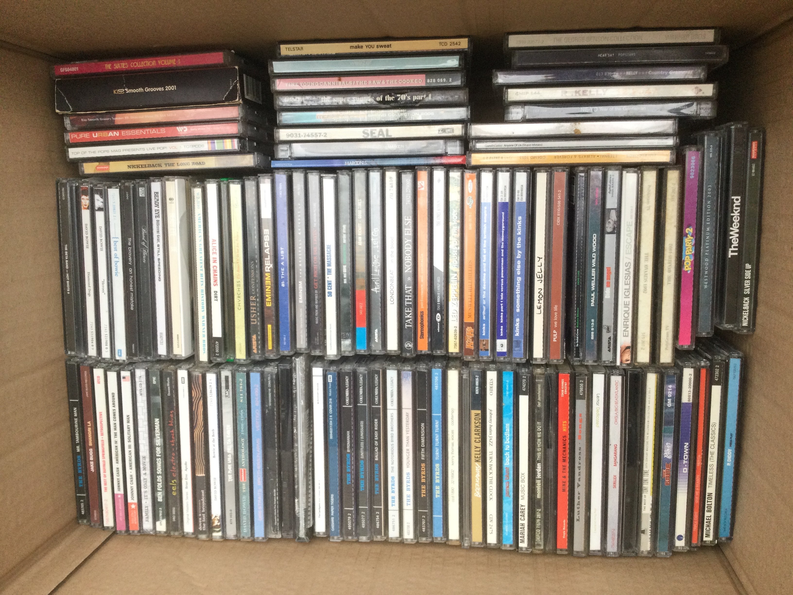 A box of CDs by various artists including David Bowie, The Pixies, Supergrass, Kings Of Leon and many more.